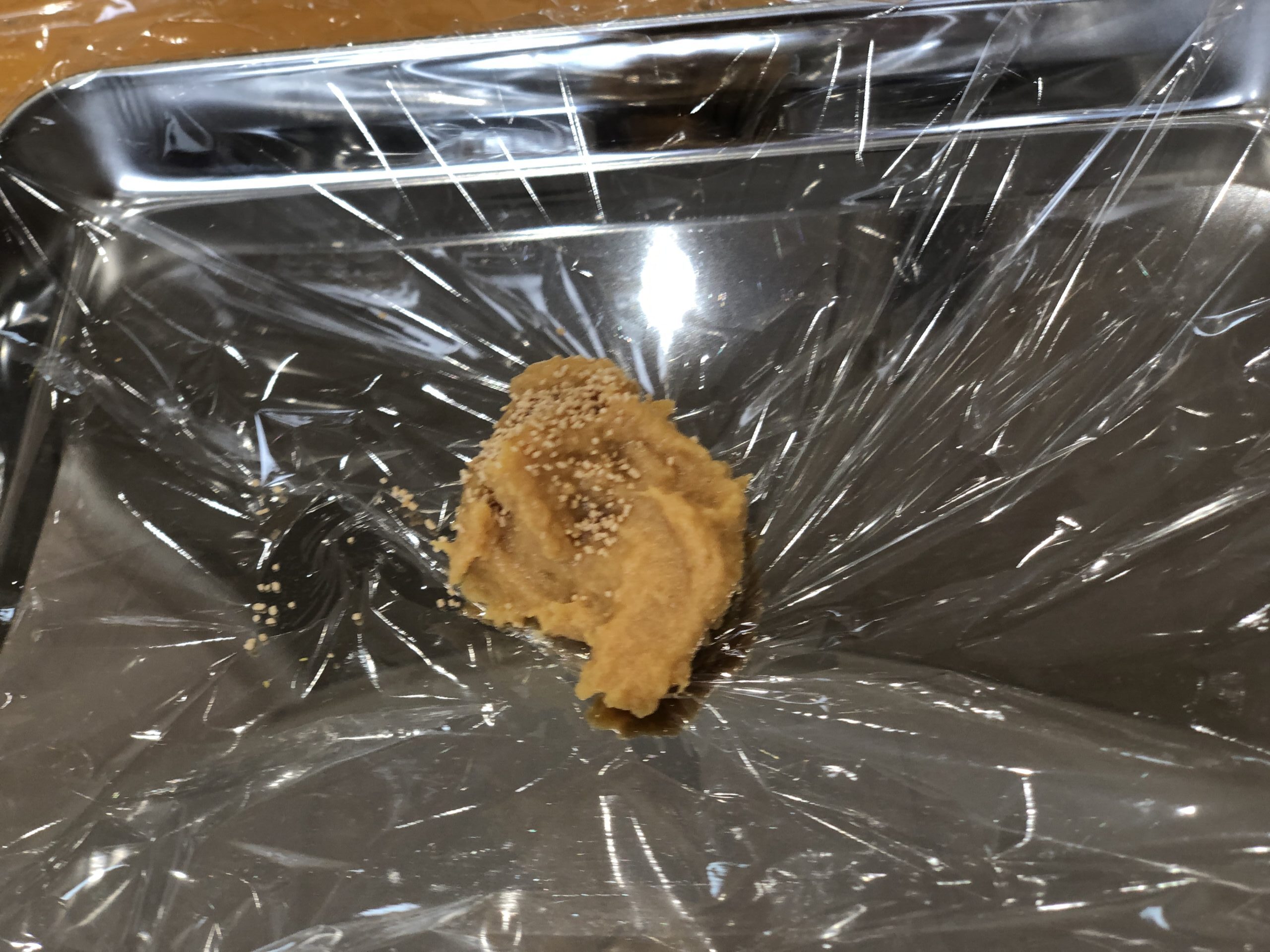 小さな手で一生懸命まぜた味噌玉を、ラップで包んでギュッ。