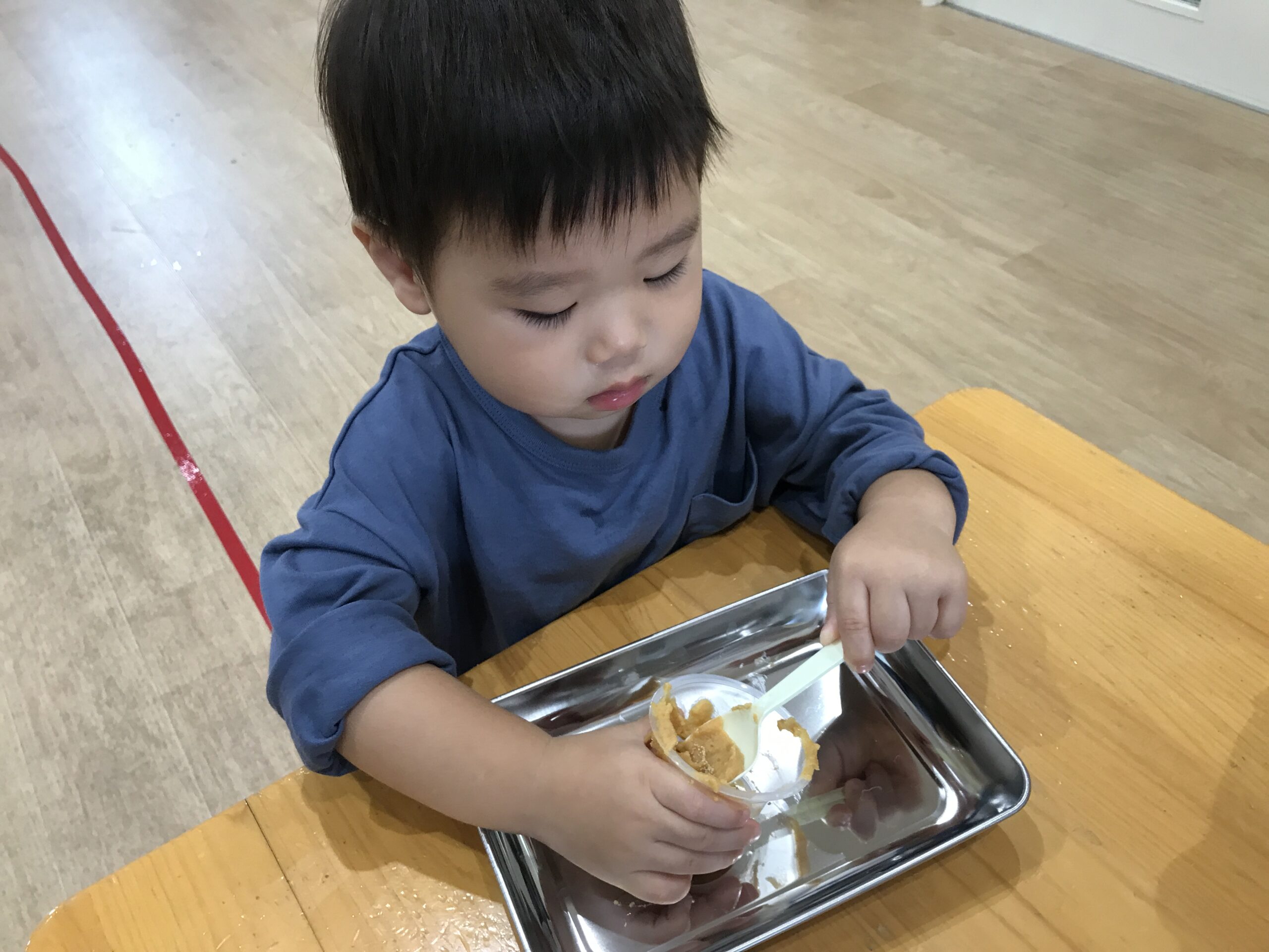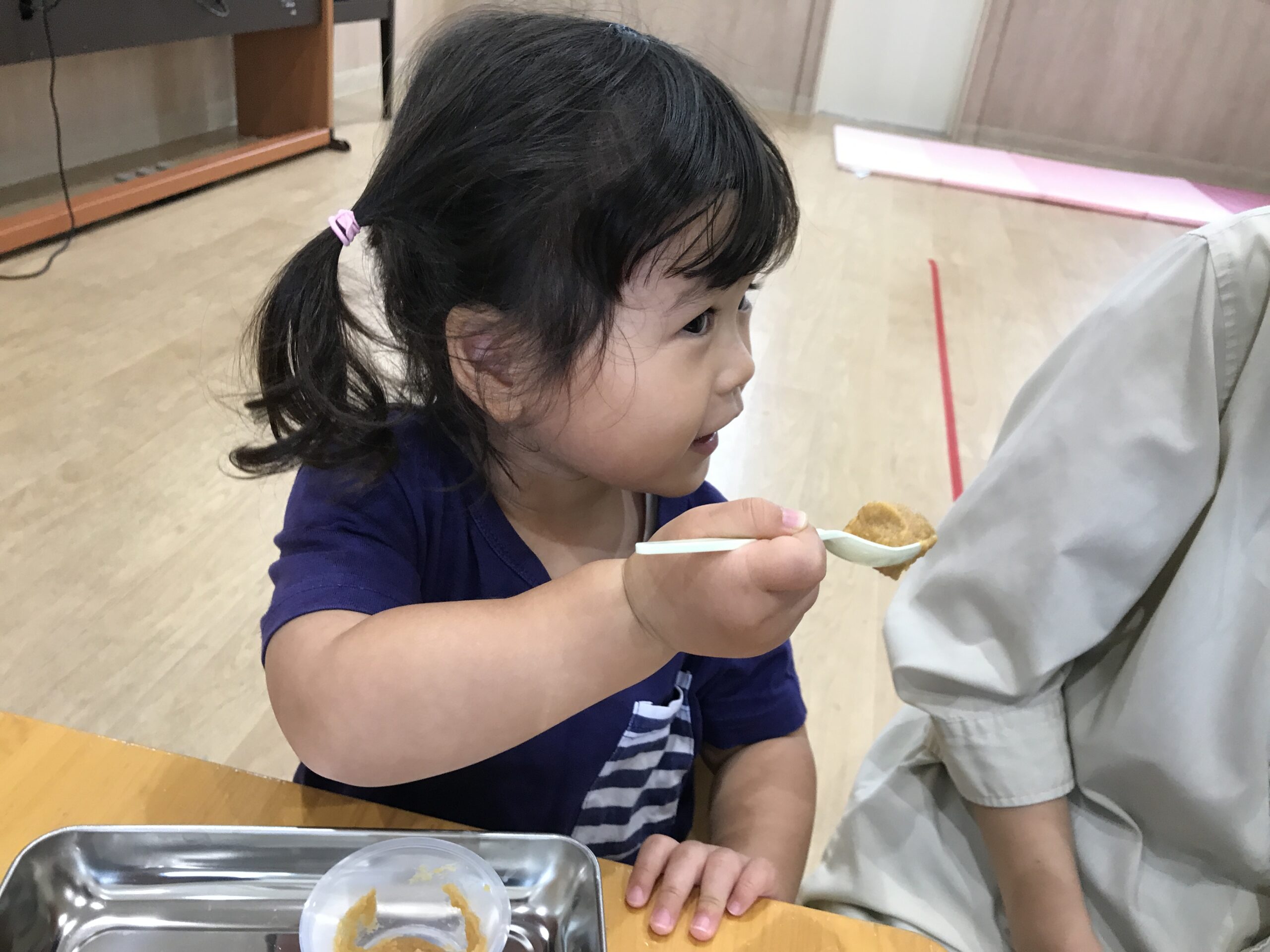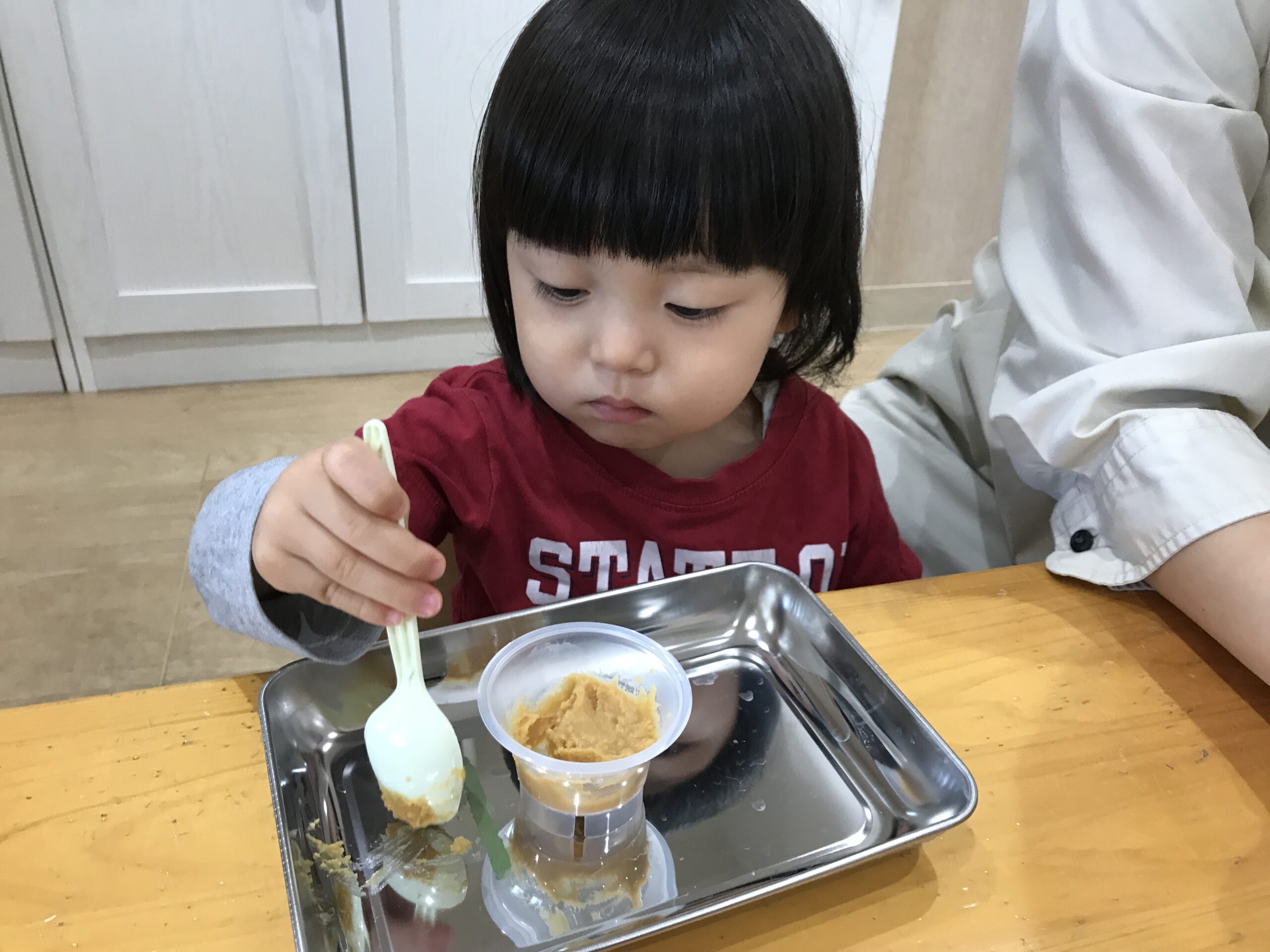 0歳児さんも真似して、指でそっと味噌をつんつん。