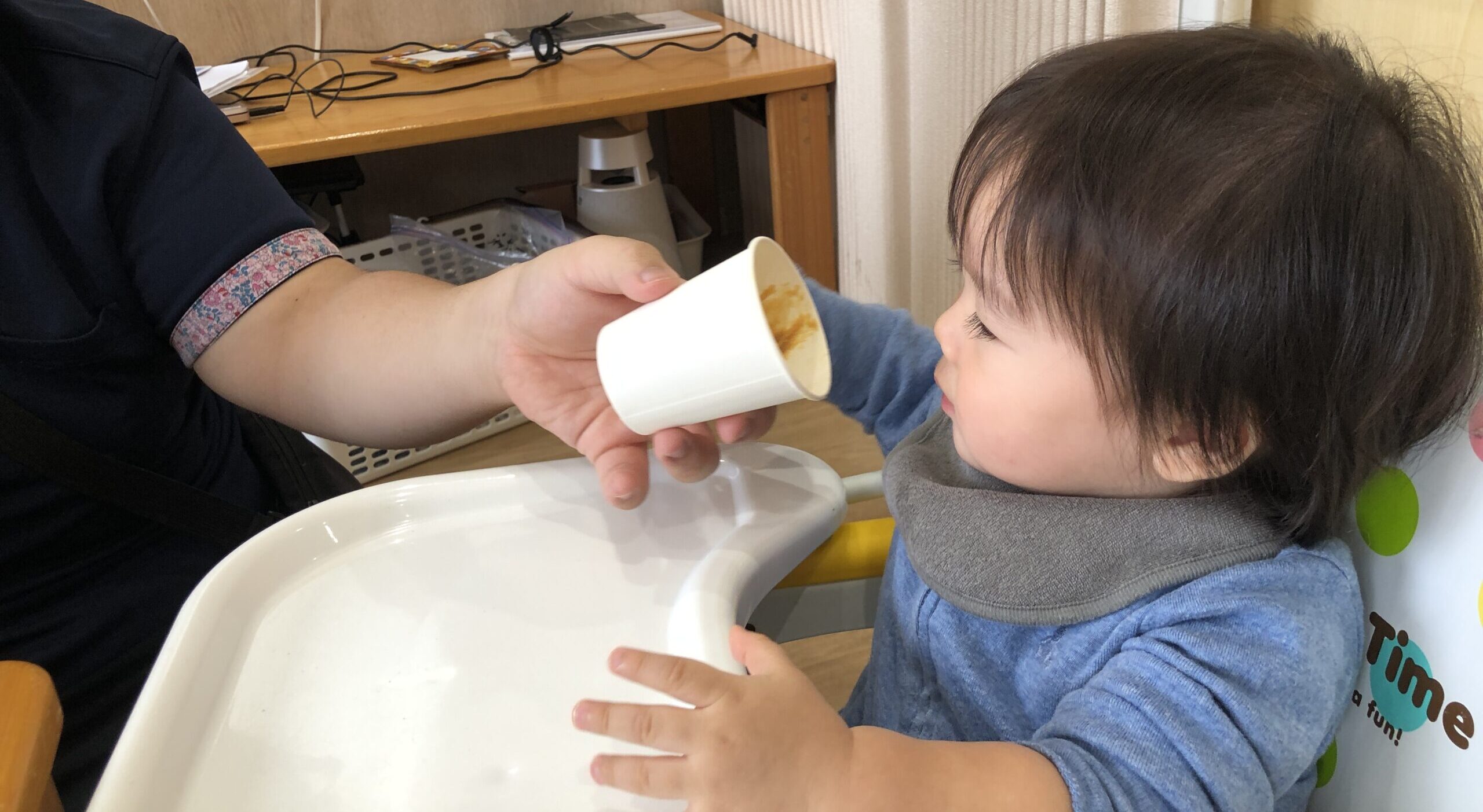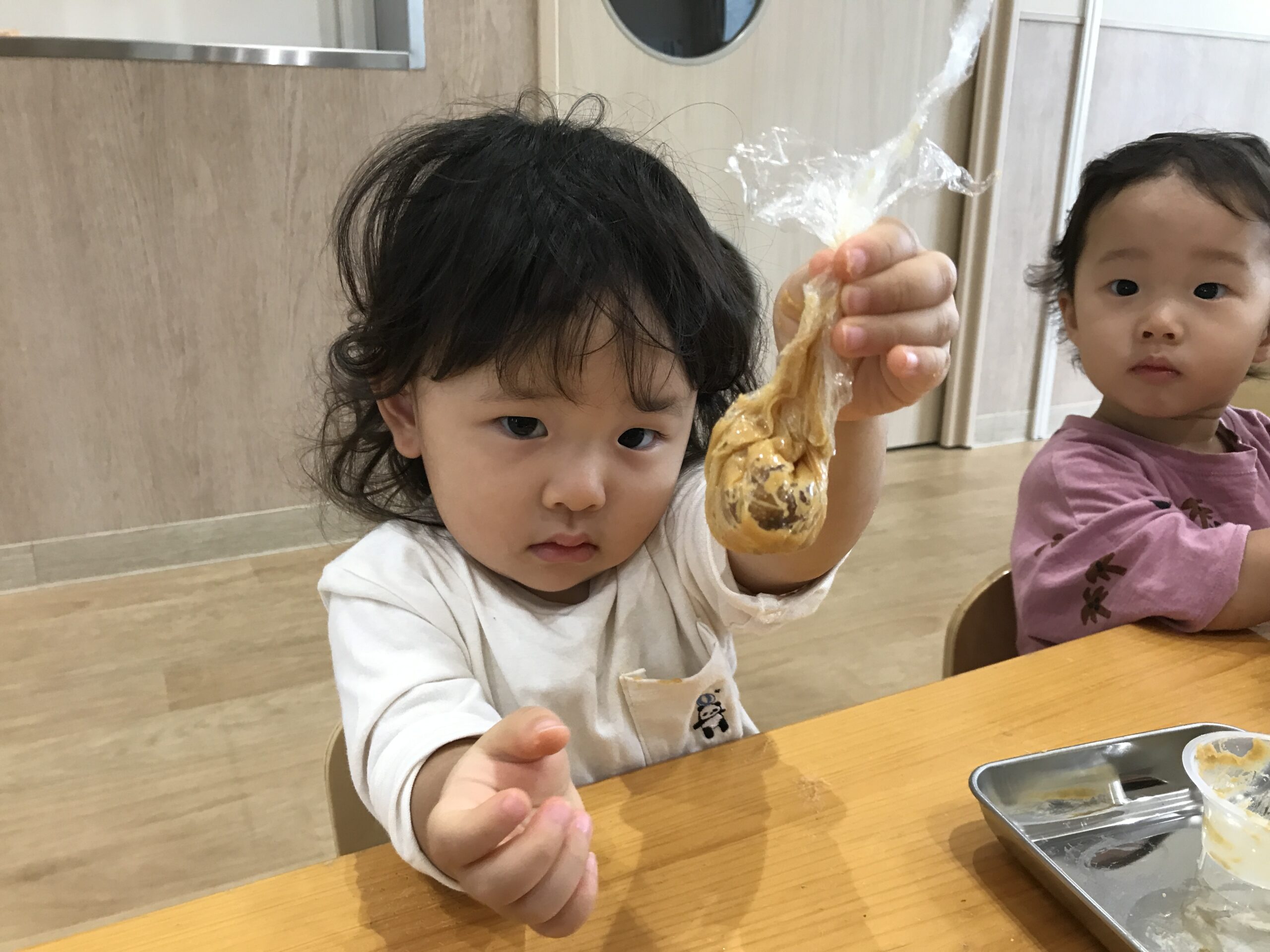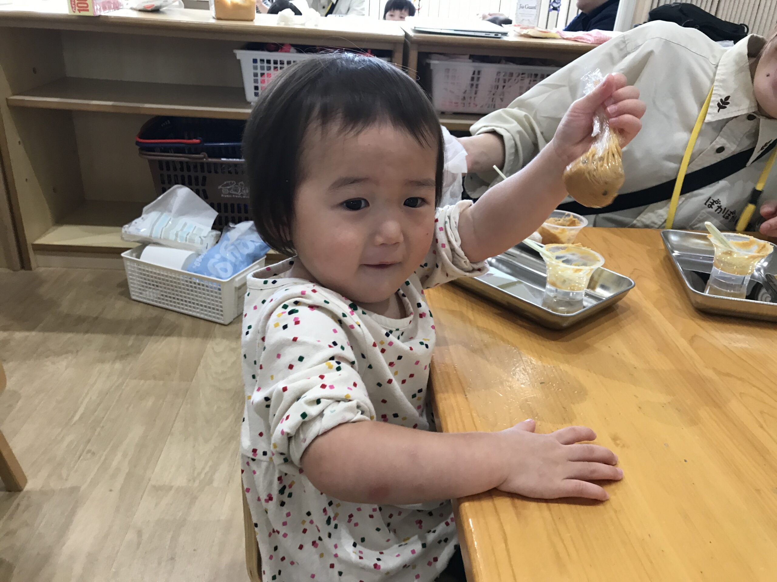 0歳児の青空組さんと1歳児の虹組さんが、味噌汁の“ひみつ”に