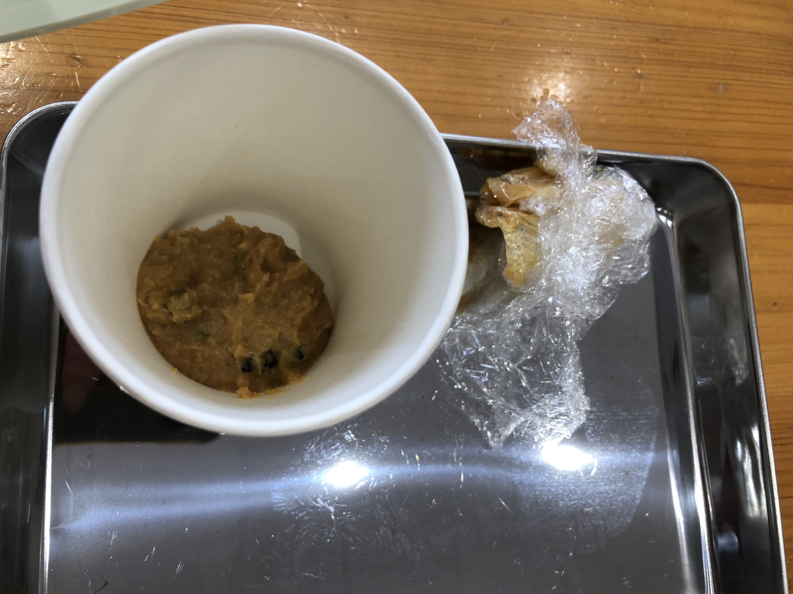 その後は紙コップに入れて、ぬるま湯をそそぎます。