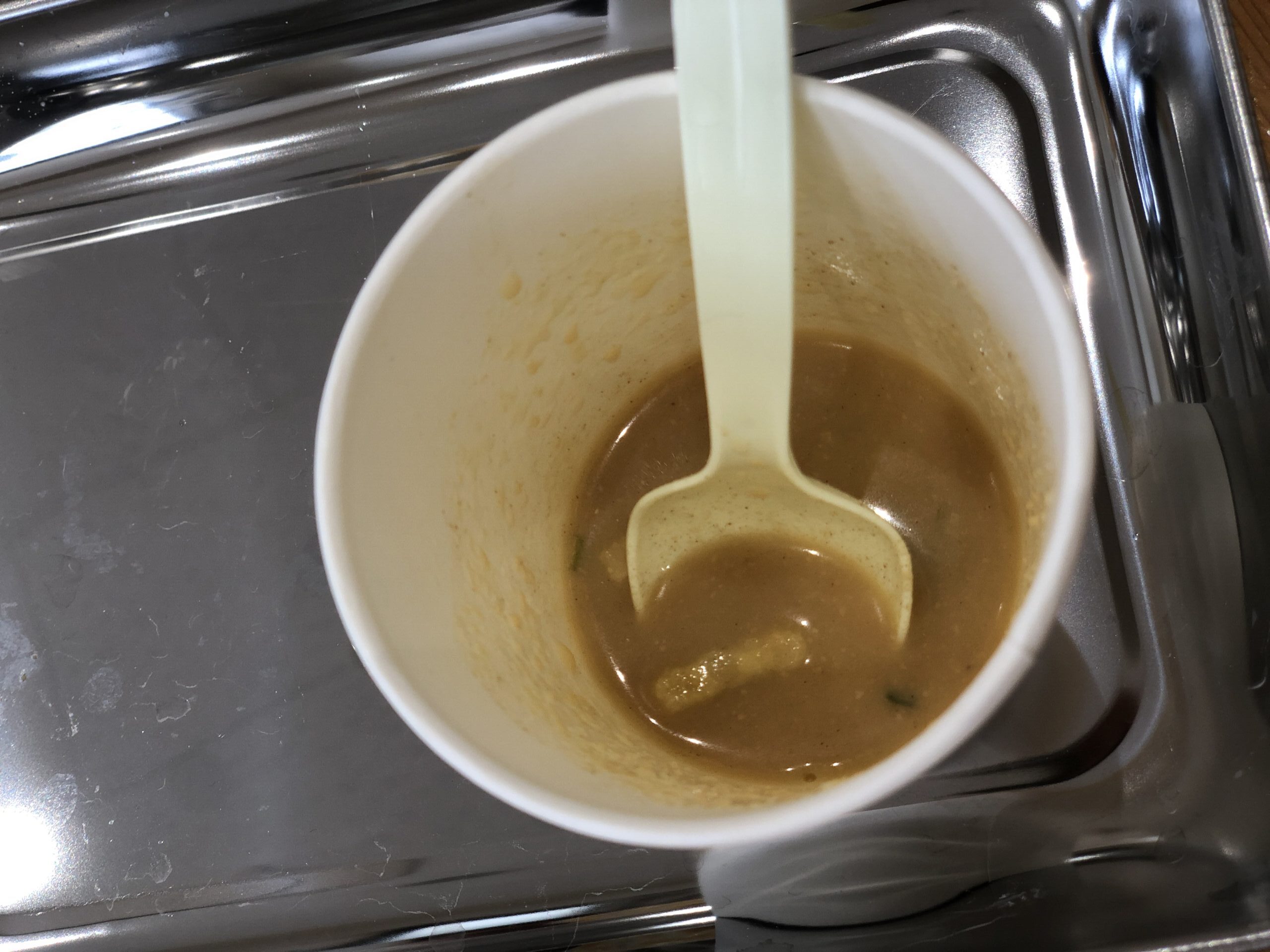 給食の時間、味噌汁が配られると、