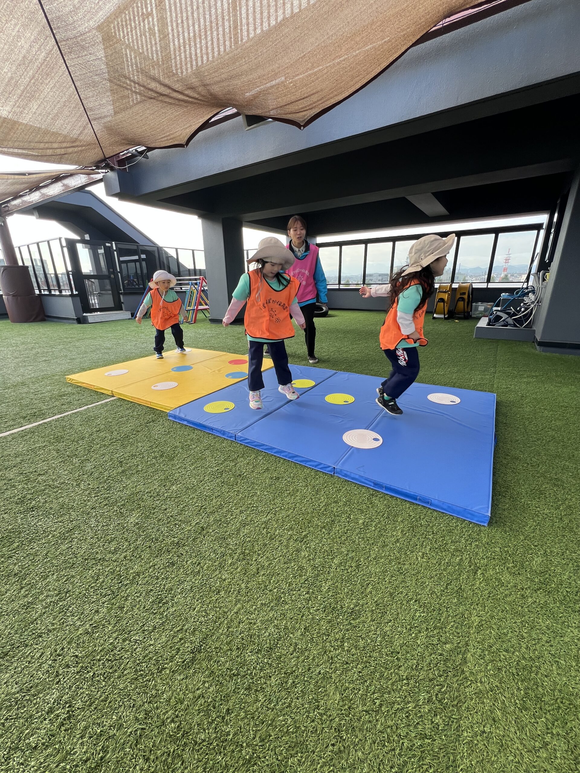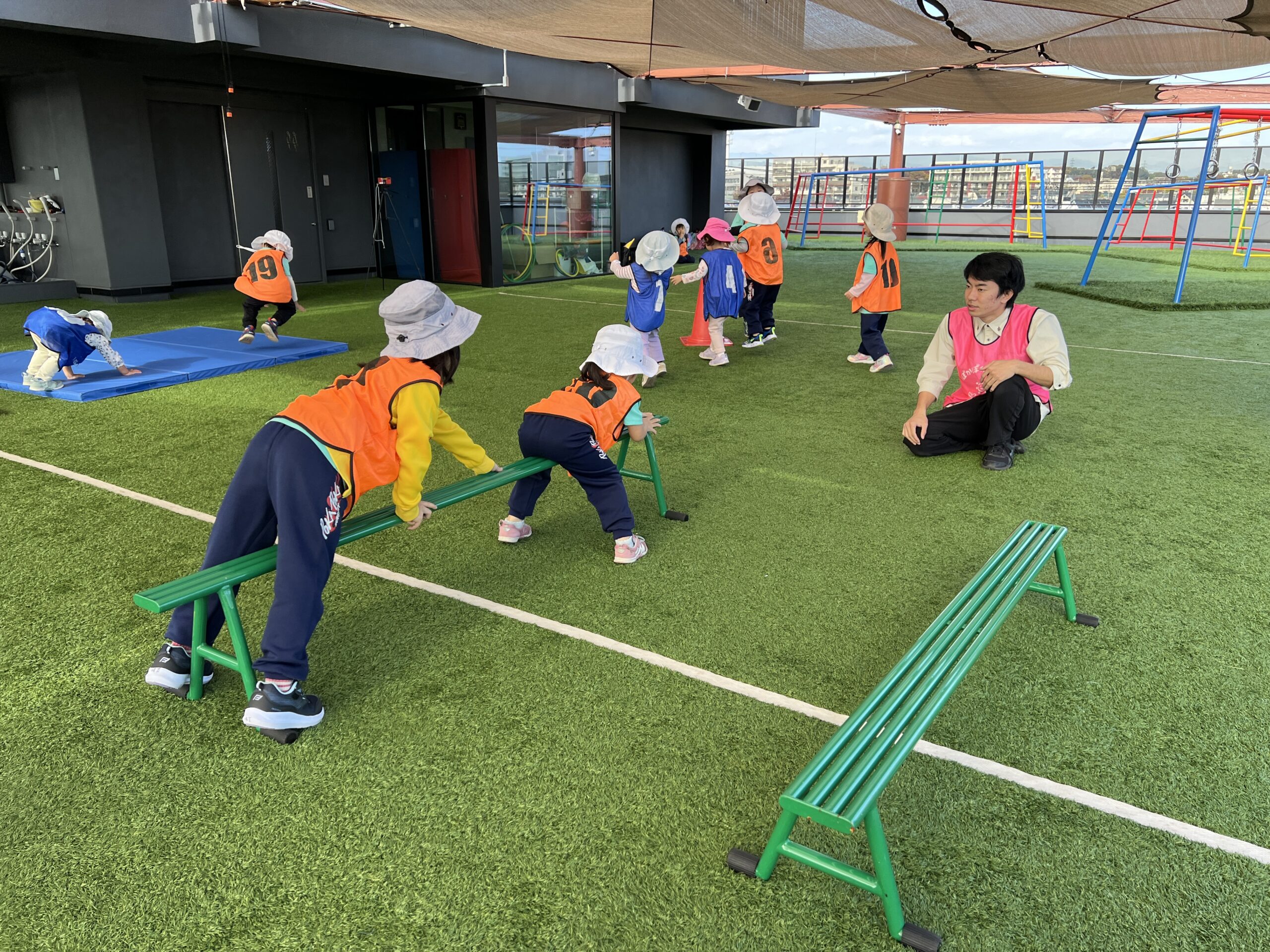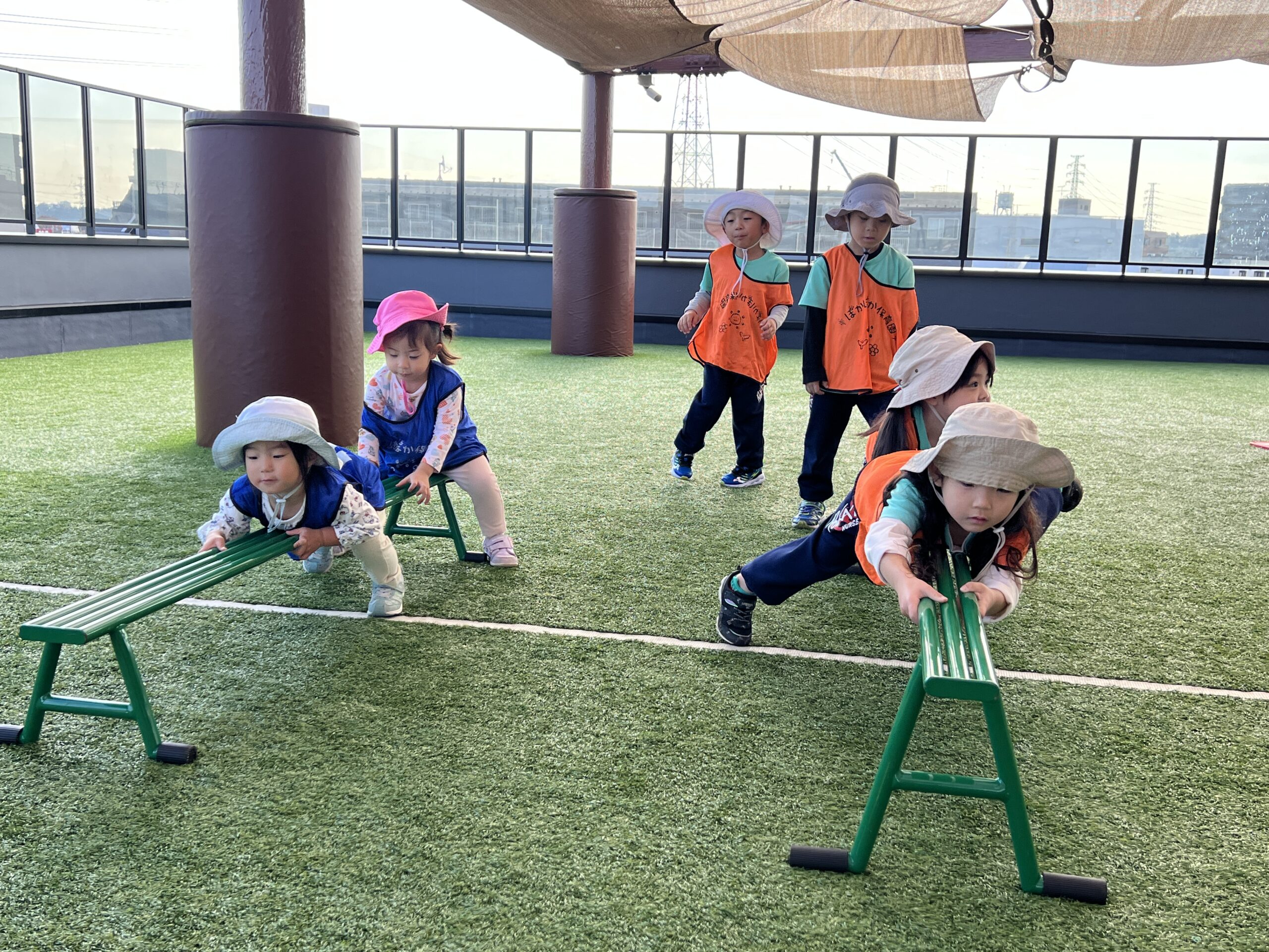 ジャンプしながら友だちとじゃんけん、平均台の上でスーパーマンになったり、年上の子の真似をして