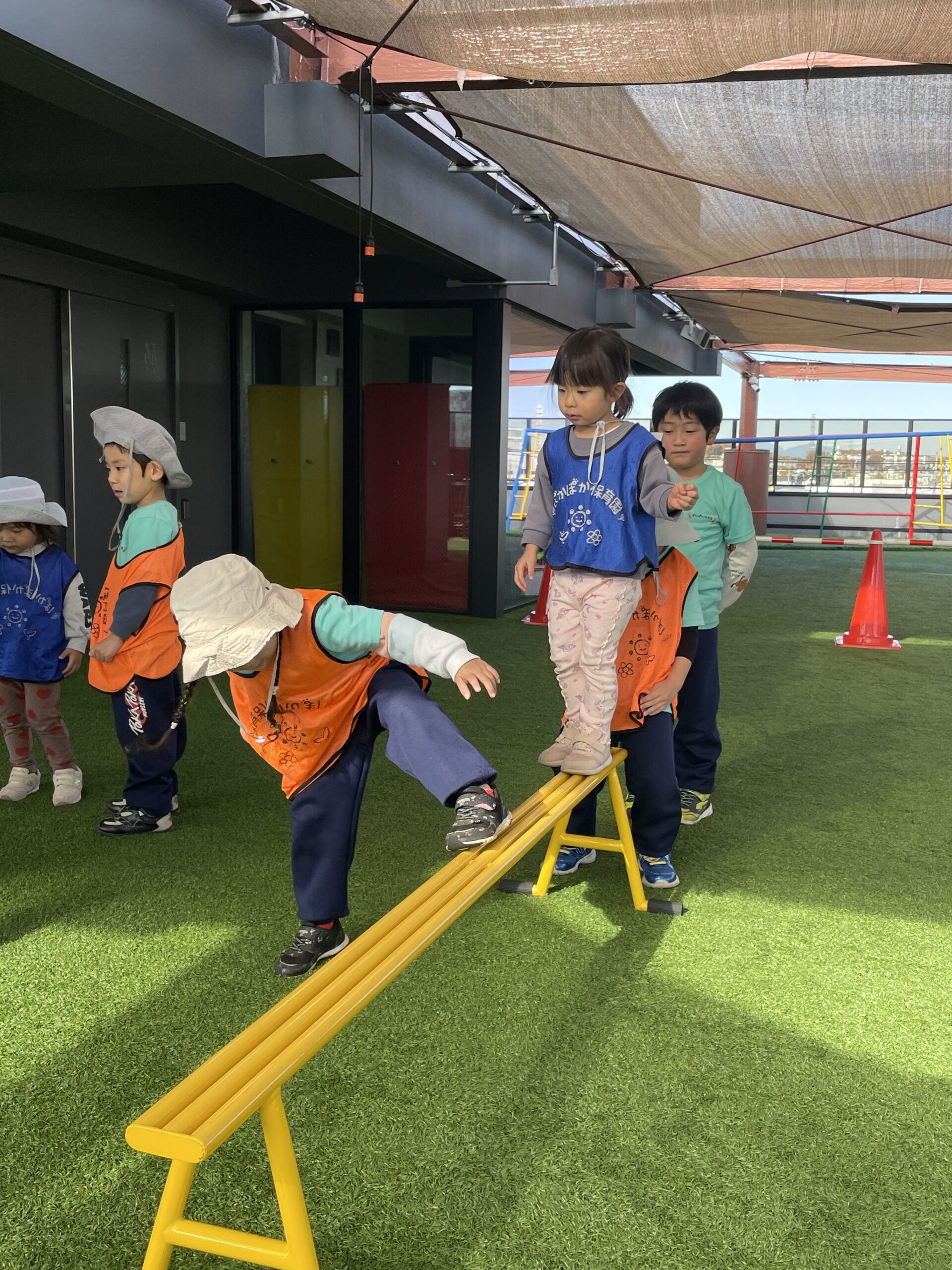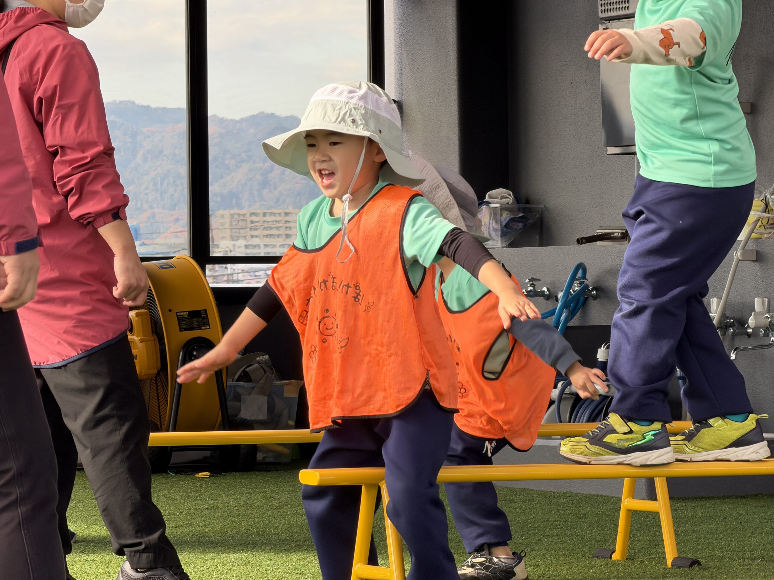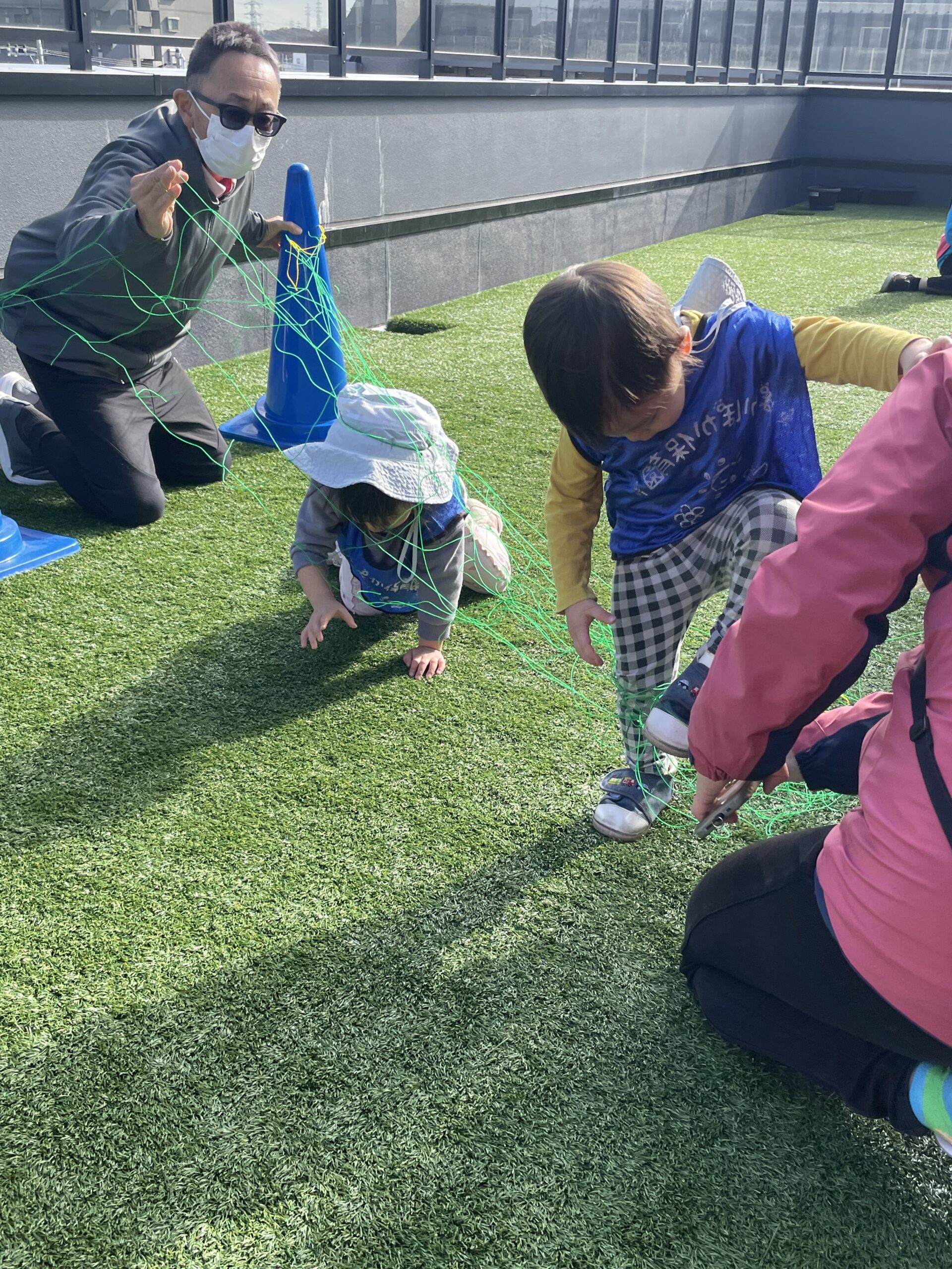 続いてサーキット遊び。いつもの内容に加えて、今日は“網をくぐる”特別コースもプラス。「なんか秘密基地みたい!」「もう一回やりたい!」と笑顔いっぱいでチャレンジしていて、こうした運動遊びが幼児教育としての“体の使い方”や挑戦する気持ちにつながっているのを感じます。