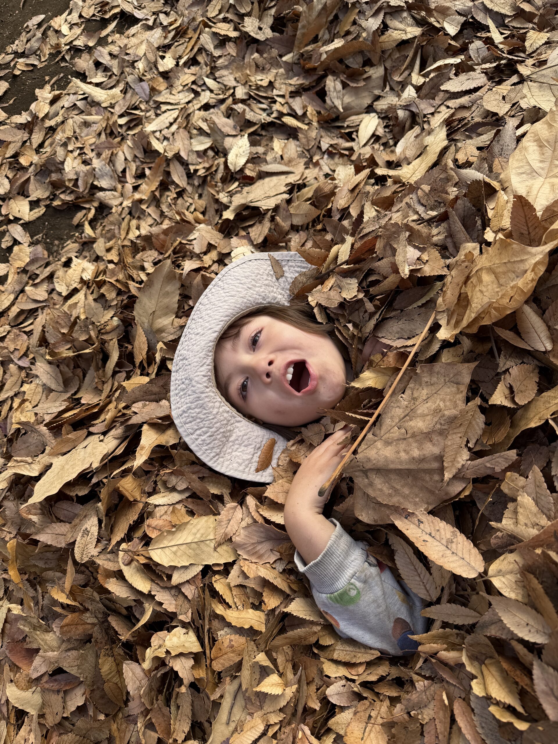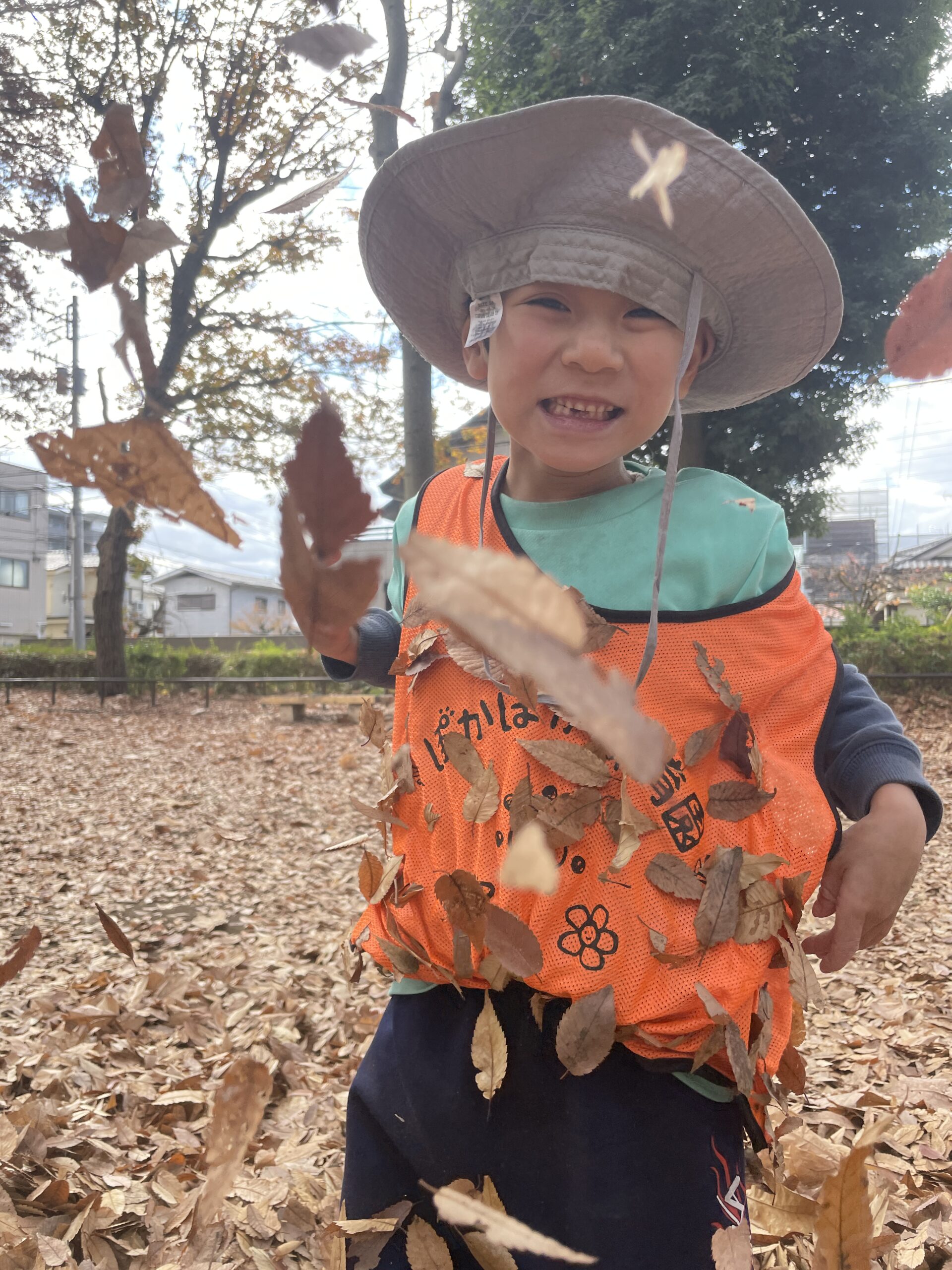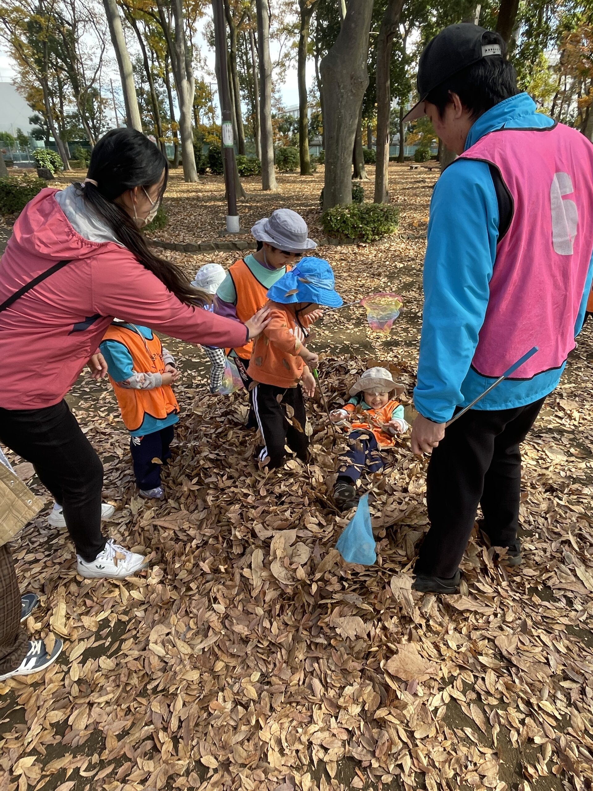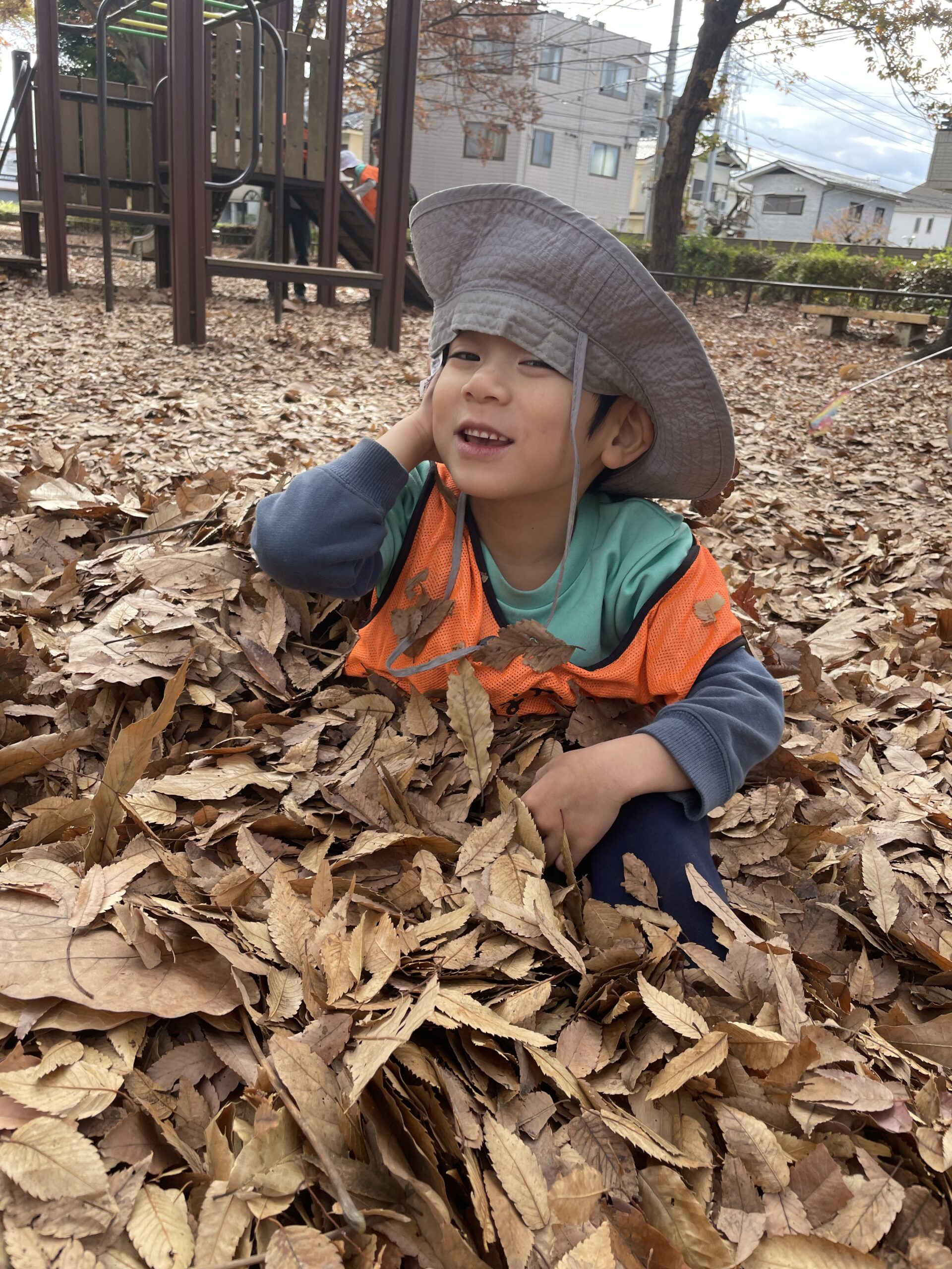 公園には落ち葉がたっぷり積もっていて、「ふかふかベッドつくろうよ!」という一声からみんなで落ち葉を集めて大きなベッドづくりが始まりました。できあがったベッドに入りながら「きもちいい〜」「あったかいね!」と秋ならではの自然遊びを存分に楽しんでいました。