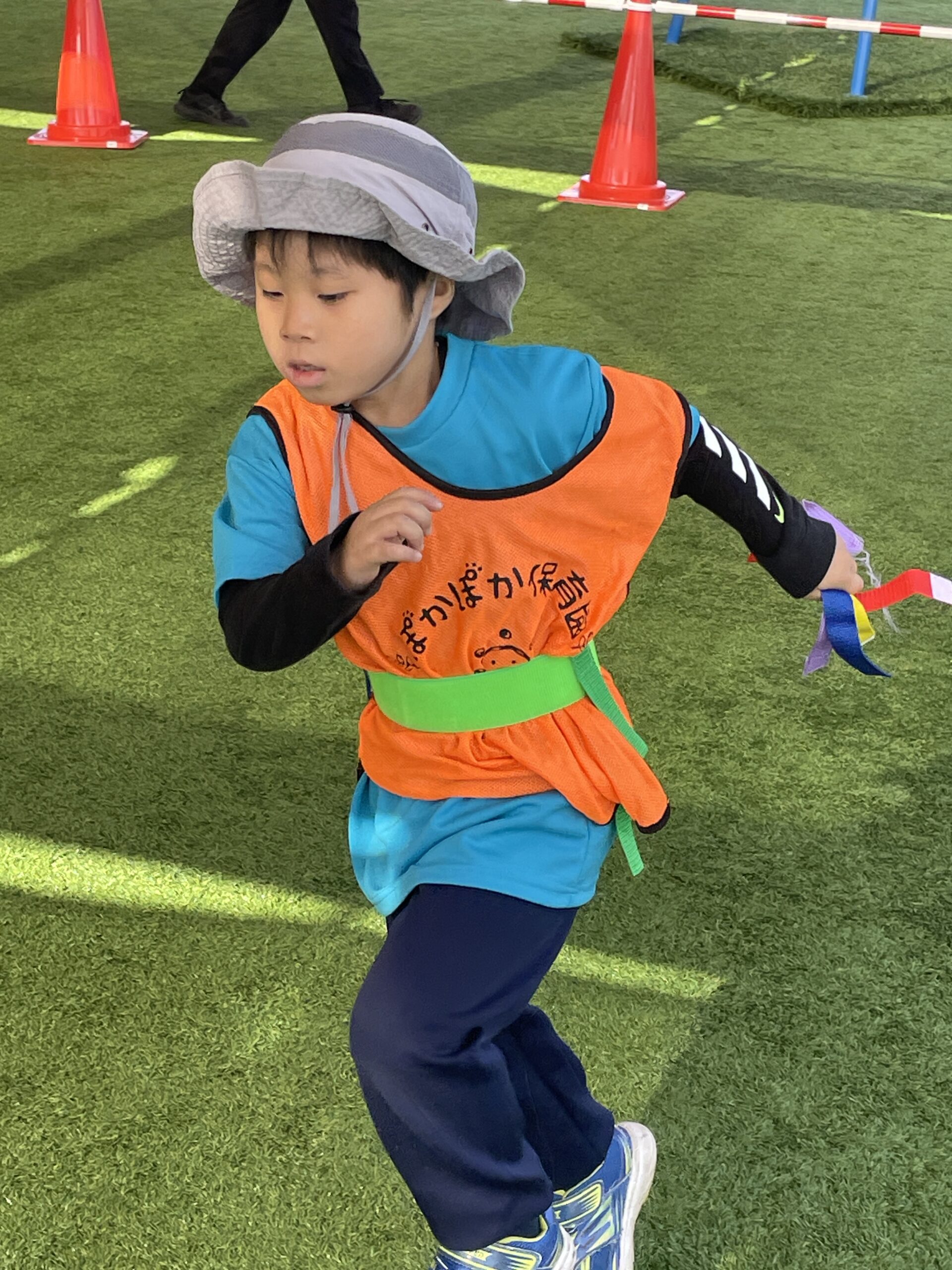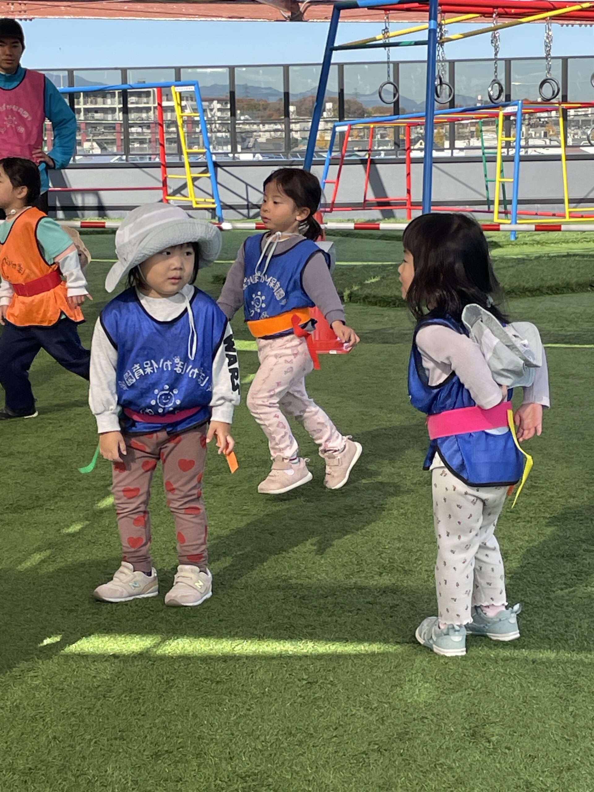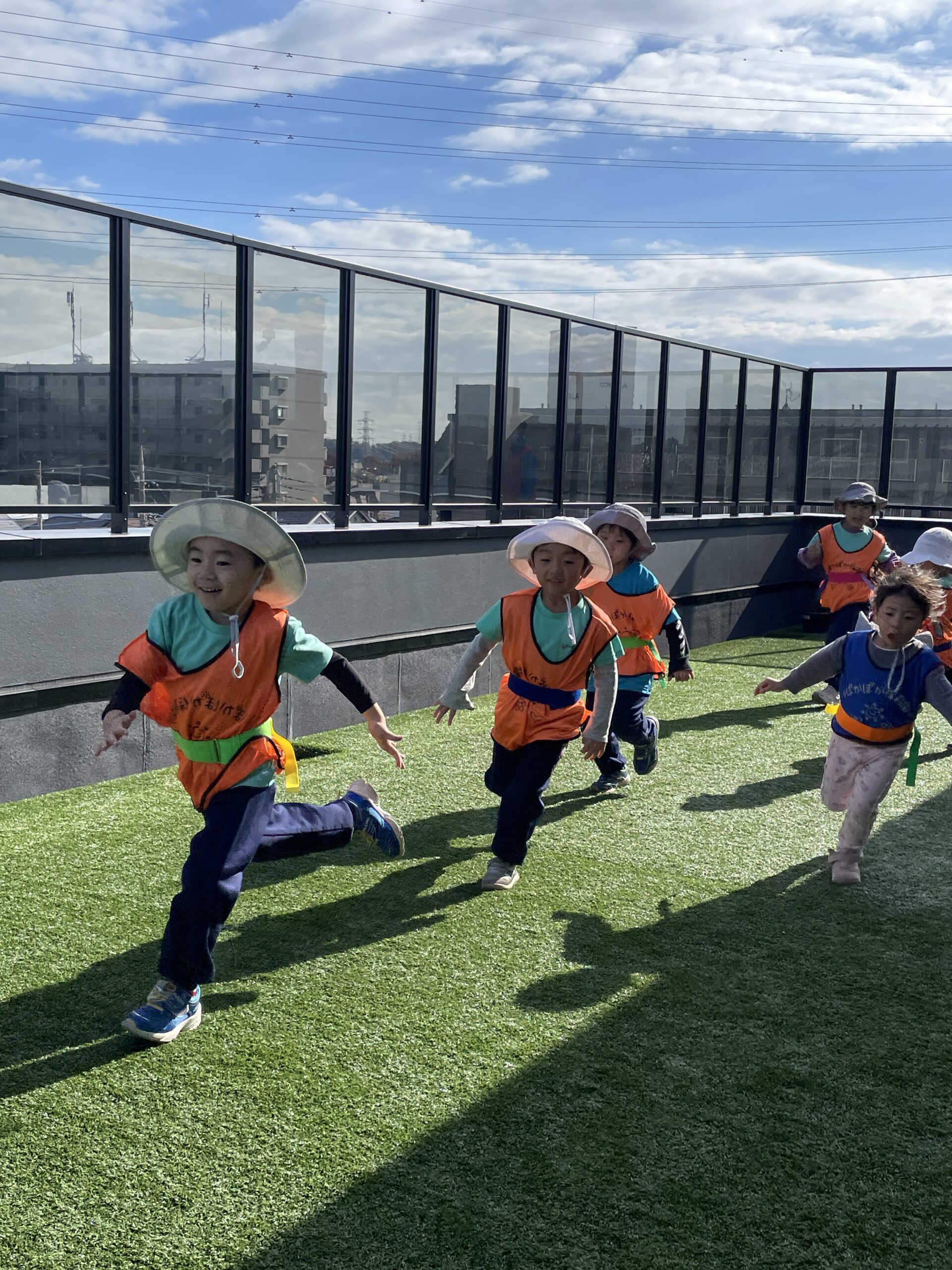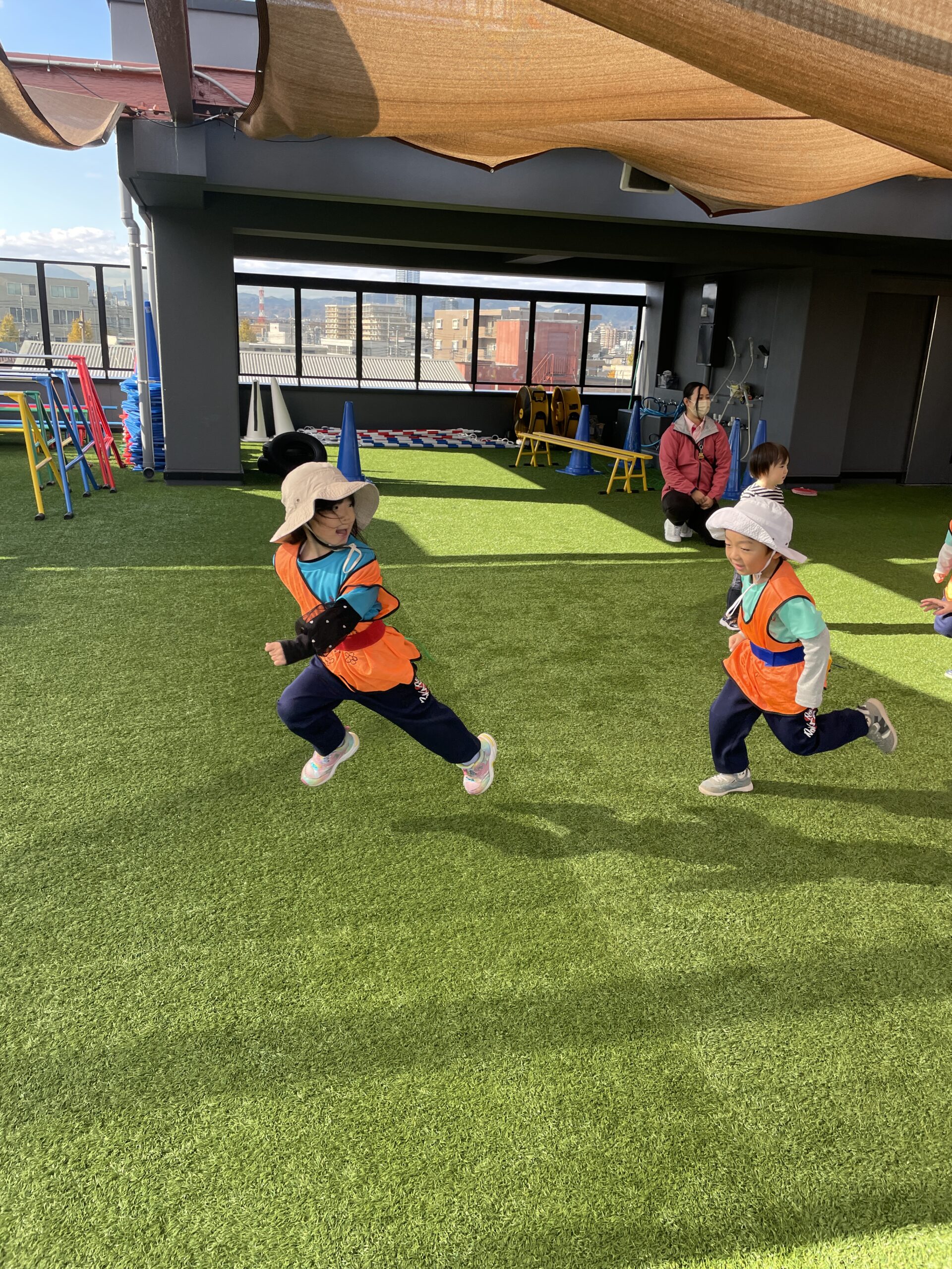 まずは屋上で安田式のしっぽ取り。ステップのお友だちと混ざり、「絶対一位になる!」と気合十分の子もいれば、二歳児さんでもしっぽを取られず最後まで残った子がいて、先生もびっくりするほど頑張っていました。しっぽを取られた子が「くやしい〜!」と言うと、先生が「次はどんな作戦で行く?」と声をかけ、「こうやって逃げる!」と次の挑戦に向けて気持ちを切り替えていました。