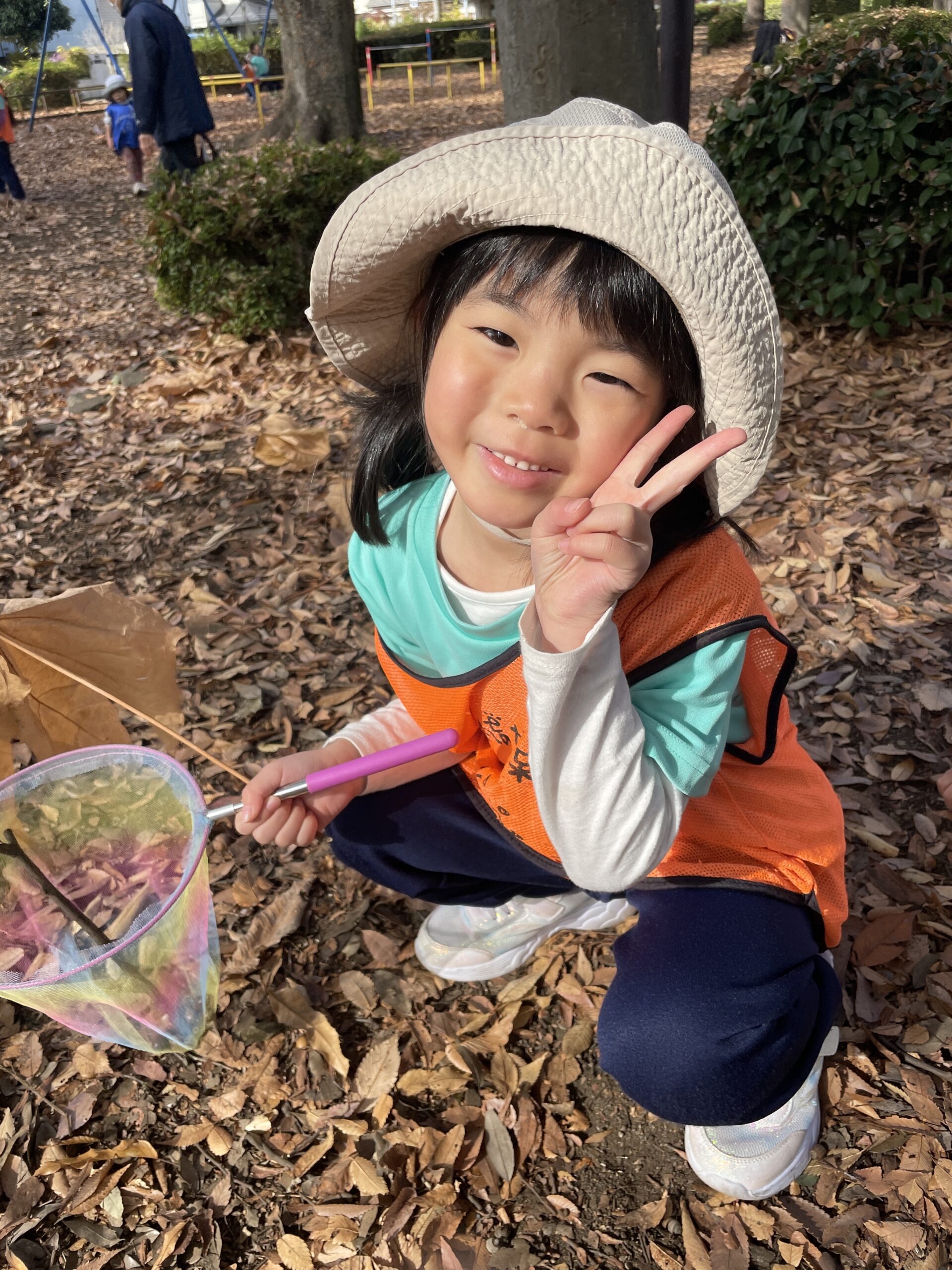 虫網を持って虫探しにも挑戦。「前はいたのにね?」「どこ行っちゃったのかな?」と子ども同士で話しながら公園中を探し回っていました。「今日は寒いから隠れてるのかもね」と先生が伝えると、「そっか、じゃあまたあたたかい日に来ようね!」と前向きに気持ちを切り替える姿も見られました。