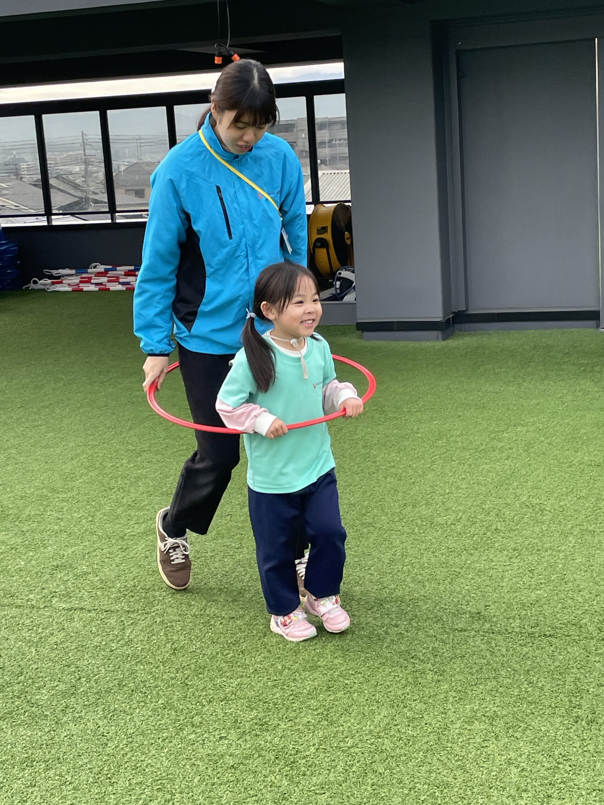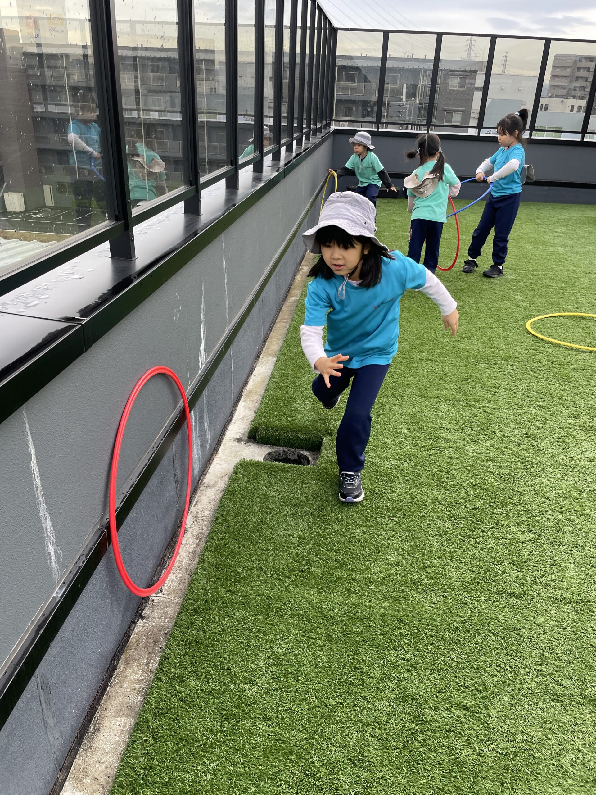 フラフープを使って、友だちと一緒に転がして仲良く楽しむことが出来ました☆