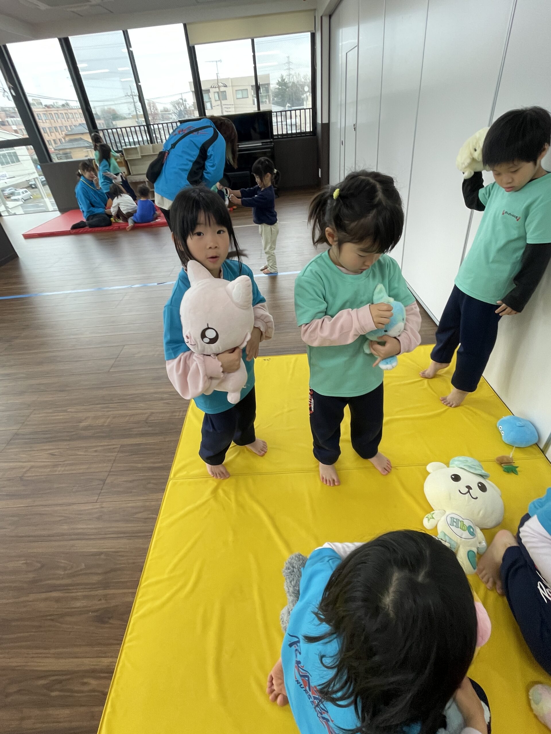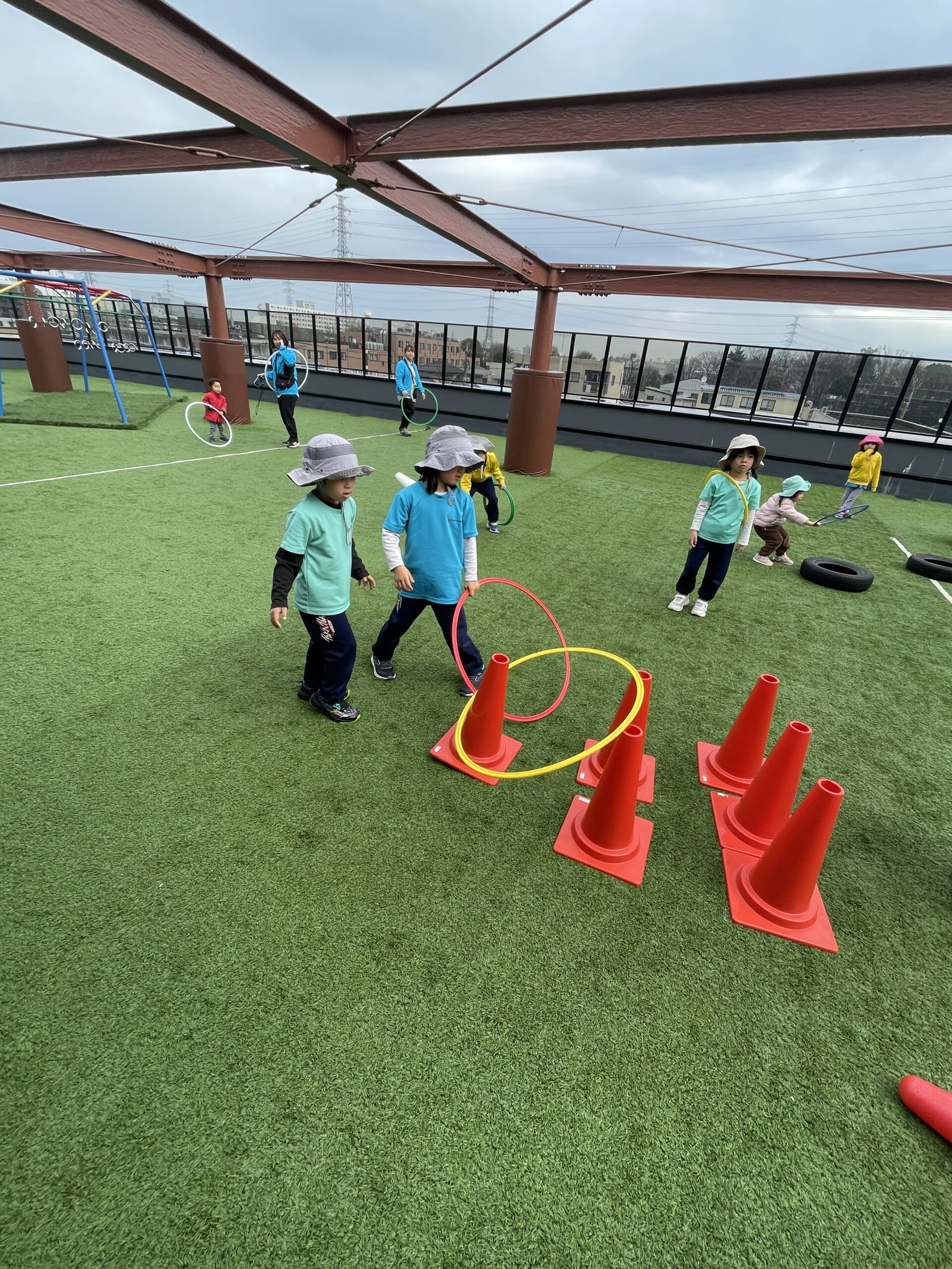 フラフープを使って赤いコーンに入れて遊ぶ場面では、上手く入れられるか友だち同士で話す場面が見られ、フラフープを入れられた瞬間は、喜んでいる姿が多かったです!