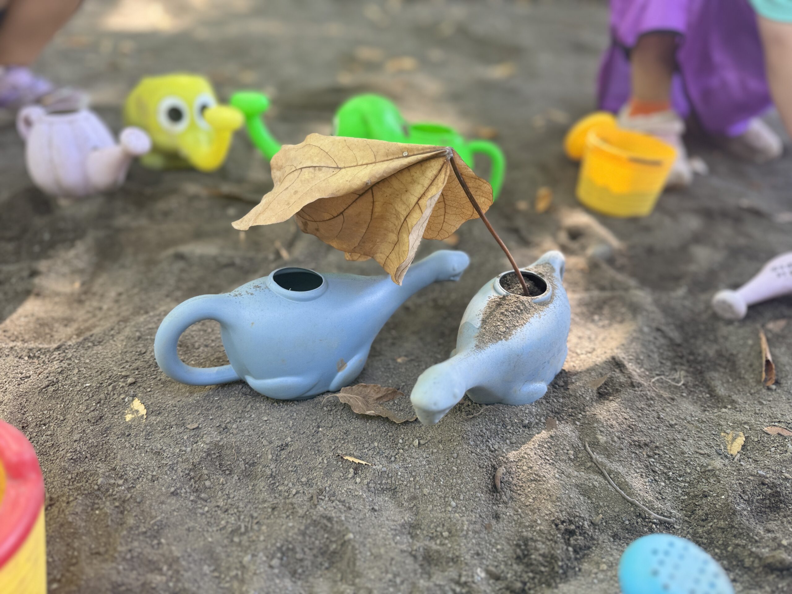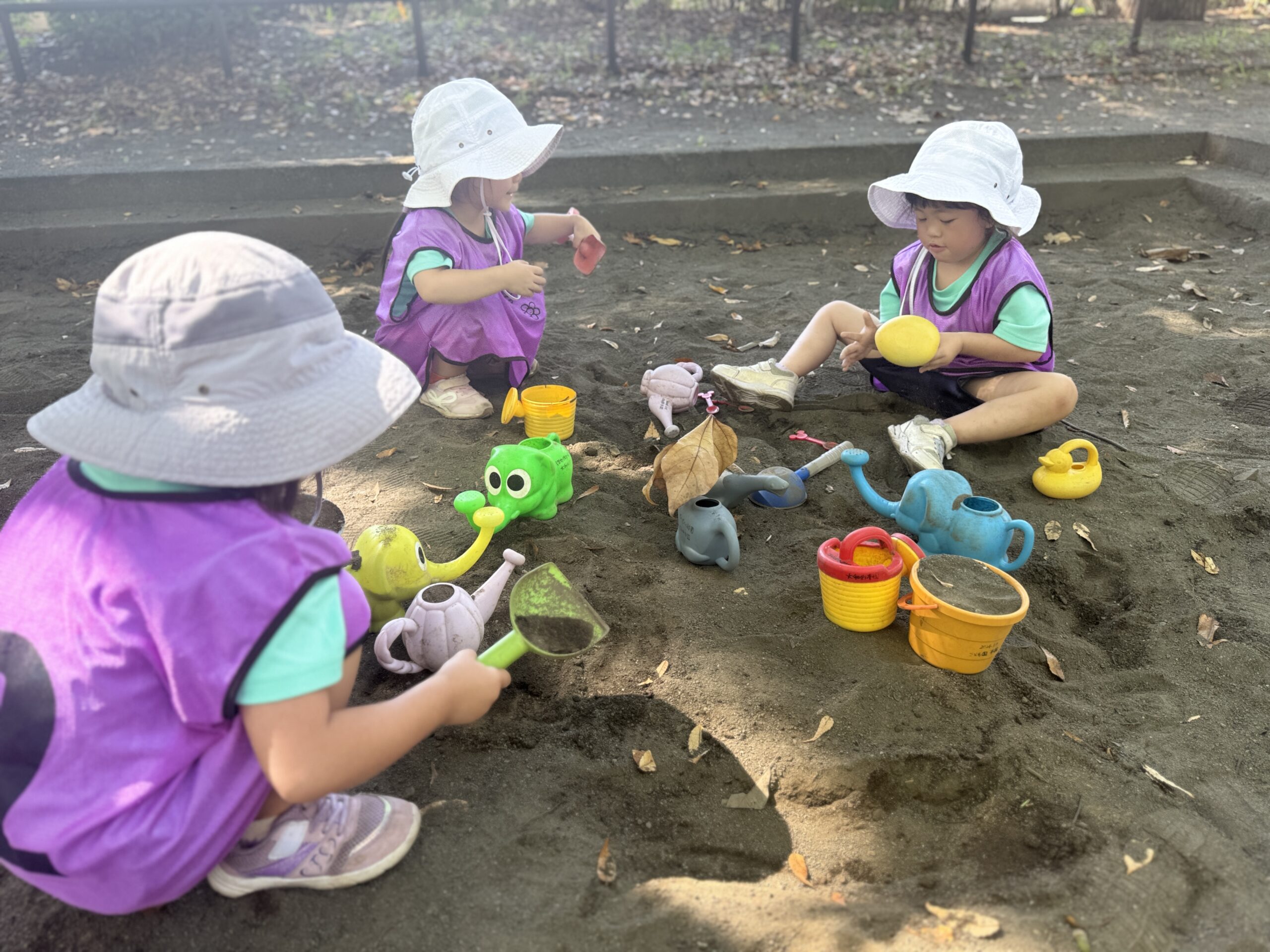じょうろに砂を入れて「お茶入れてるの。」と教えてくれる子ども達。
