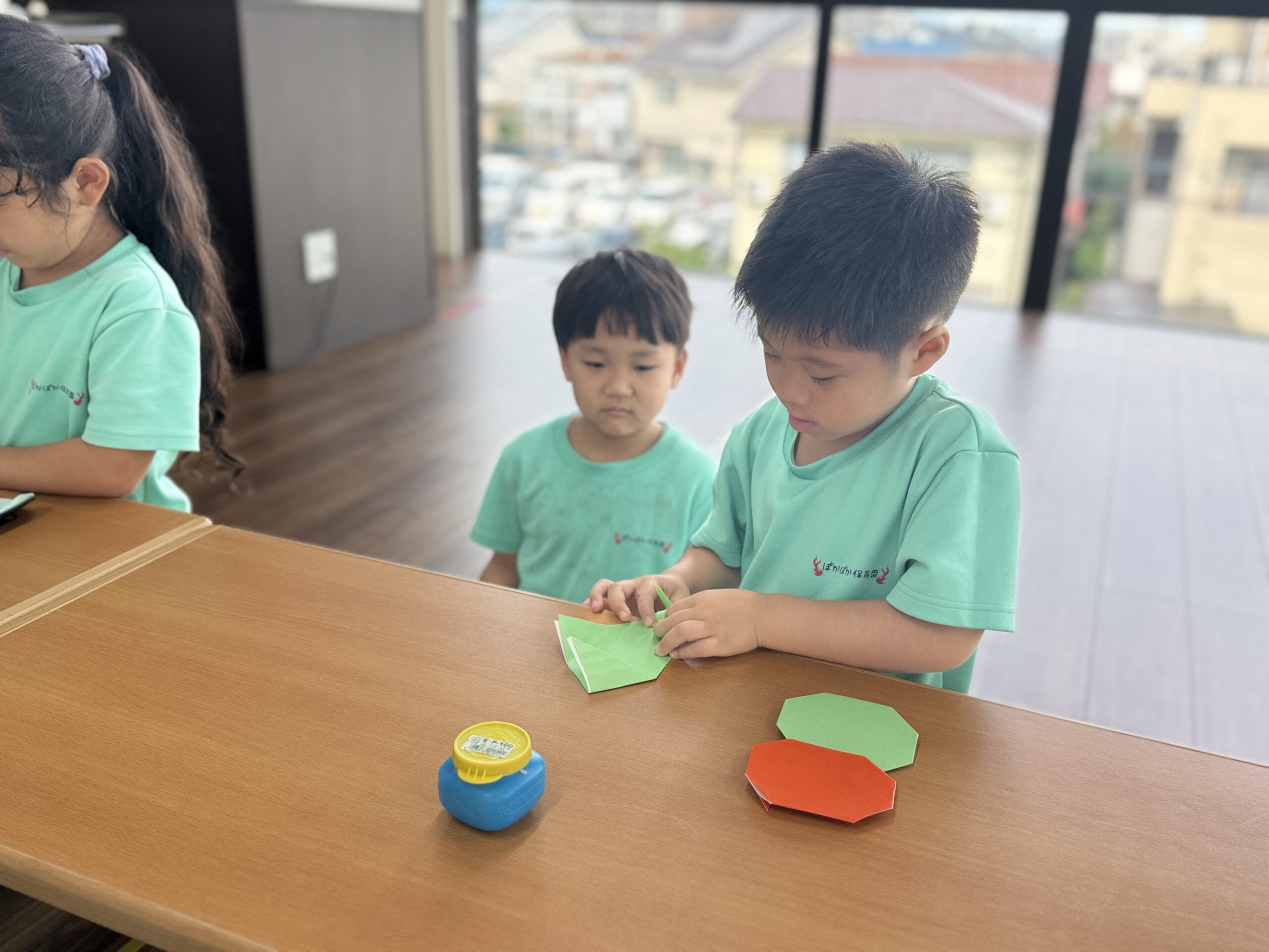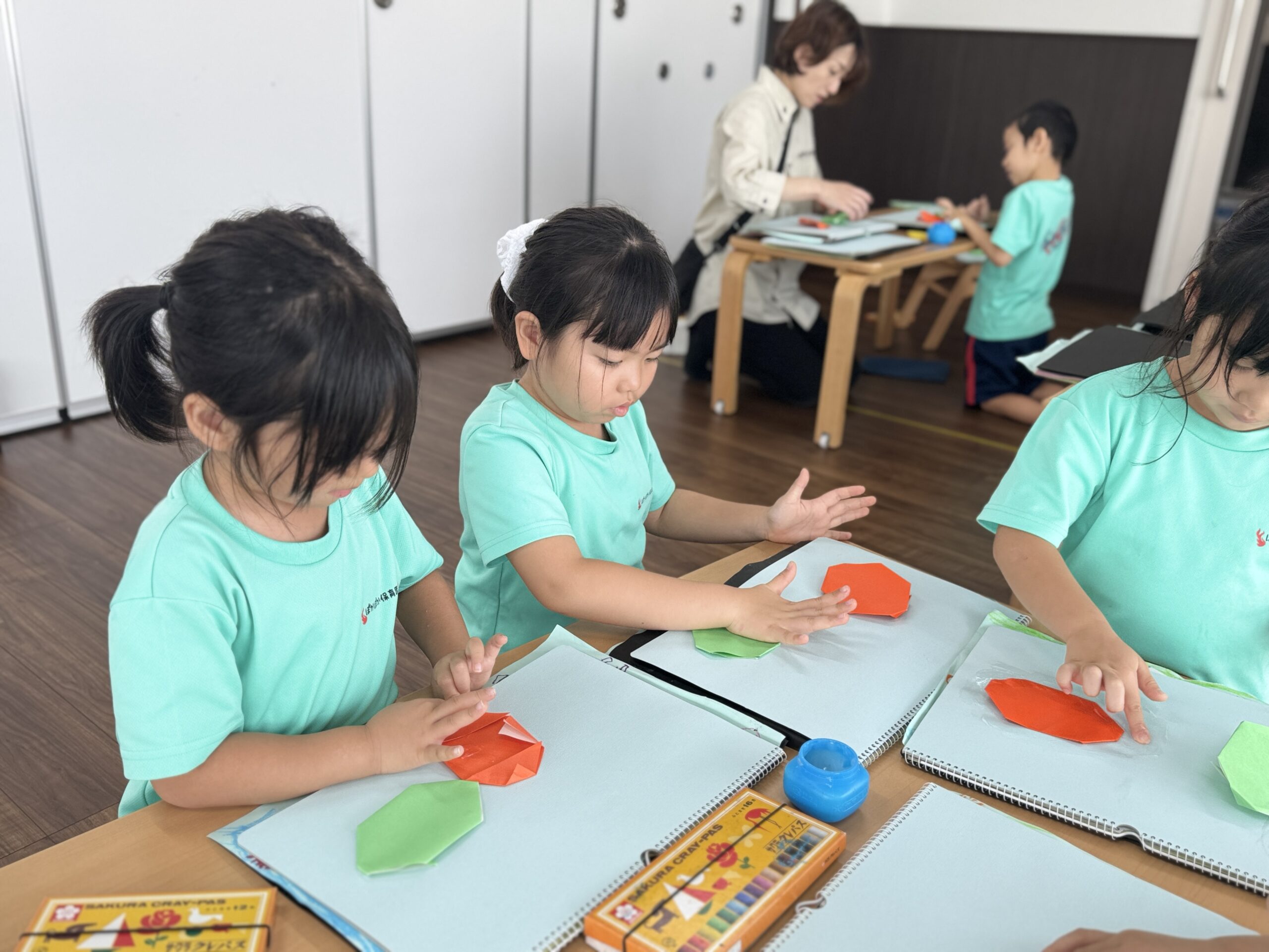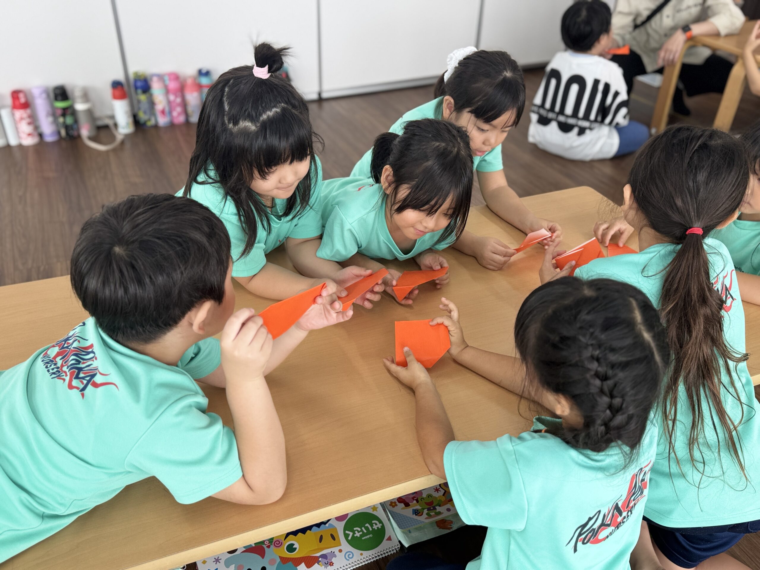 お月見のお話で日本の文化に触れた後は、10月の製作活動に取り組みました。秋といえば、実りの季節。ということで、今日はみんなで「柿」を折り紙で折ることに挑戦しましたよ!折り紙は、手先の器用さや集中力、そして空間認識能力を養うのに最適な活動です。