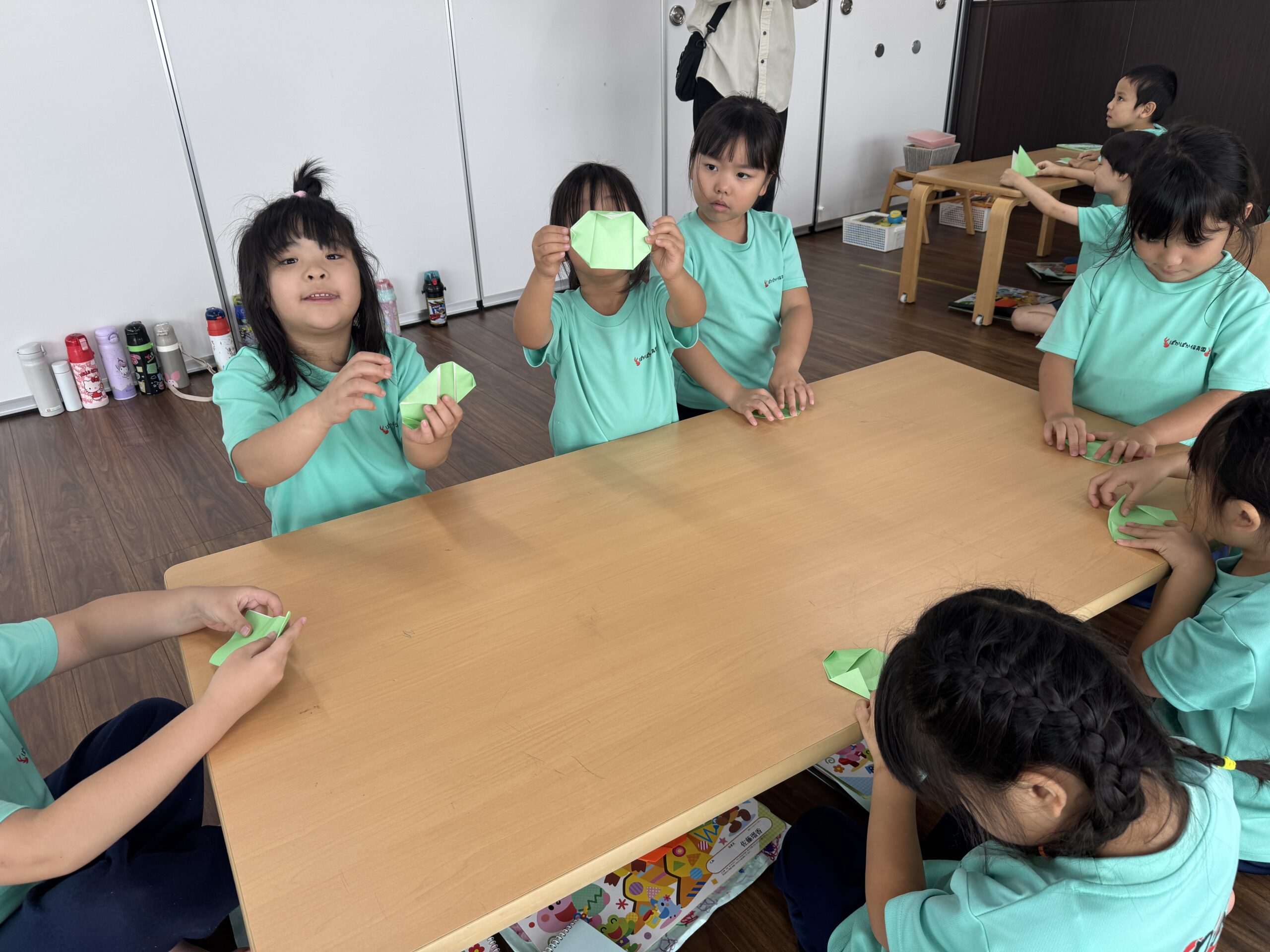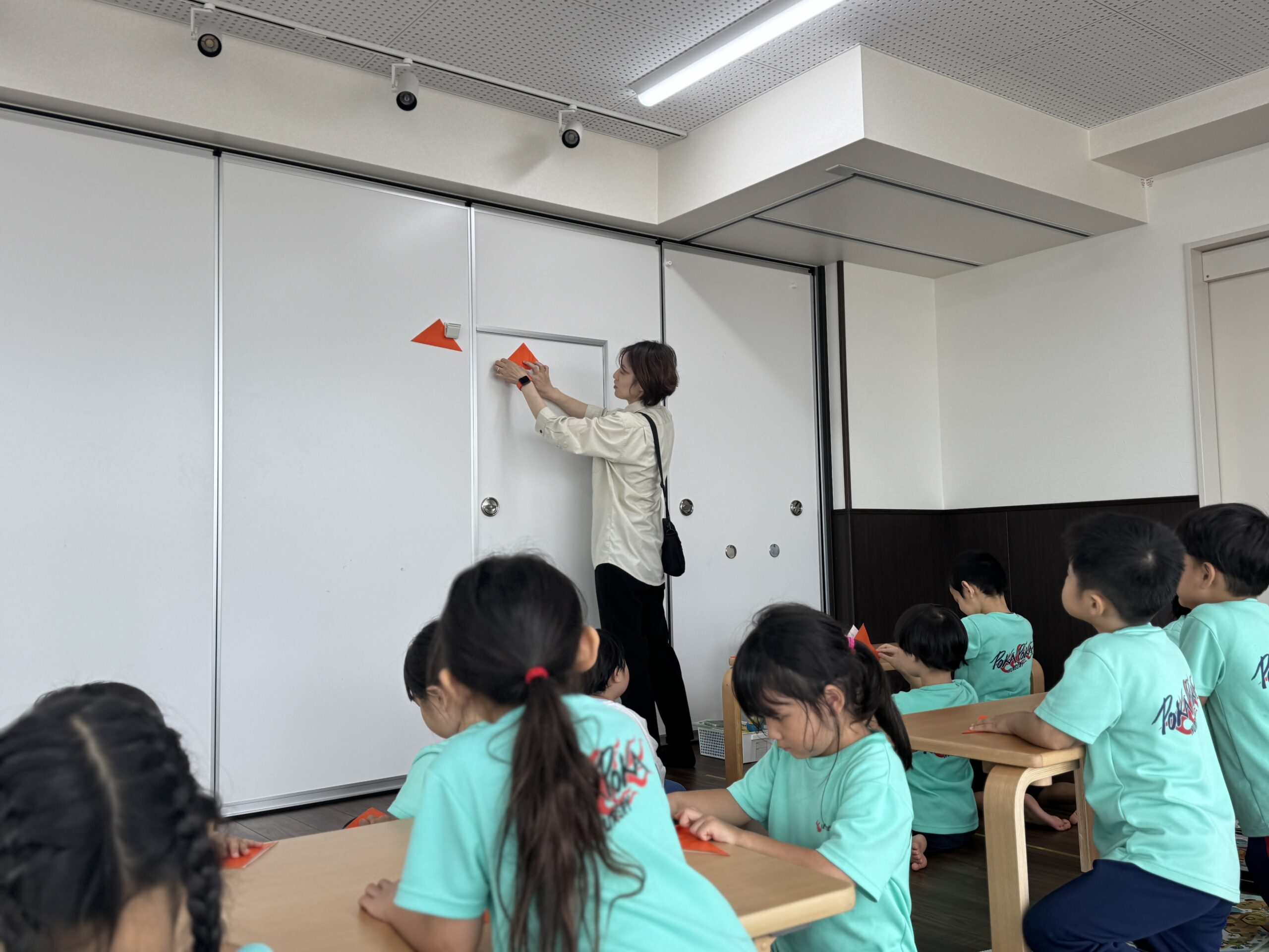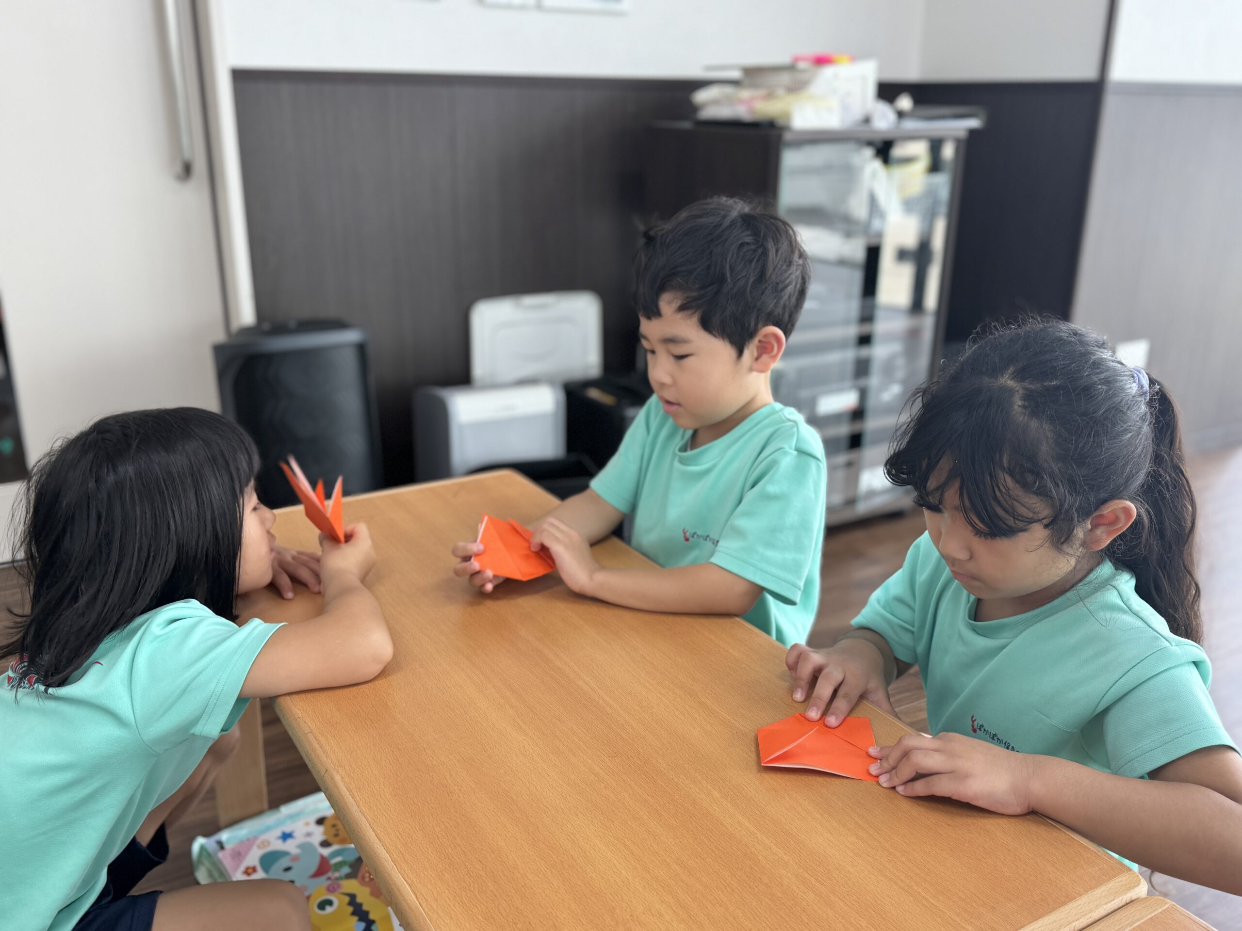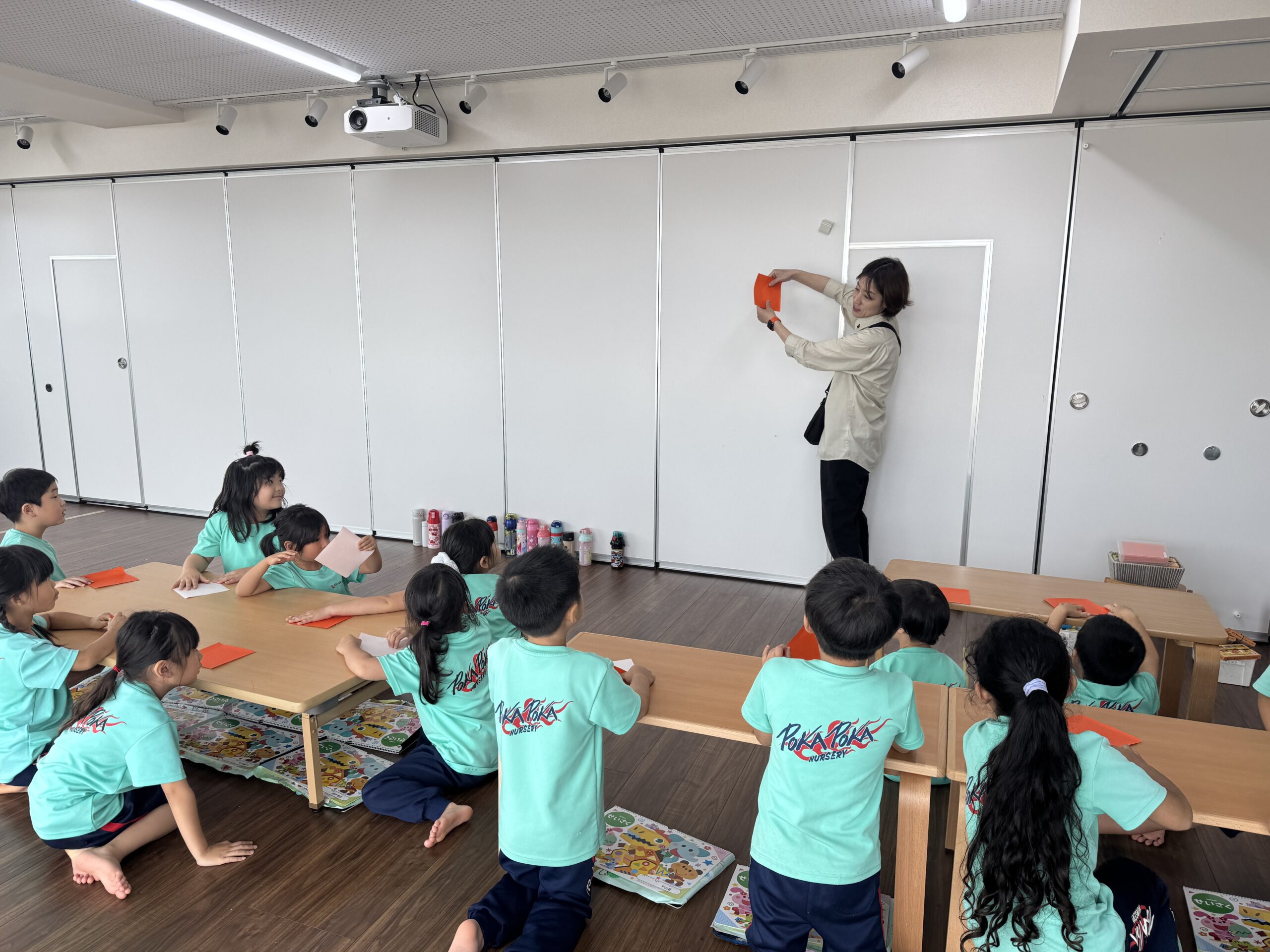 お月見のお話で日本の文化に触れた後は、10月の製作活動に取り組みました。秋といえば、実りの季節。ということで、今日はみんなで「柿」を折り紙で折ることに挑戦しましたよ!折り紙は、手先の器用さや集中力、そして空間認識能力を養うのに最適な活動です。