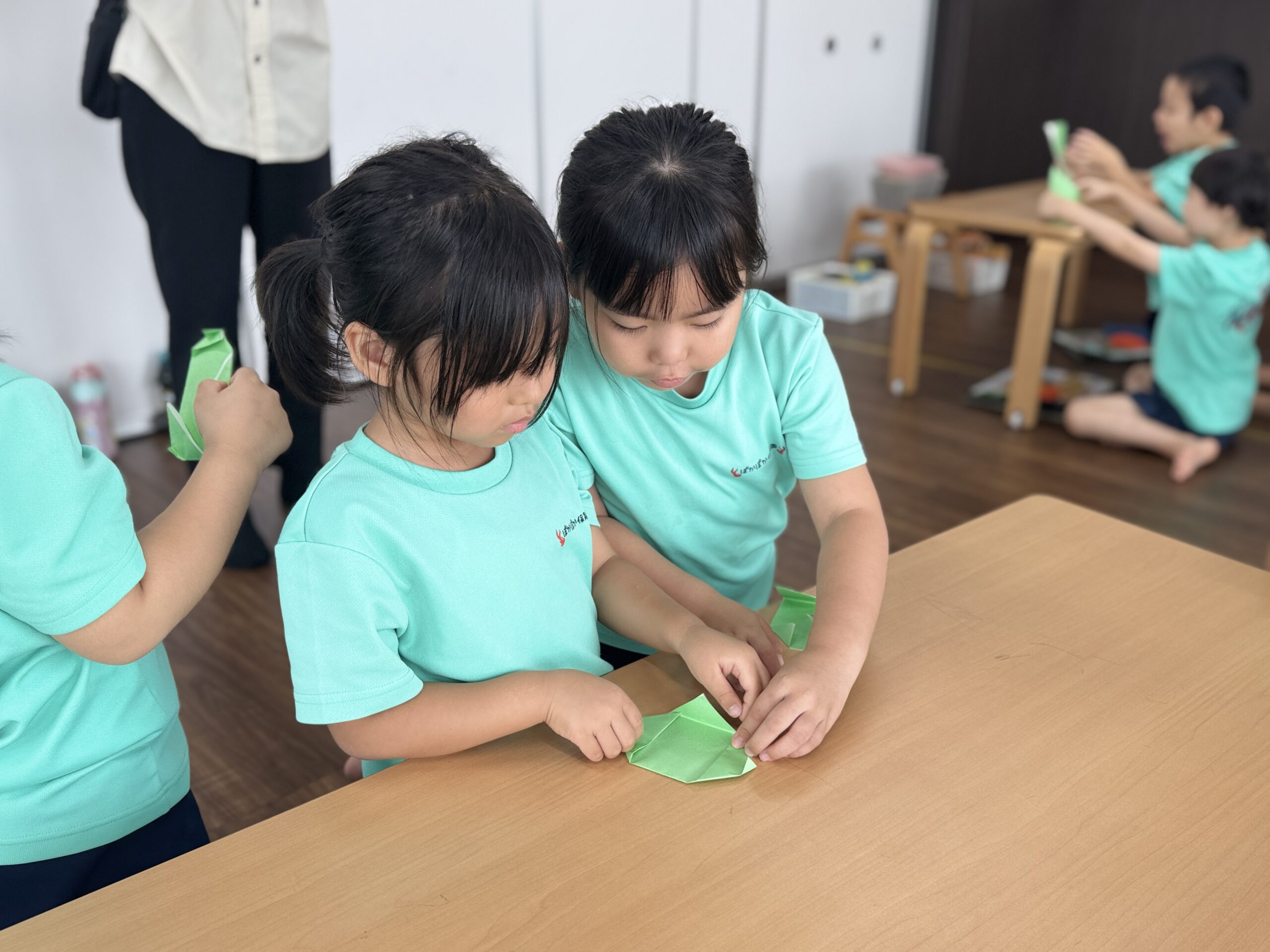まず1つ目は、先生のお手本をよく見ながら、みんなで一緒に折っていきます。「ここを半分に折って、次はここを三角にね」と先生がゆっくりと説明すると、子どもたちは真剣な表情で折り紙と向き合います。「先生、これで合ってる?」と、完成途中の折り紙を先生に見せに来る子も。「うん、上手だね!そのままで大丈夫だよ」と優しく声をかけると、子どもたちは安心して次の工程に進んでいました。みんなで協力しながら、可愛らしい柿の形が少しずつできていくのが、とても嬉しそうでした。