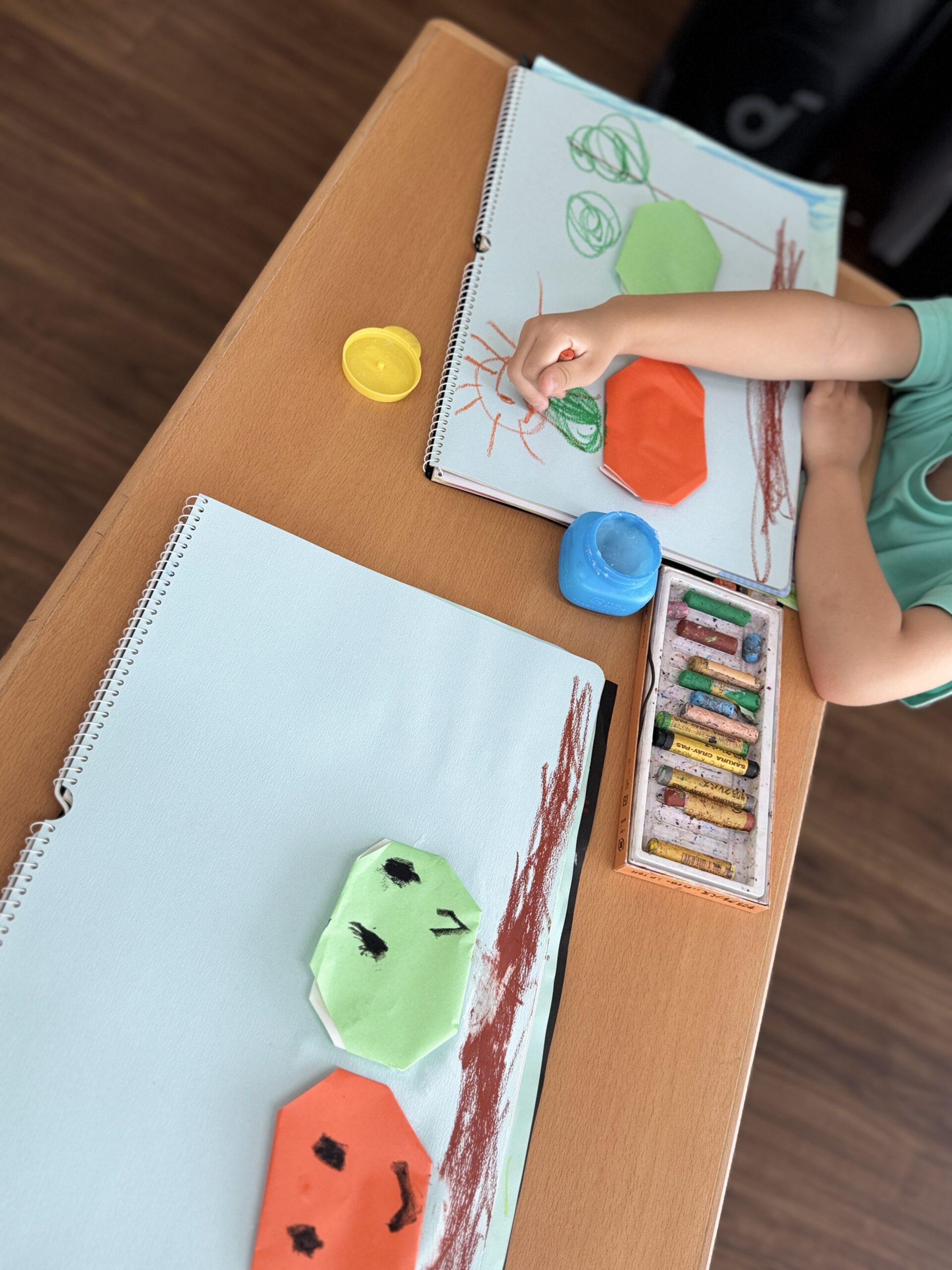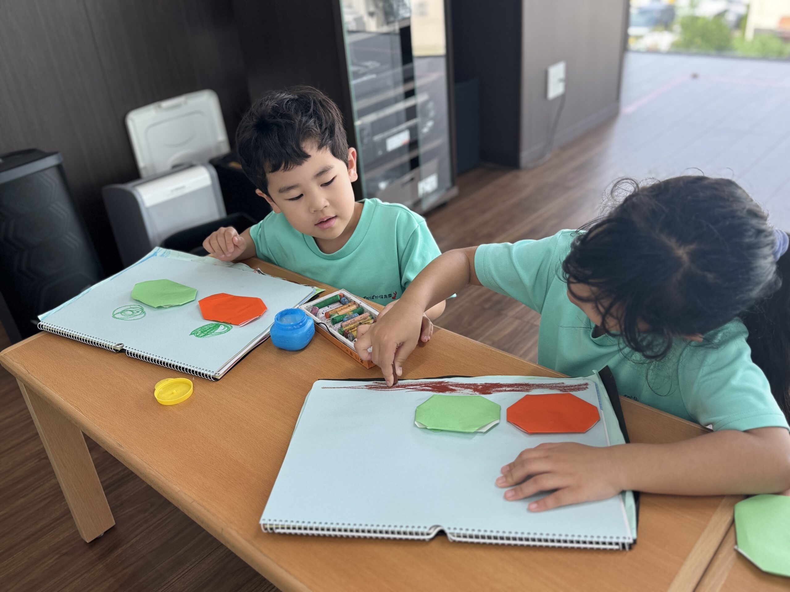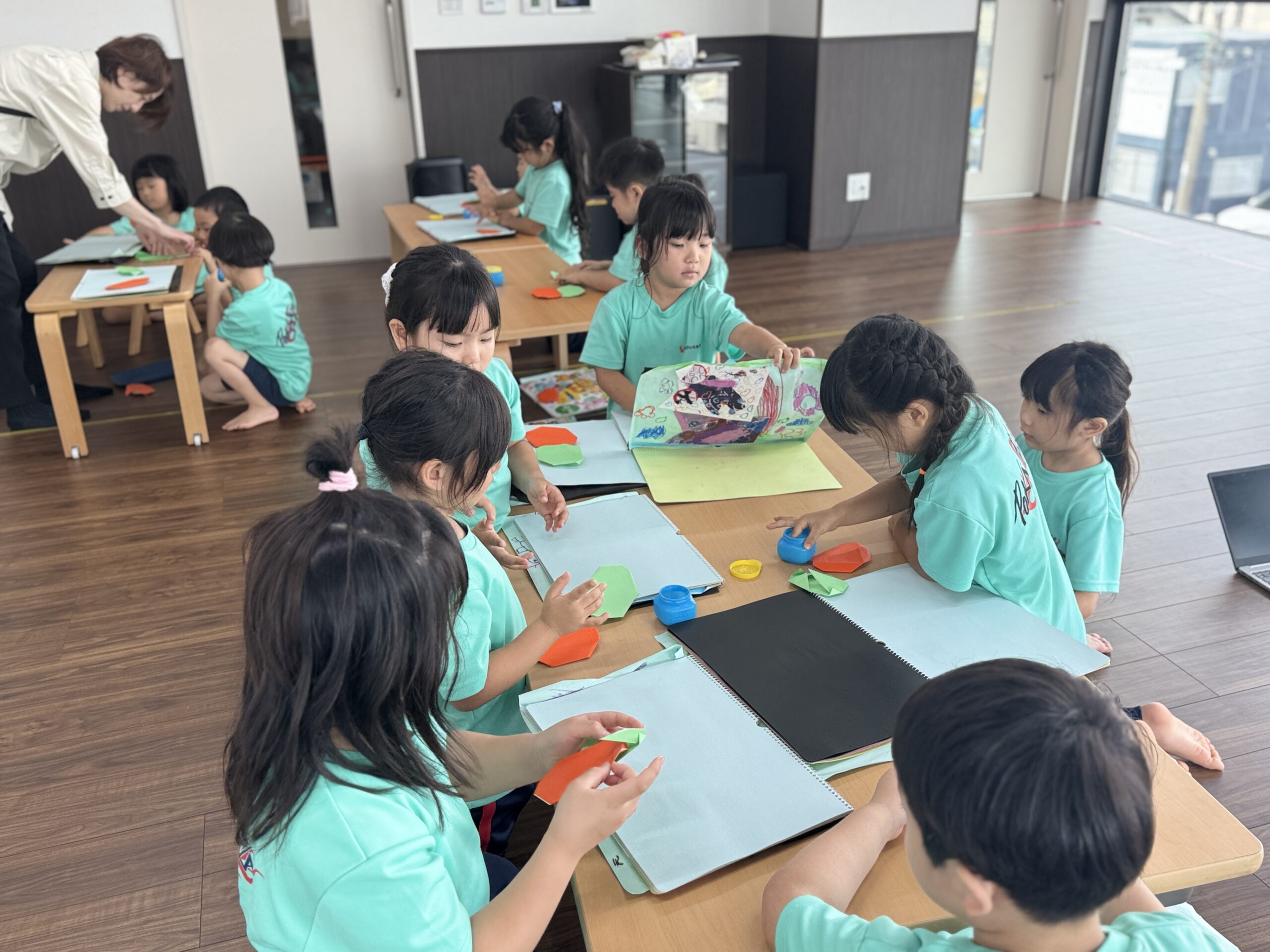 折り終わった柿は、ノリを使って製作帳に貼り付けます。そして、クレヨンで周りをデコレーション!太陽や空、葉っぱ、鳥さんなど、思い思いの絵を描いて、自分だけの素敵な秋の風景を表現していました。この製作活動を通して、子どもたちは集中力、手先の巧緻性、記憶力、そして創造力を存分に発揮していました。これらの力は、小学校での学習にも繋がる大切な基礎となります。子どもたちの「できた!」という喜びを大切にした活動でした☆