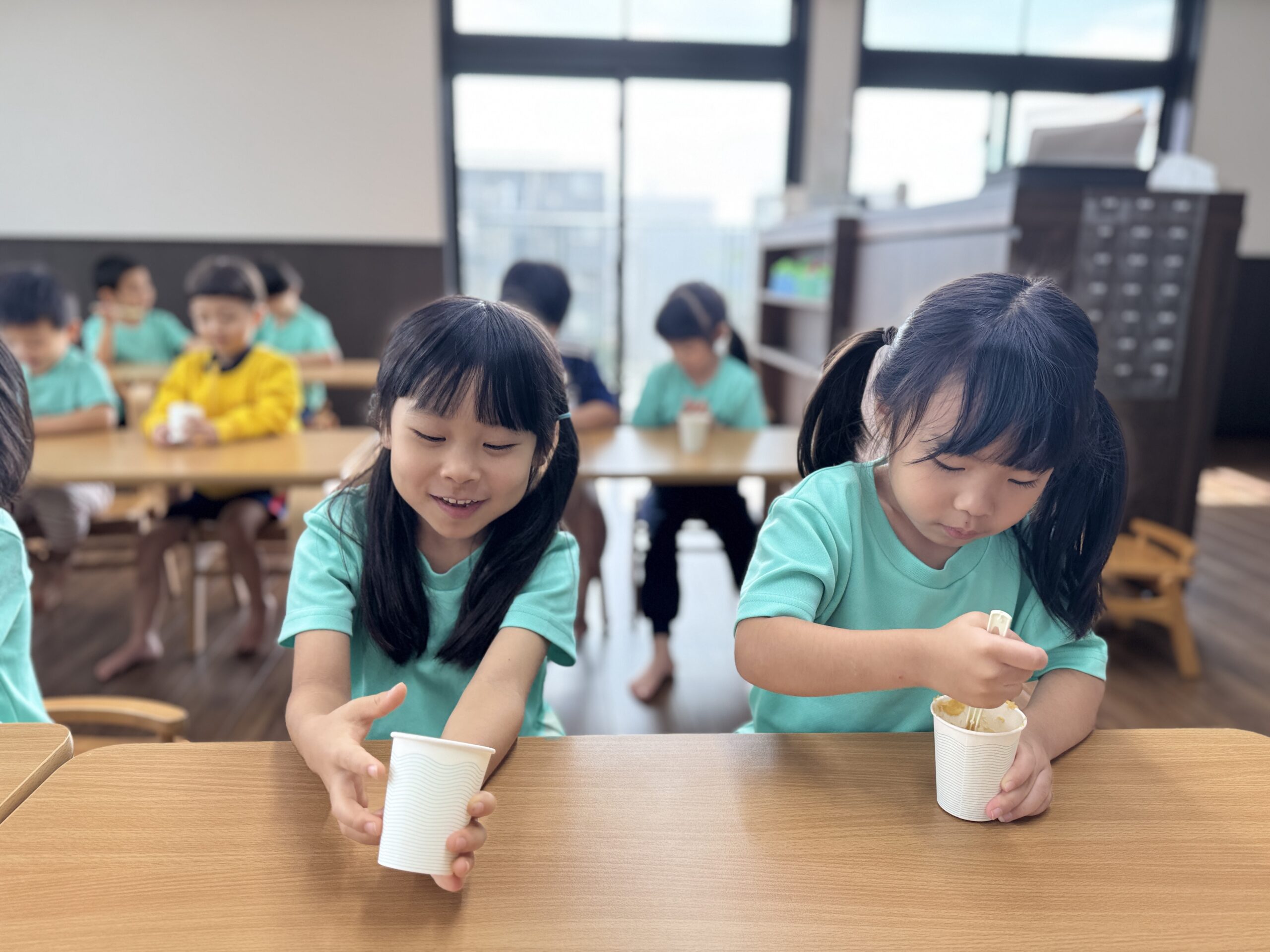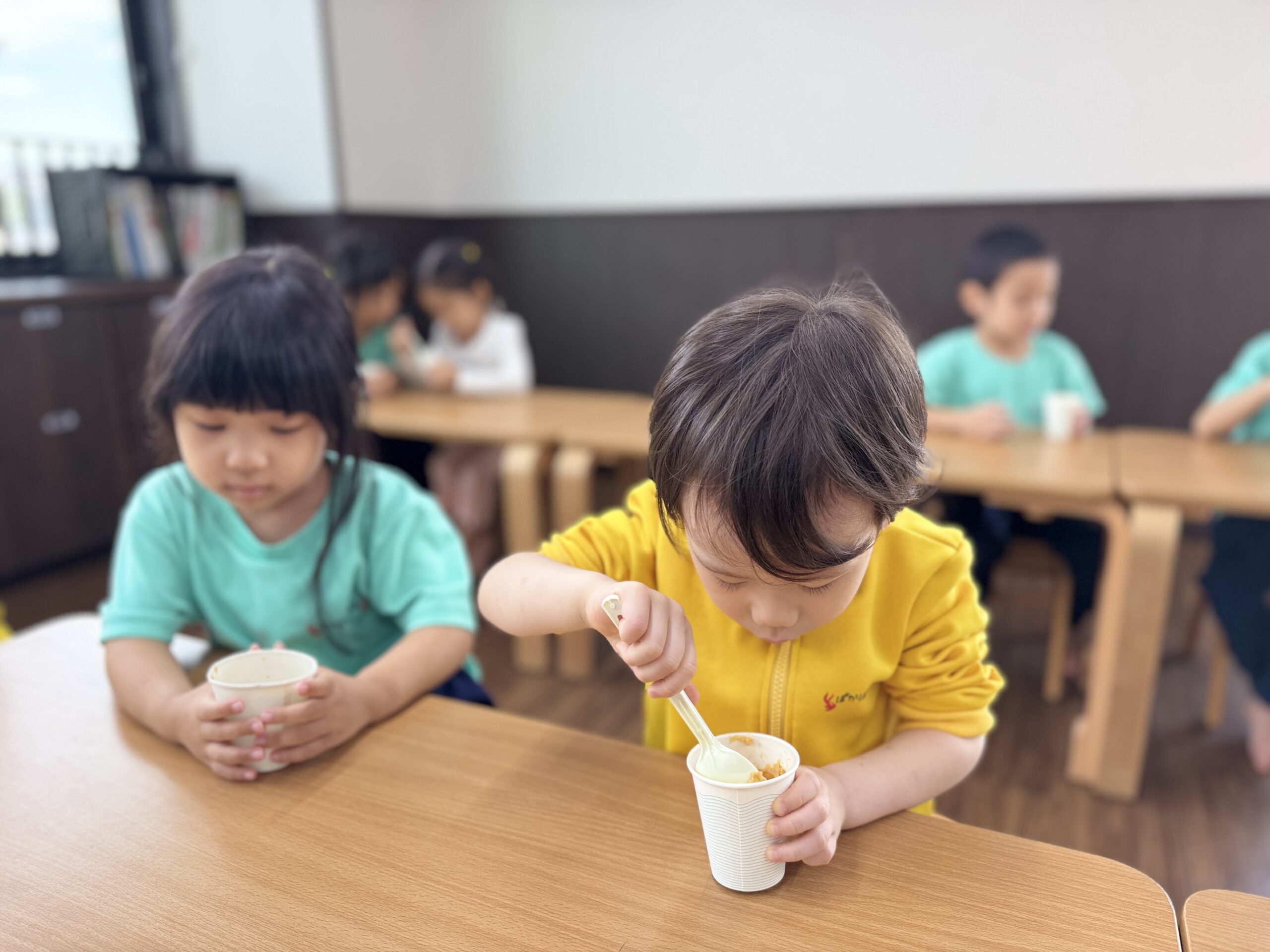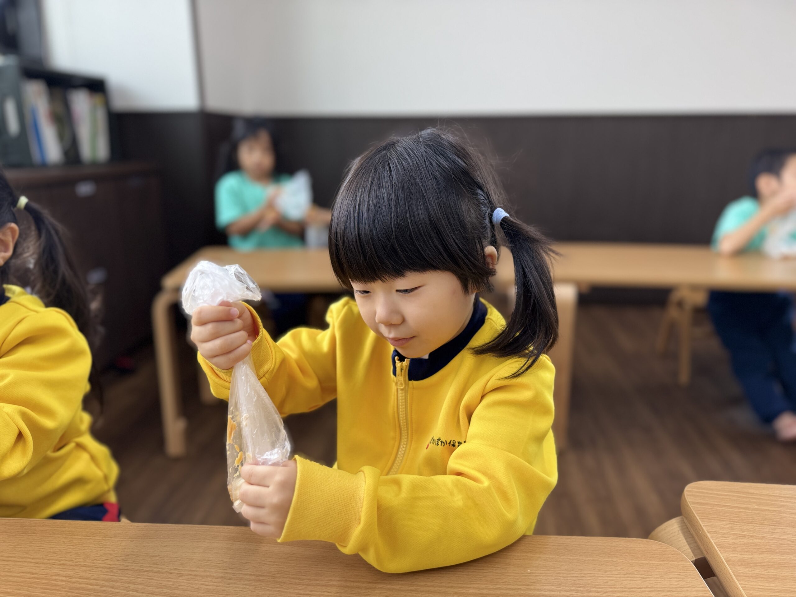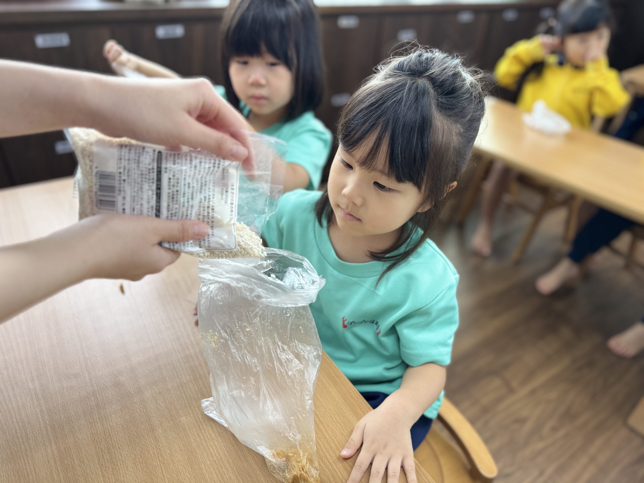 一人一人に配られた味噌のまずは匂いを嗅いでみます。「どんな匂いかな?」「何色かな?」等発見を促せられるような言葉がけをしていきます。子ども達からは「いい匂い!」「味噌汁みたい!」と声が上がりました。