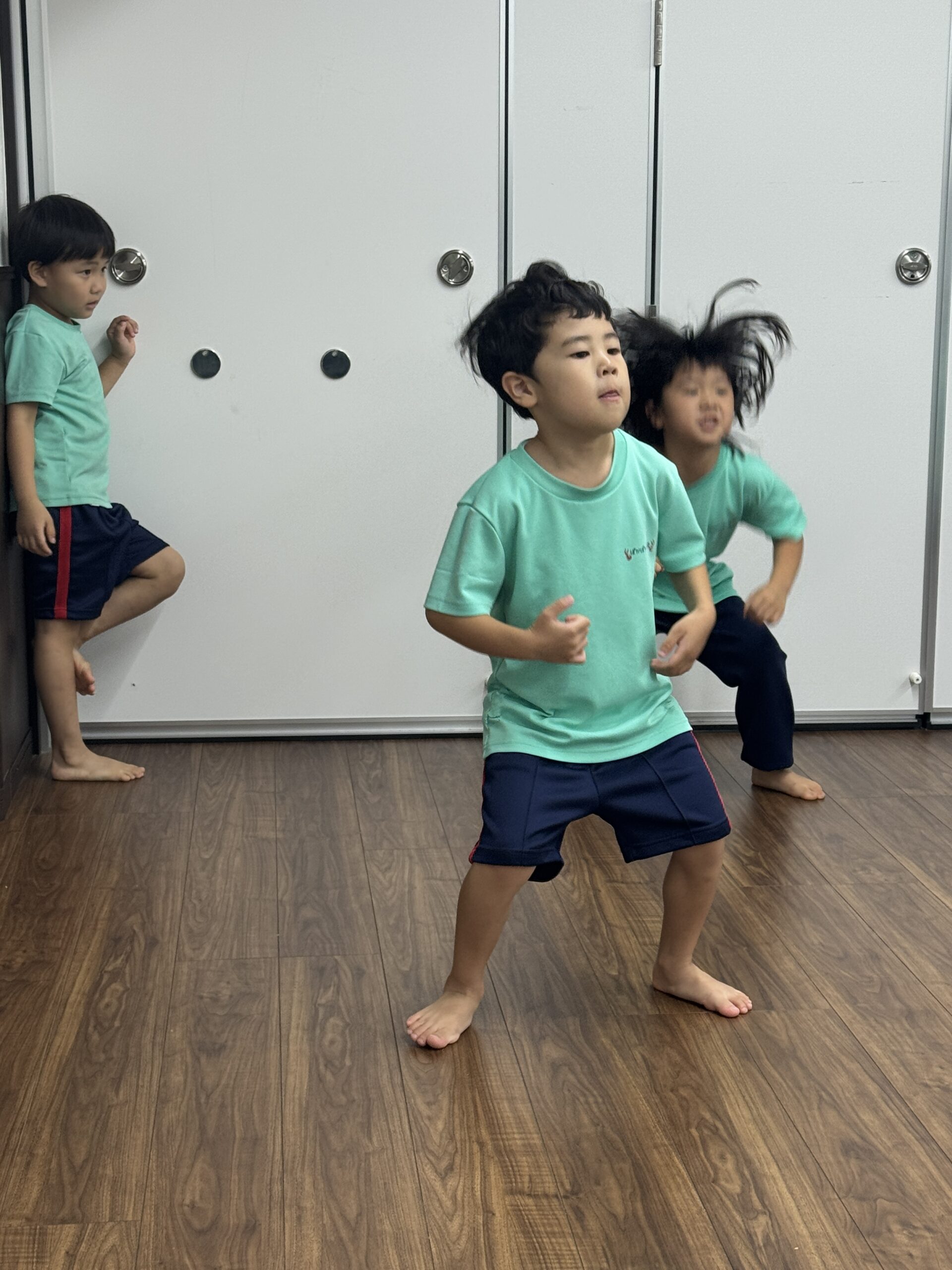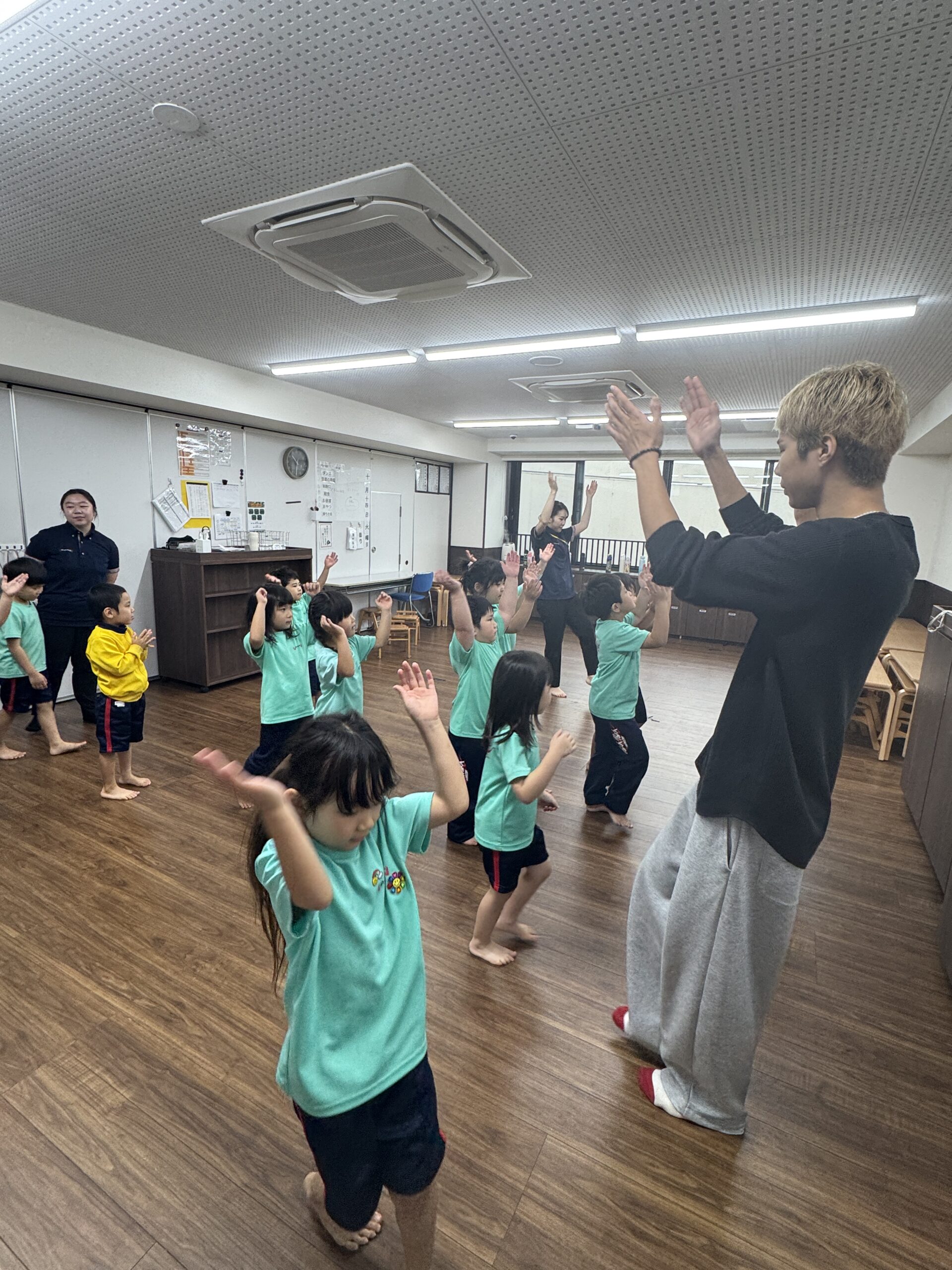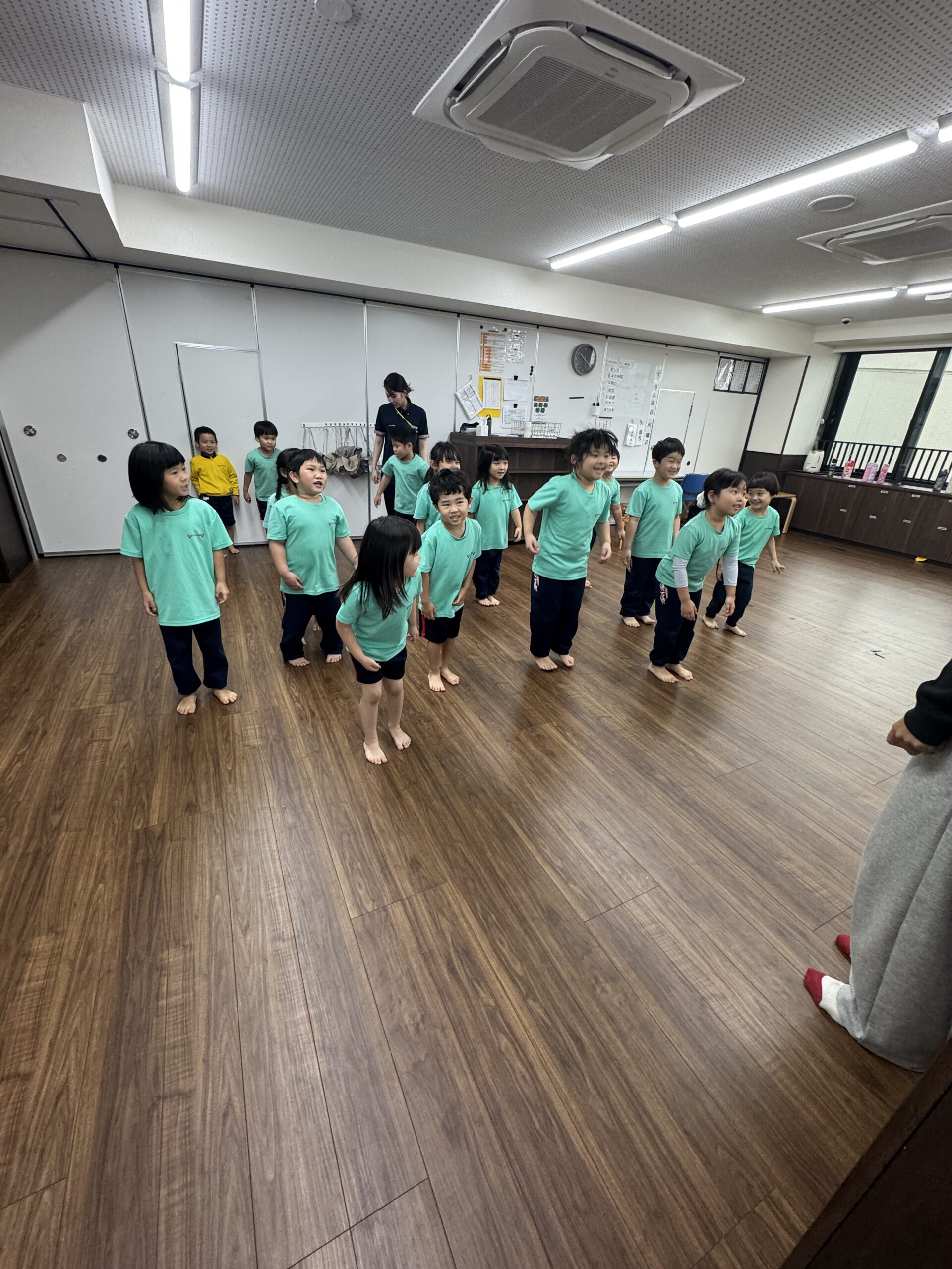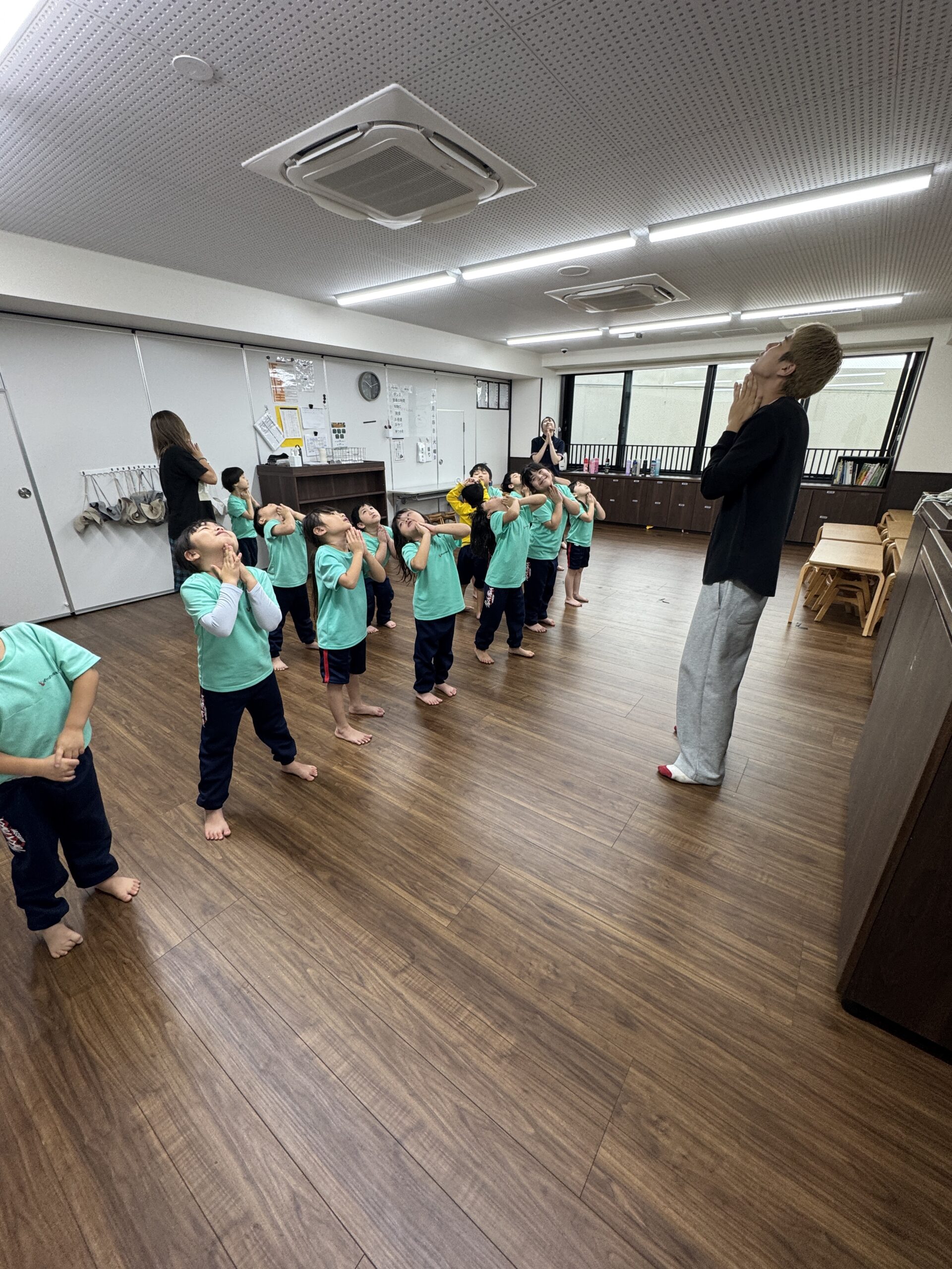 最初は戸惑っていた子どもたちも、すぐにコツを掴んで、「あはは!間違えちゃった!」「今度はできた!」と、楽しそうに脳トレをしていました。考える力と体を動かす力を同時に使うこの脳トレは、集中力や判断力を養うだけでなく、子どもたちの笑顔を引き出す素晴らしい活動となりました。脳トレで頭と体をほぐした後は、いよいよ本格的なダンスの練習です。ワクワクした表情で先生の動きを真剣に見つめていました。