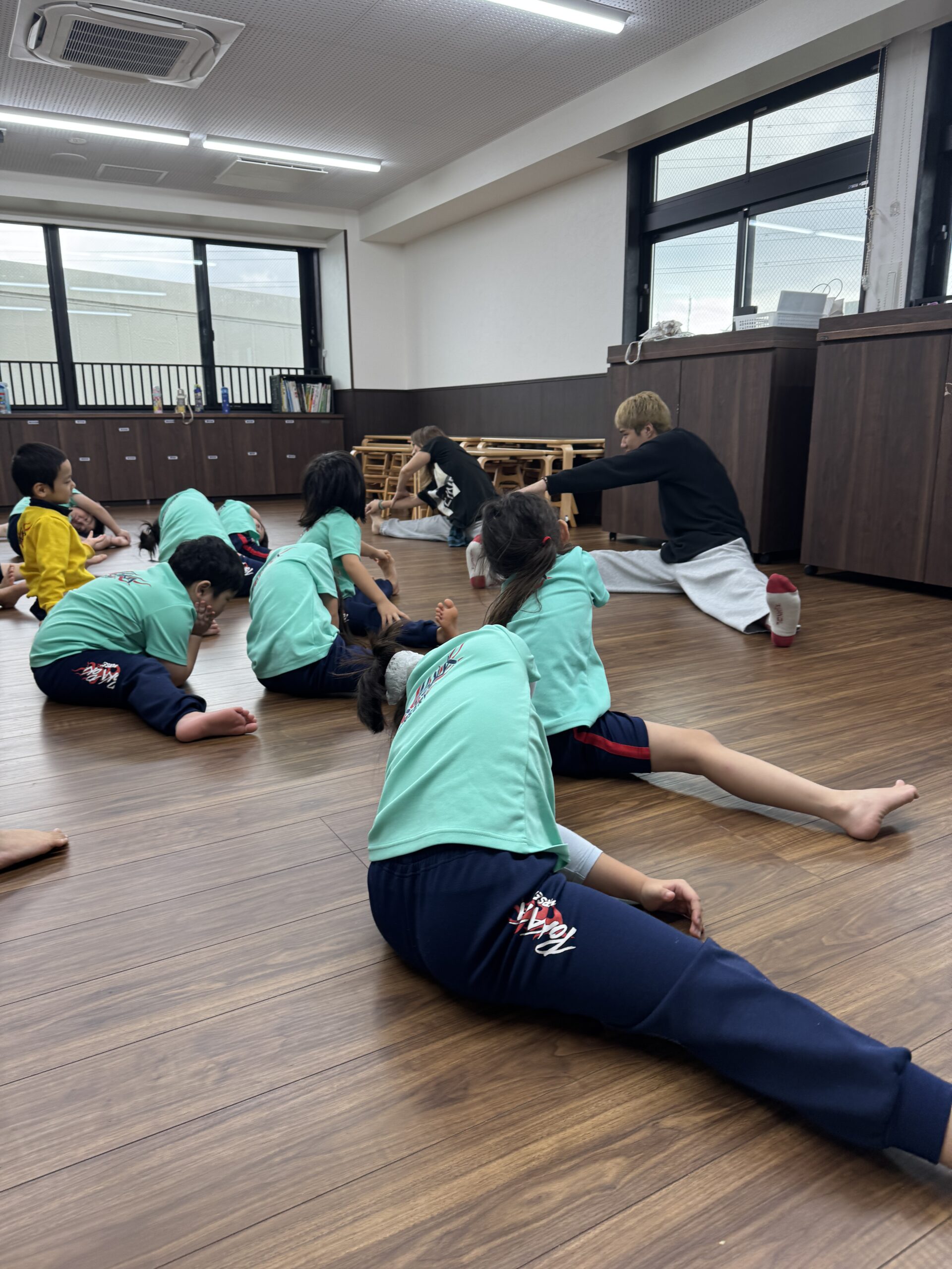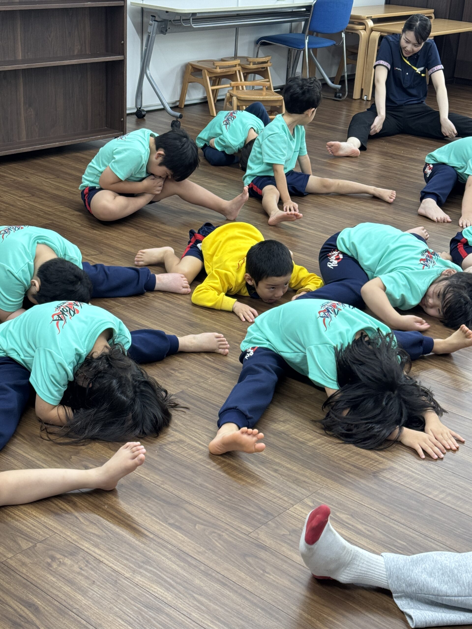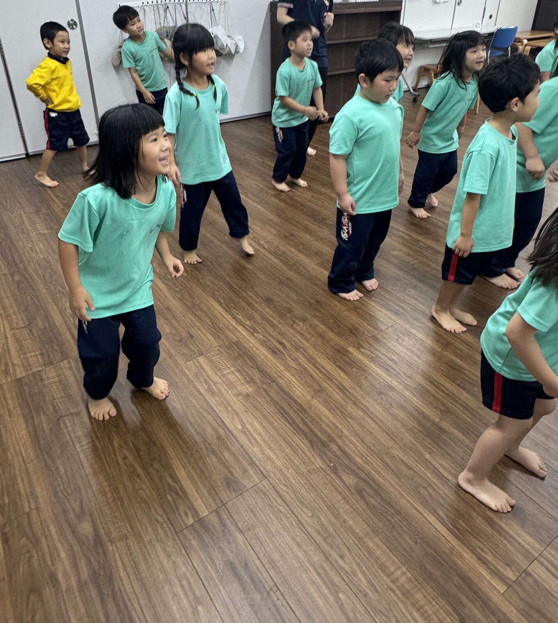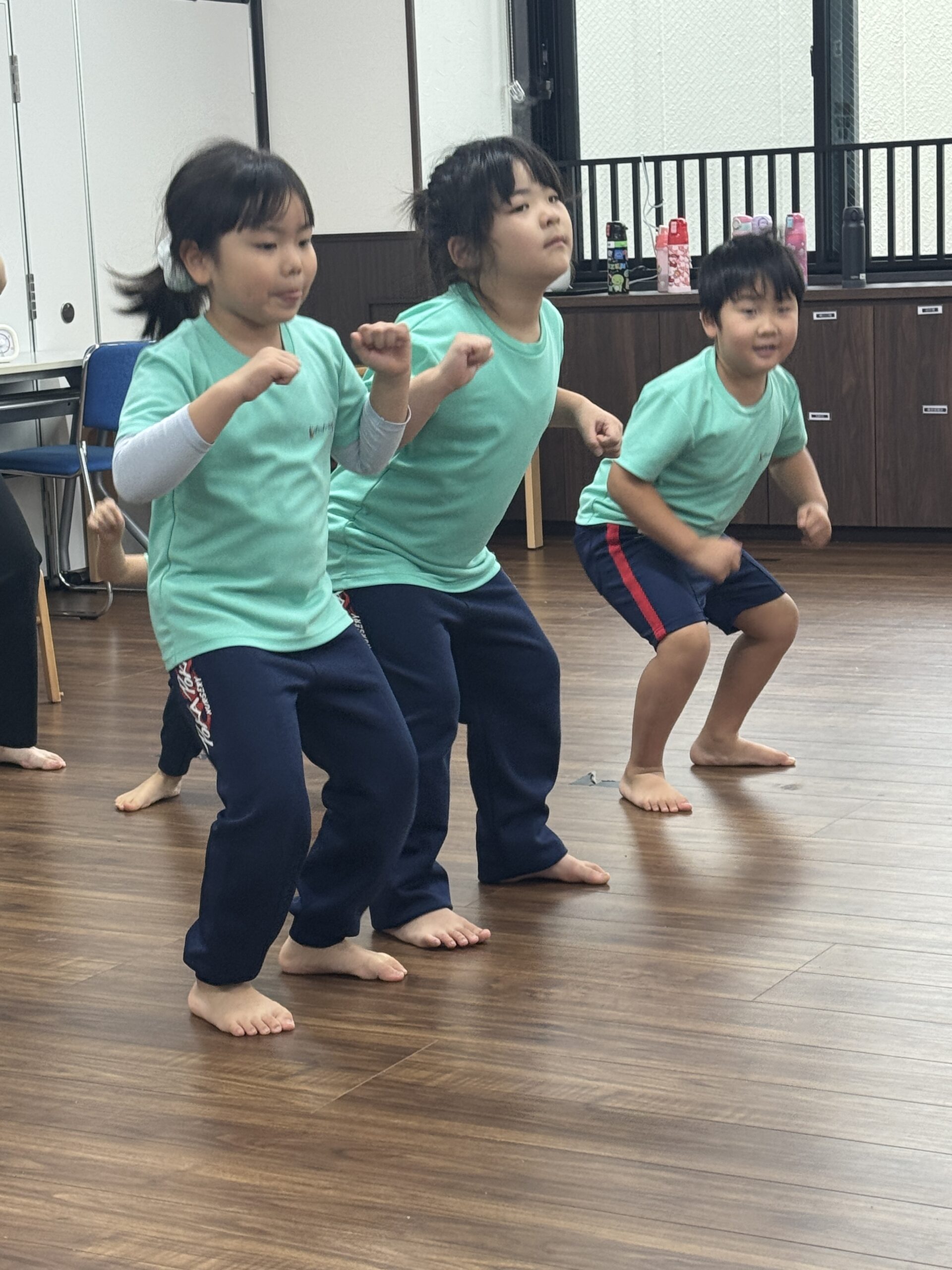 最初は戸惑っていた子どもたちも、すぐにコツを掴んで、「あはは!間違えちゃった!」「今度はできた!」と、楽しそうに脳トレをしていました。考える力と体を動かす力を同時に使うこの脳トレは、集中力や判断力を養うだけでなく、子どもたちの笑顔を引き出す素晴らしい活動となりました。脳トレで頭と体をほぐした後は、いよいよ本格的なダンスの練習です。ワクワクした表情で先生の動きを真剣に見つめていました。