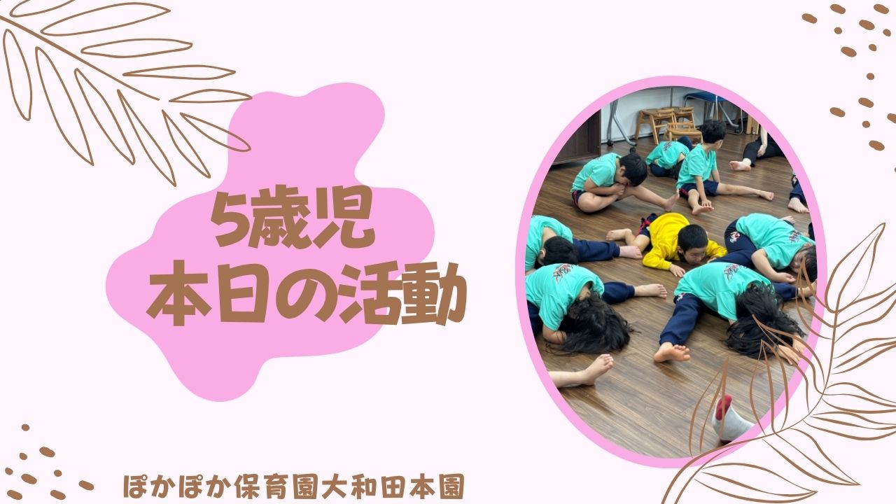少し雲の多い一日でしたが、ぽかぽか保育園の保育室には、いつもと変わらぬ子どもたちの明るい笑顔と活気が溢れていましたよ!今日は、5歳児さんにとって、週に一度のお楽しみ、ダンスの時間でした。まずは、体をほぐすウォーミングアップからスタートです。腕を回したり、足を伸ばしたり、音楽に合わせて体を動かして、ダンスに向けて準備をしました。