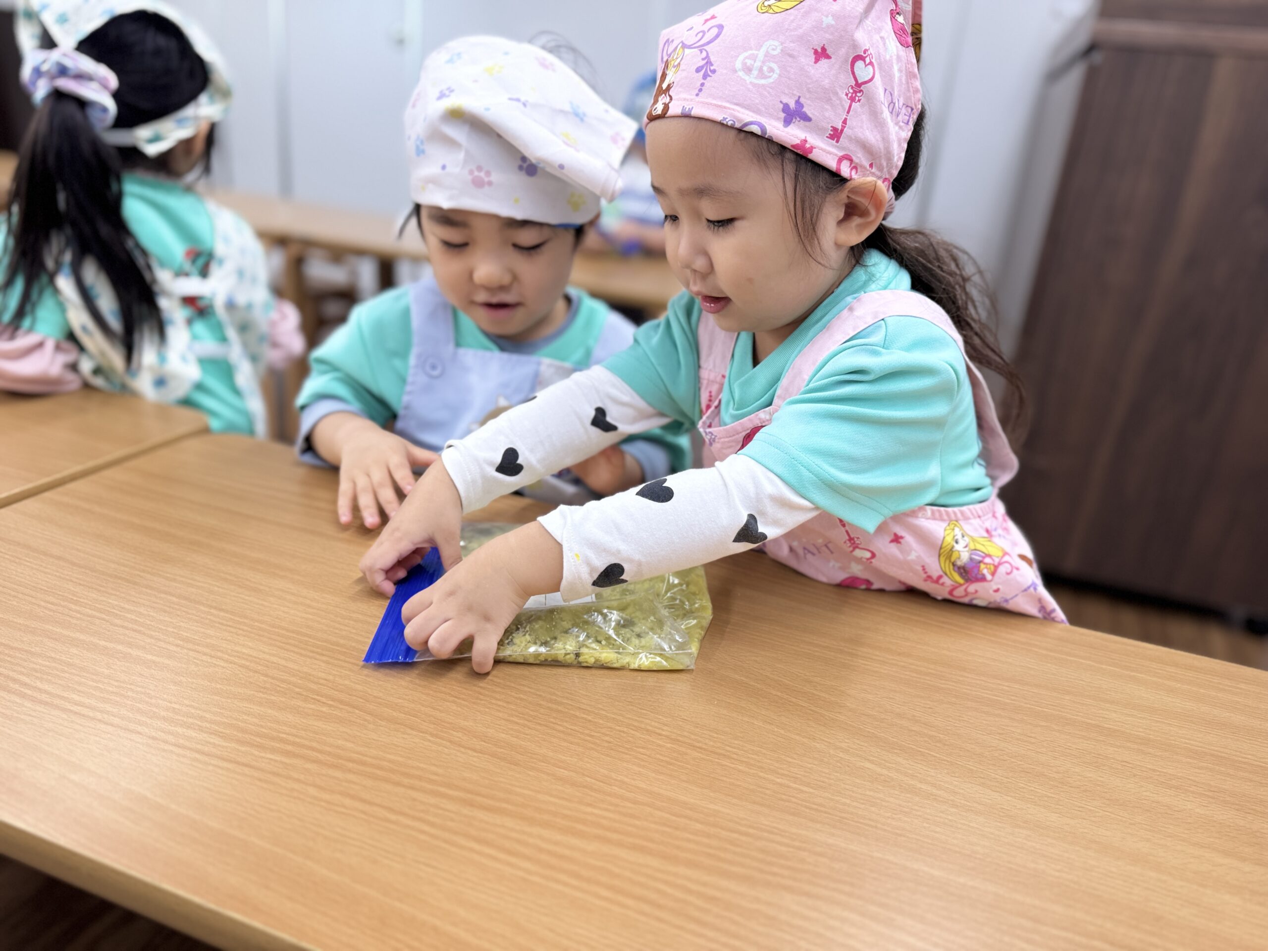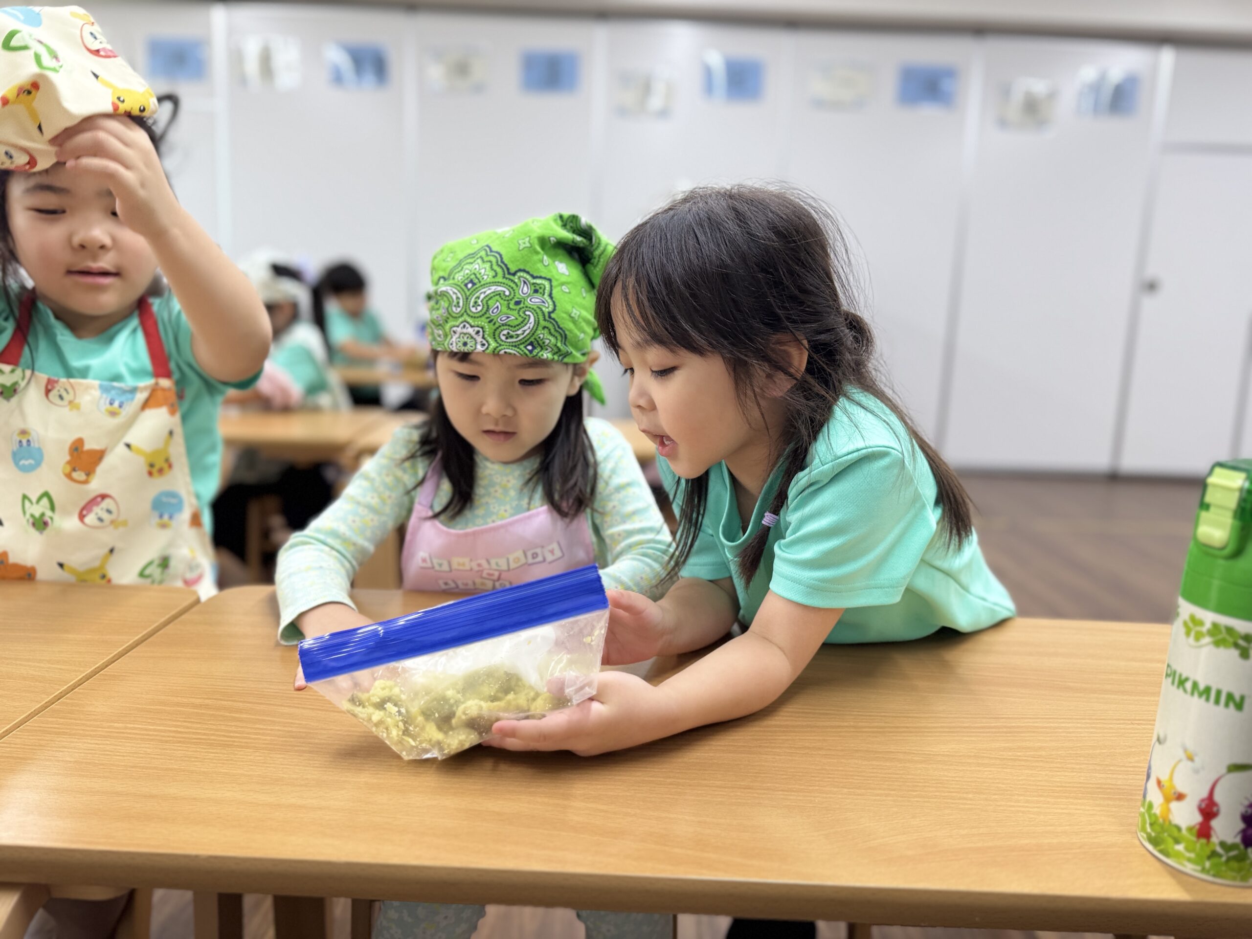 どうやったら上手につぶれるか、試行錯誤しながらクッキングを進めていきます。