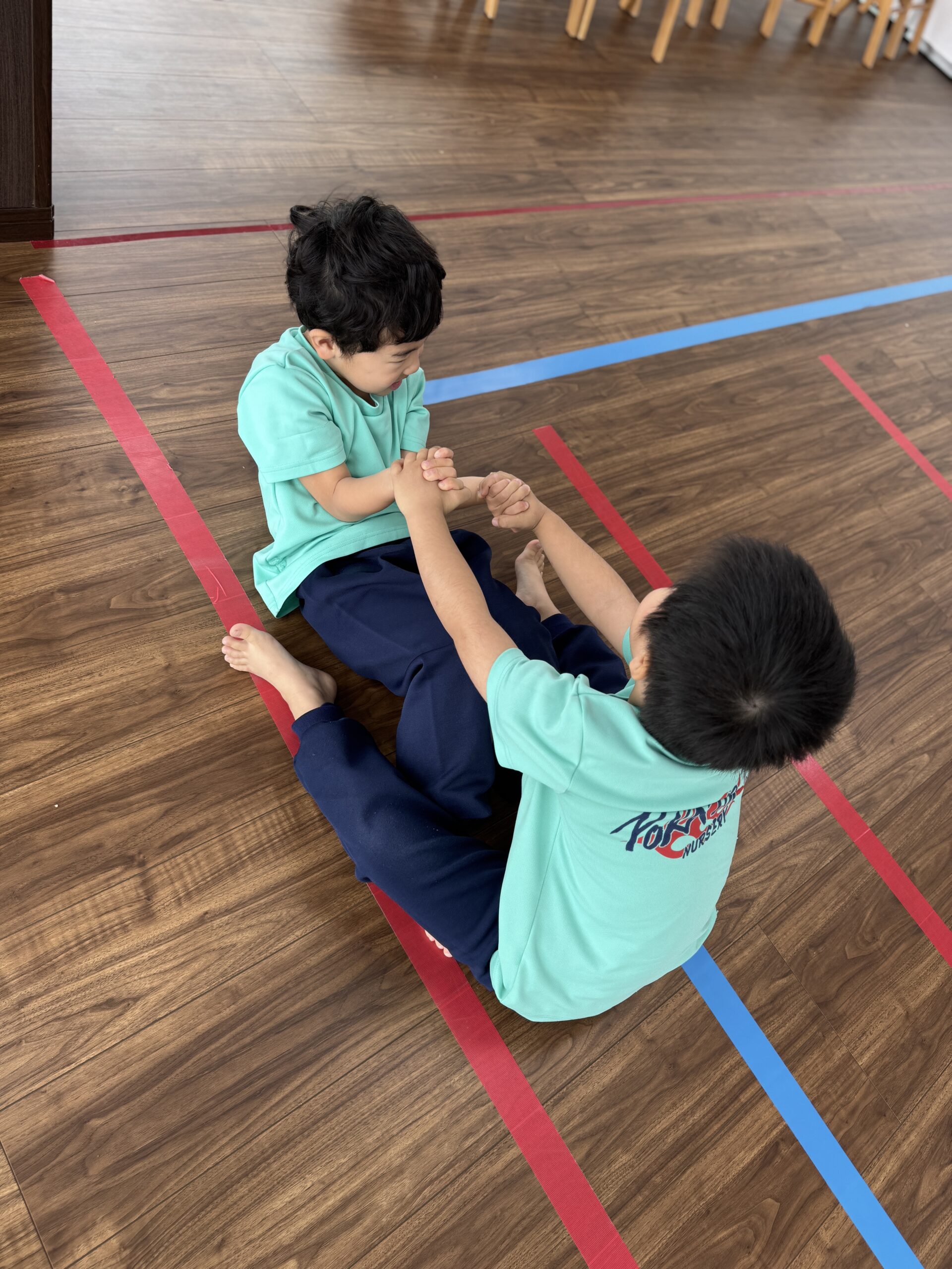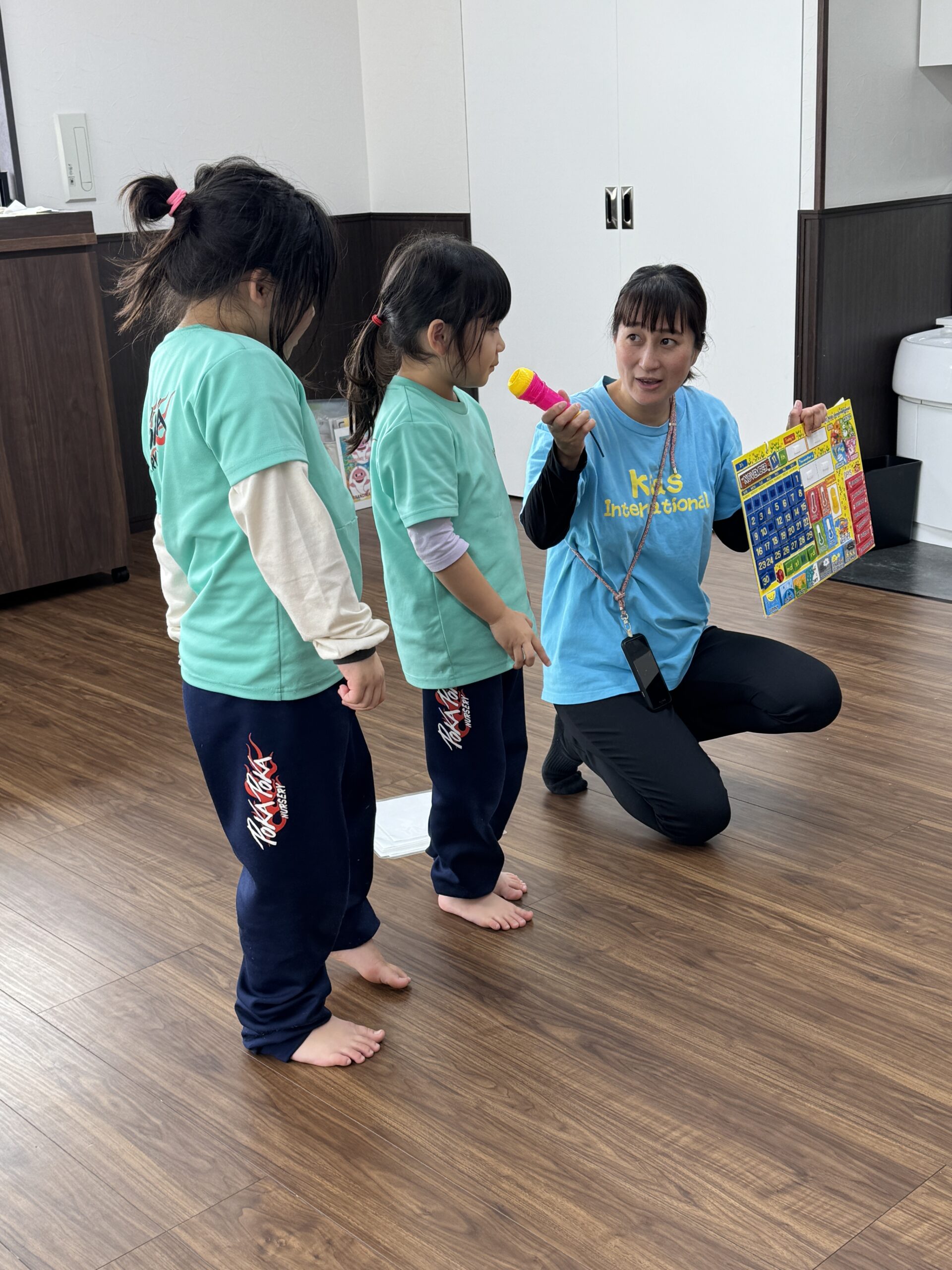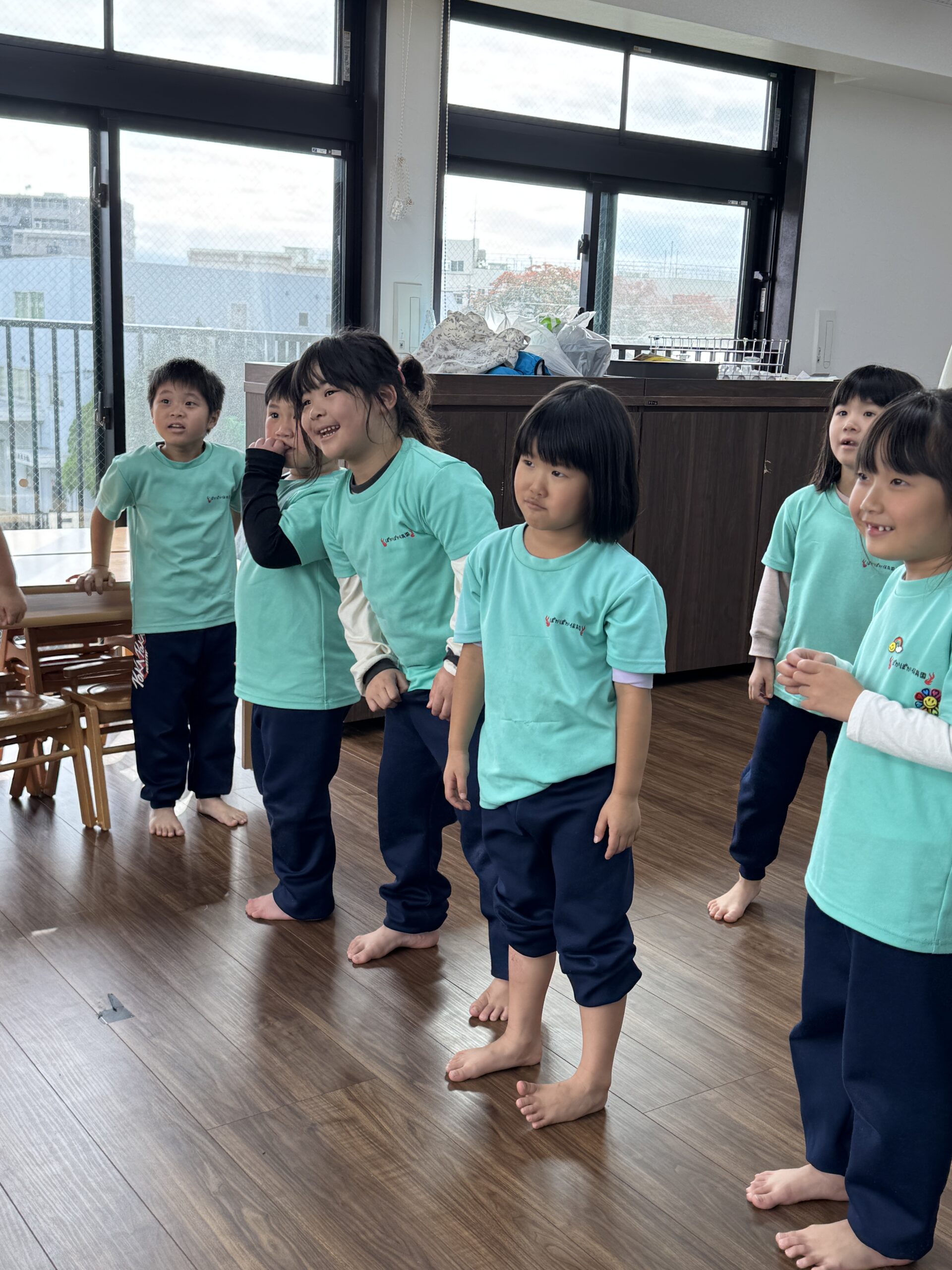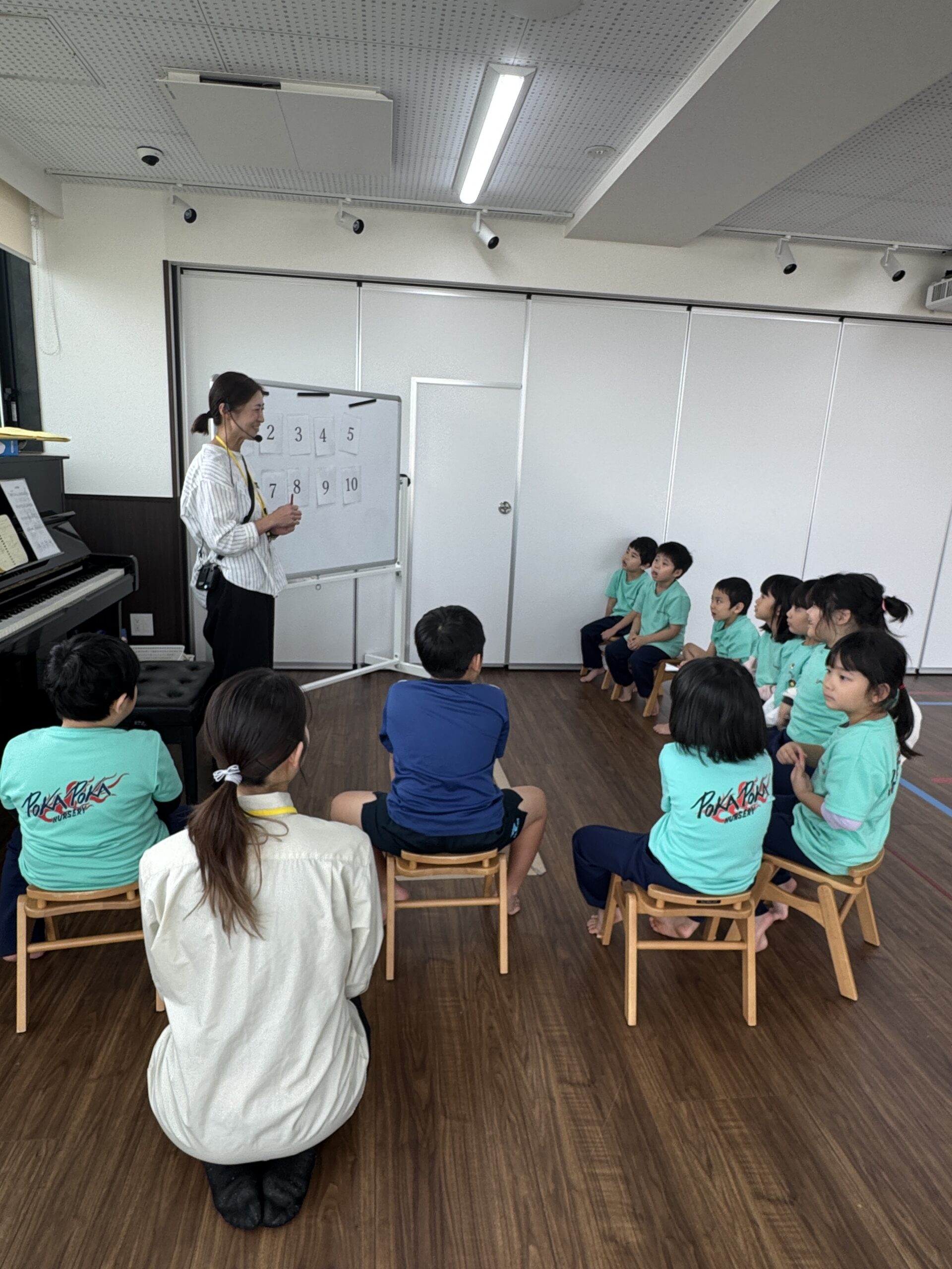 ダンスで体が温まった後は、心に響く音楽の時間です。今日は、子どもたちにとって初めての「ハモリ」の練習に挑戦しました!先生が「今日はね、いつもの歌に、もう一つ違う声のメロディーを重ねて歌ってみようか」と説明すると、子どもたちは「ハモリってどんな音だろう?」と興味津々。