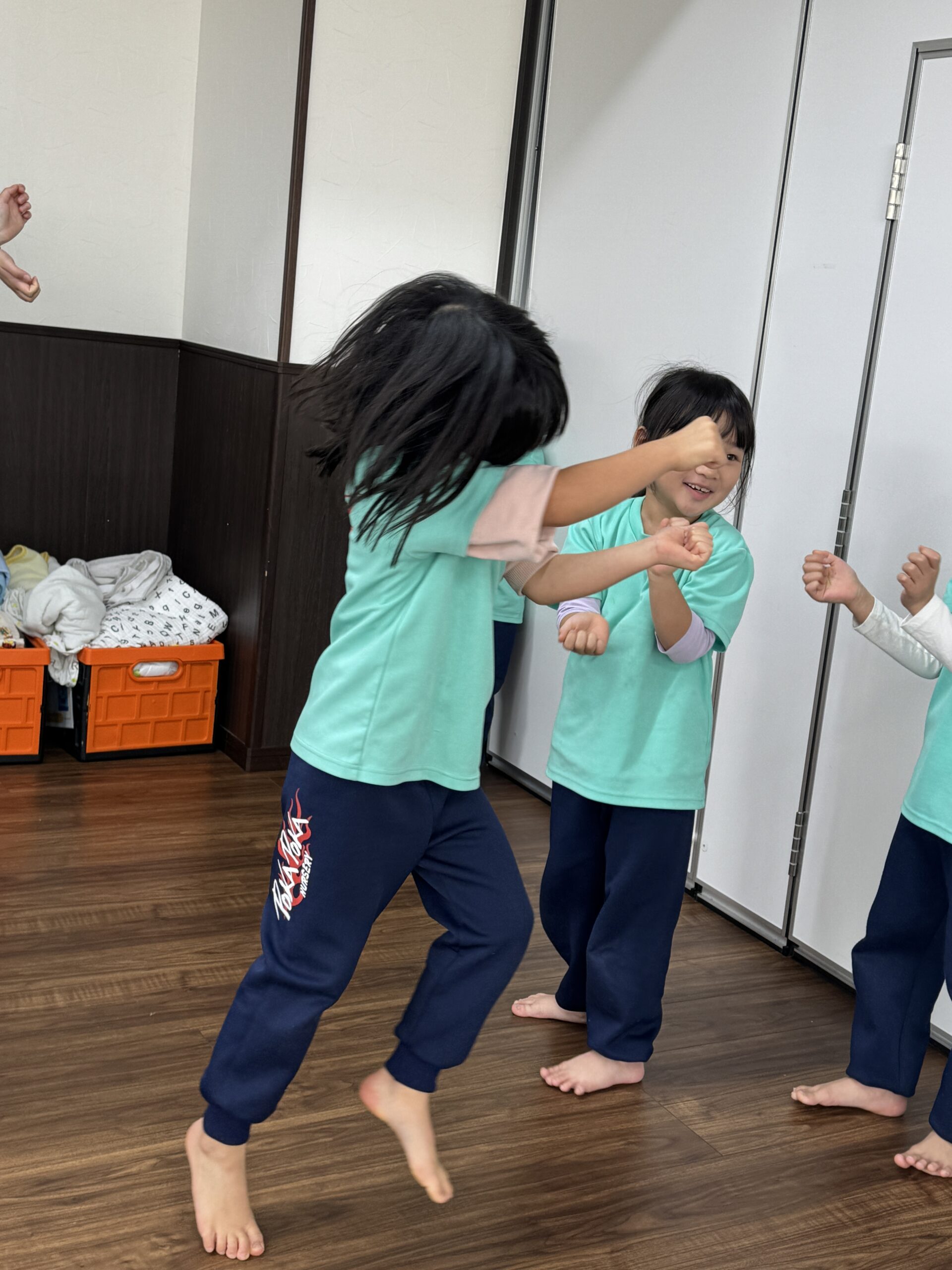 午前中は、みんなが大好き!ダンスの時間です。子どもたちは笑顔でリズムに乗って体を動かし始めます。速いリズム、ゆっくりなリズム、様々な変化に合わせて、全身を大きく使って表現していました。