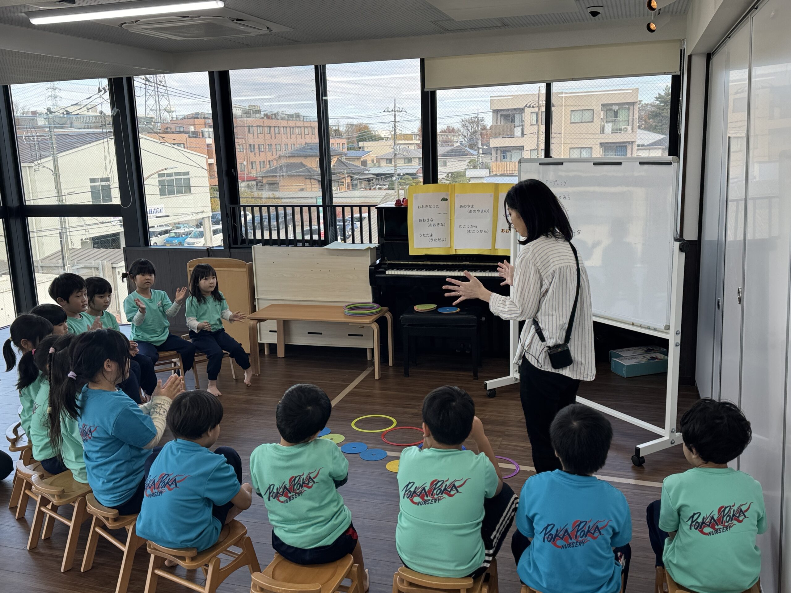 ダンスで体を動かし、集中力を高めた後は、いよいよ音楽の時間です!今日は、クリスマスの話題で盛り上がりました。最初の自己紹介では、一人ひとりが「クリスマスに欲しい物」をリズムに合わせて発表しました。リズムに合わせて元気いっぱいに発表する子どもたちの声が、保育室に響き渡りました。