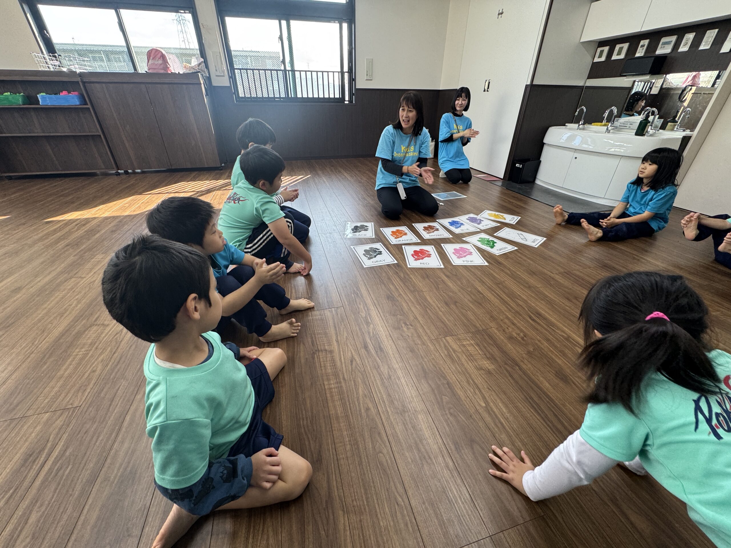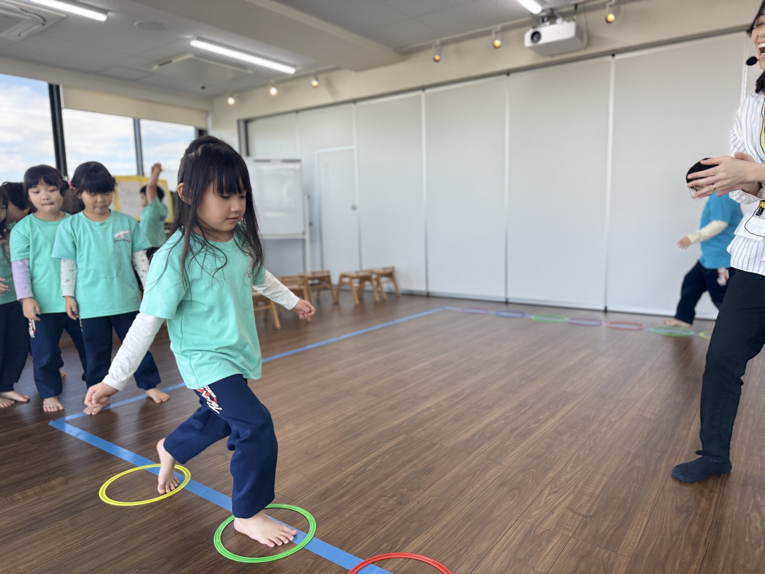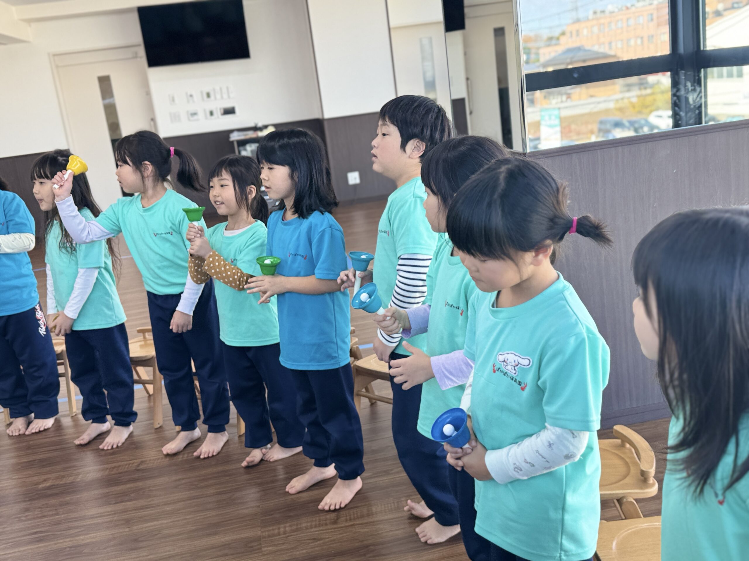 その後は、「リズムロード」を歩いて、様々なリズムパターンを全身で感じたり、ハンドベルを使って「きらきら星」の演奏に挑戦しました。先生の合図に合わせて順番に音を出す練習を重ねるうちに、だんだんと美しい「きらきら星」のメロディーが奏でられるようになりました。子どもたちは、自分たちの手で音を創り出す喜びを感じながら、音楽の楽しさに深く親しむことができました。