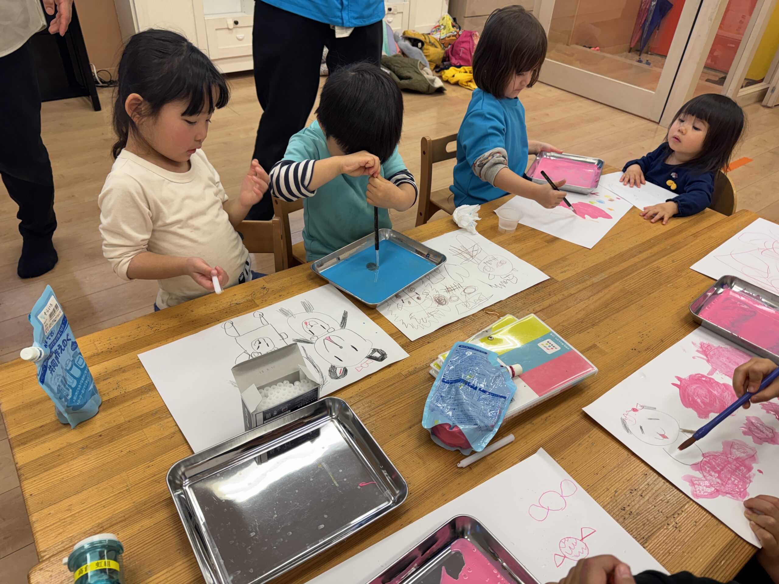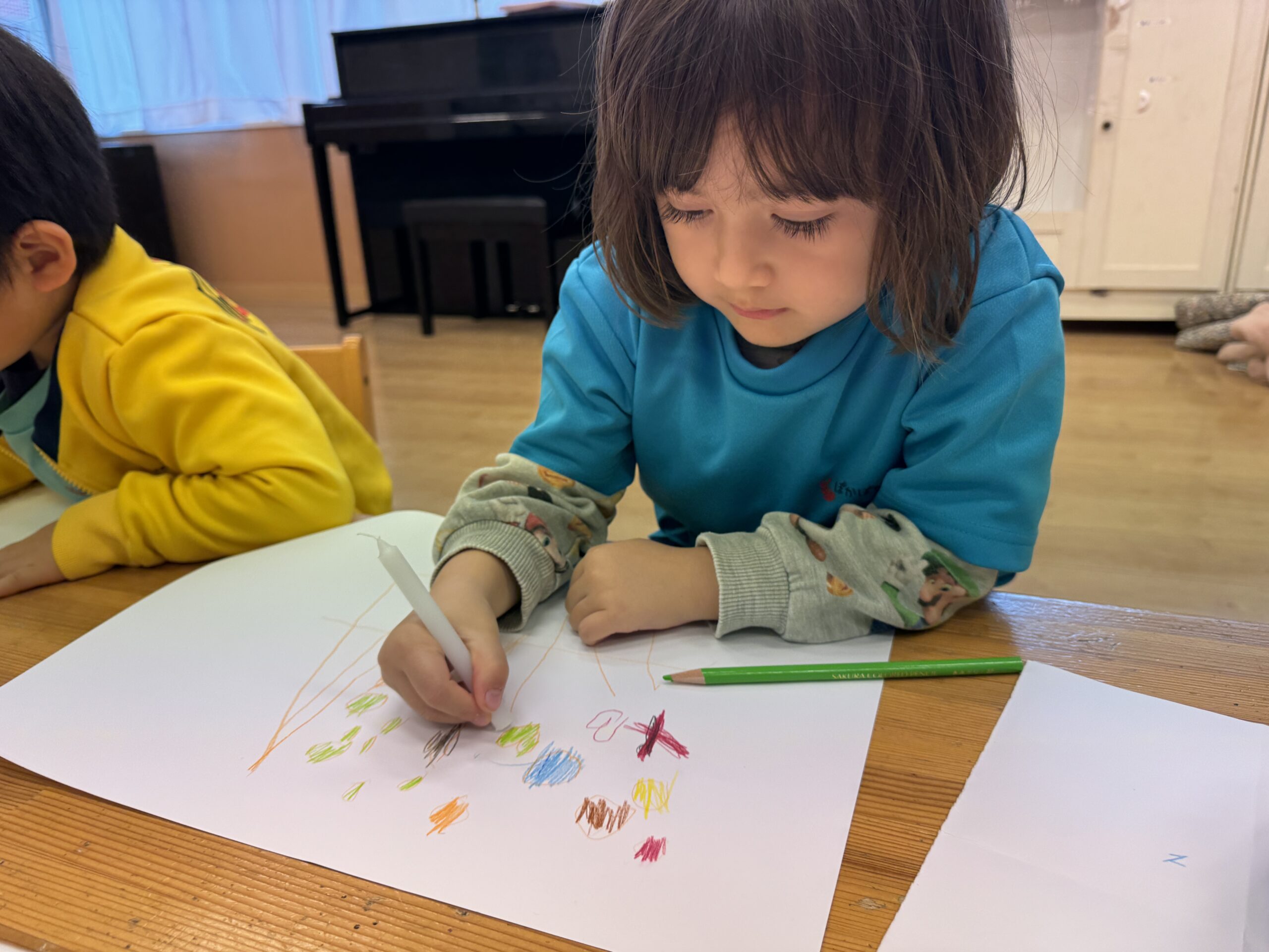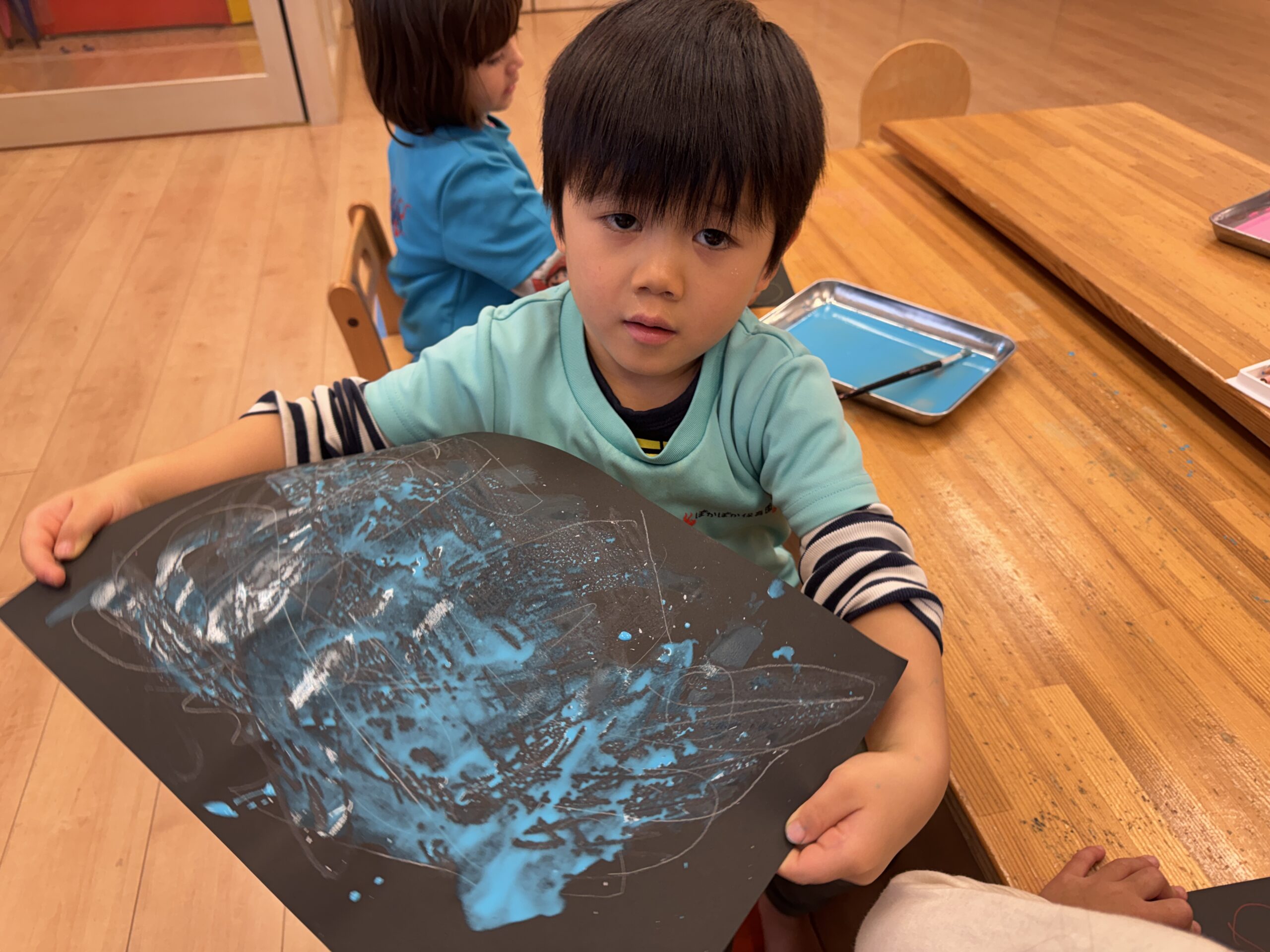 ろうそくのはじき絵をしてみたんだ!みんなは「どんなふうにやるの?」との質問に先生が説明をしてくれたので、順番に絵を描いて、ろうそくで塗って、絵の具で塗り上げると、、ほらね!はじき絵の出来上がり~~!