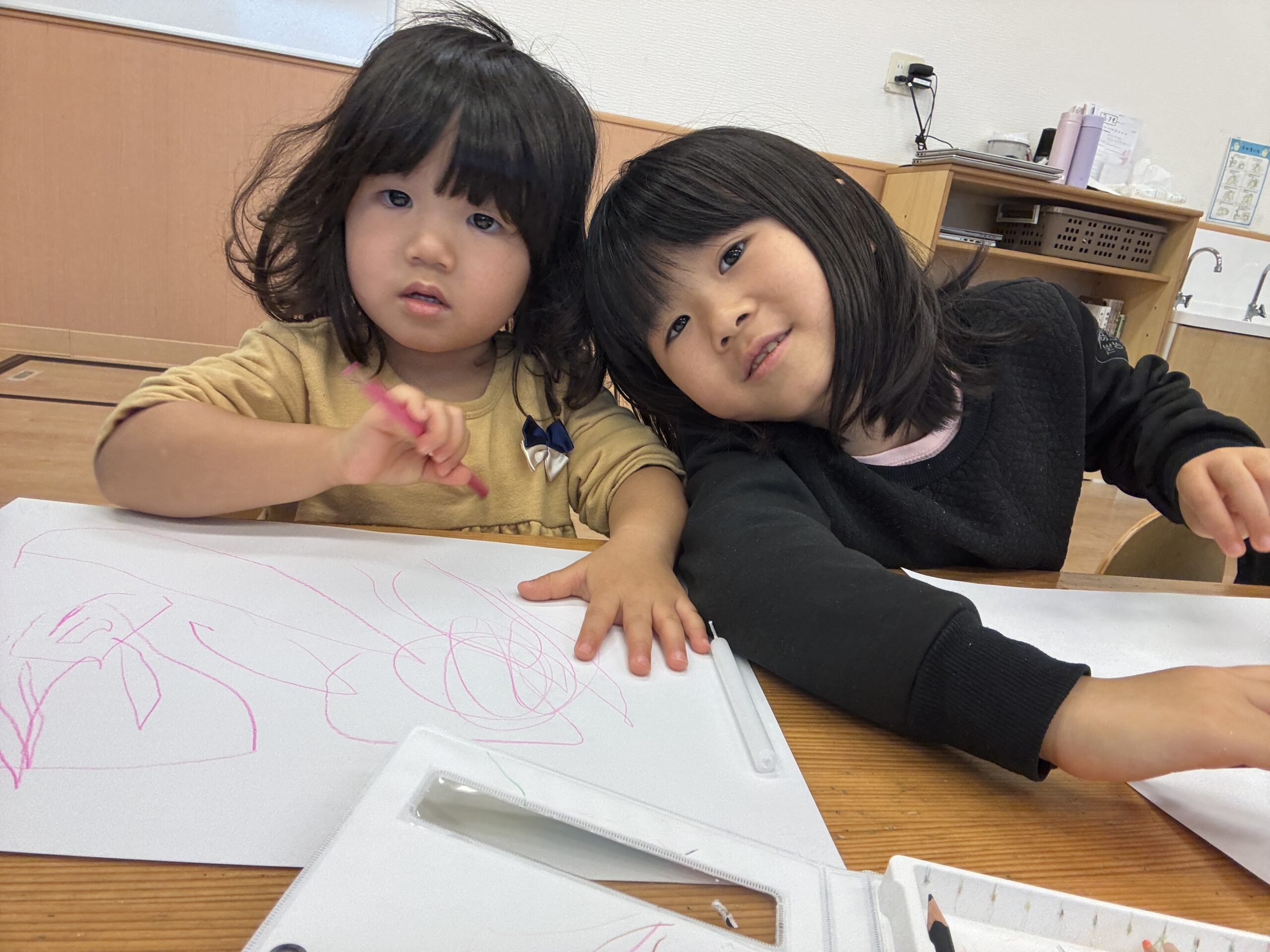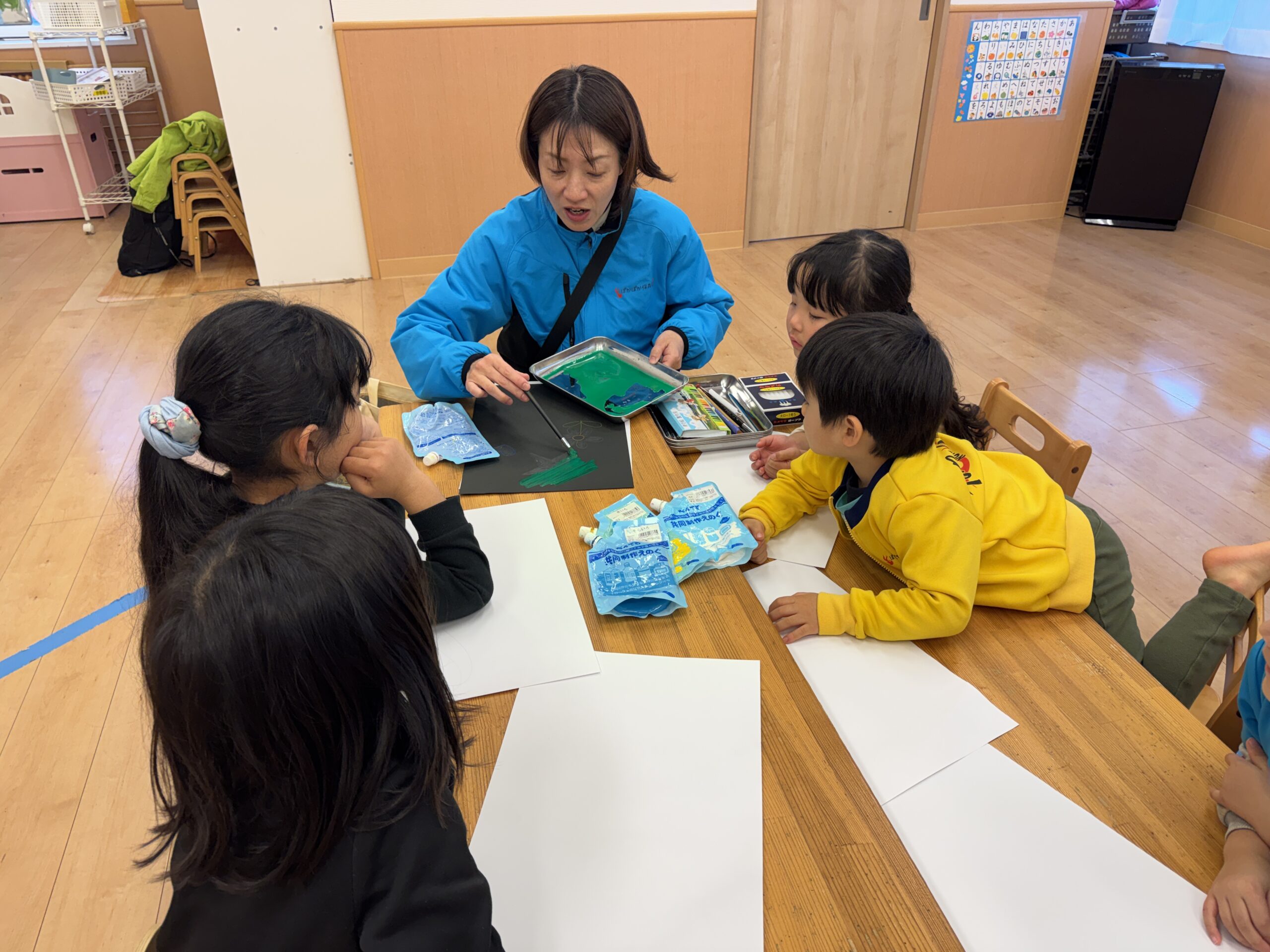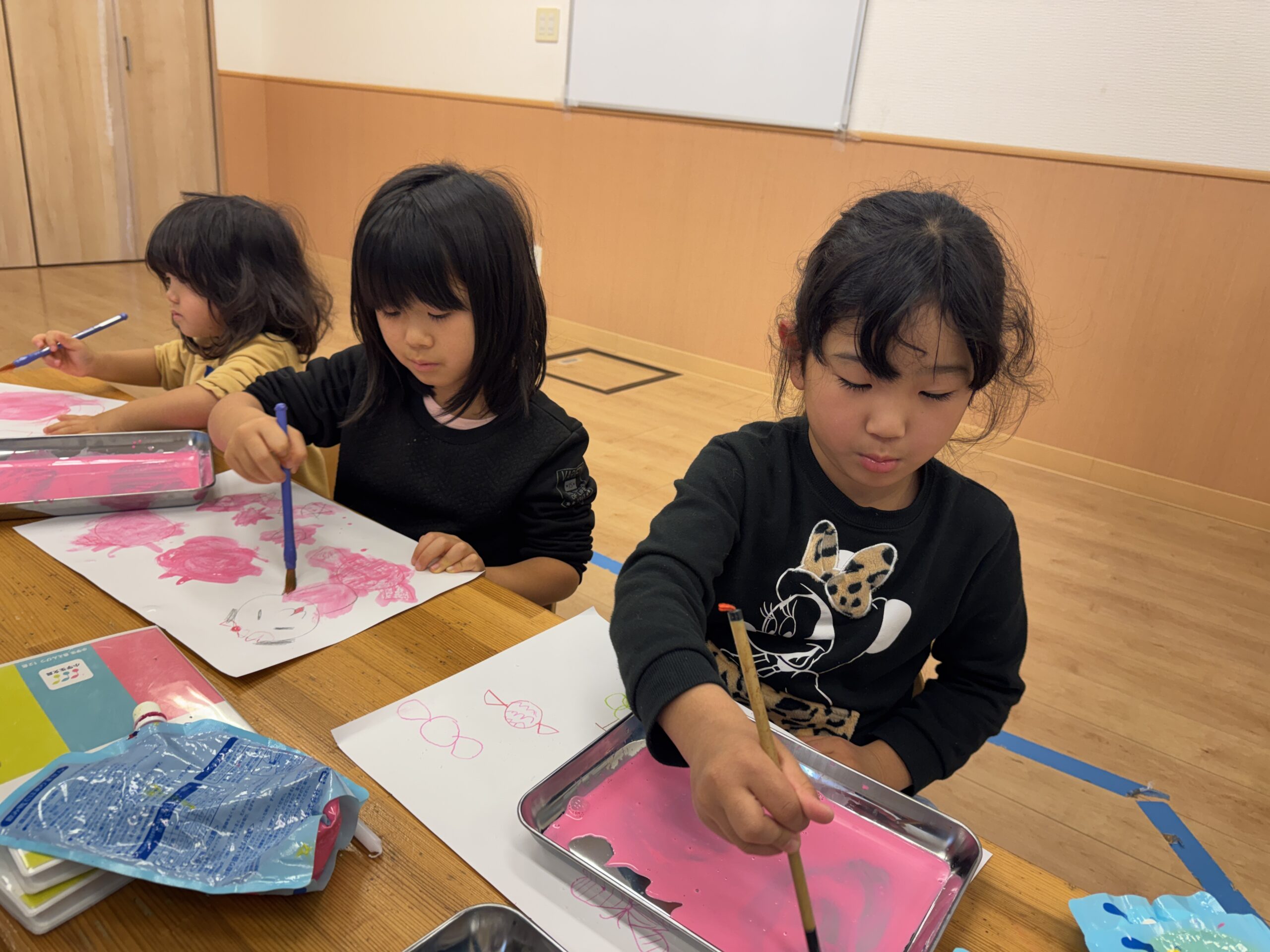 ろうそくのはじき絵をしてみたんだ!みんなは「どんなふうにやるの?」との質問に先生が説明をしてくれたので、順番に絵を描いて、ろうそくで塗って、絵の具で塗り上げると、、ほらね!はじき絵の出来上がり~~!