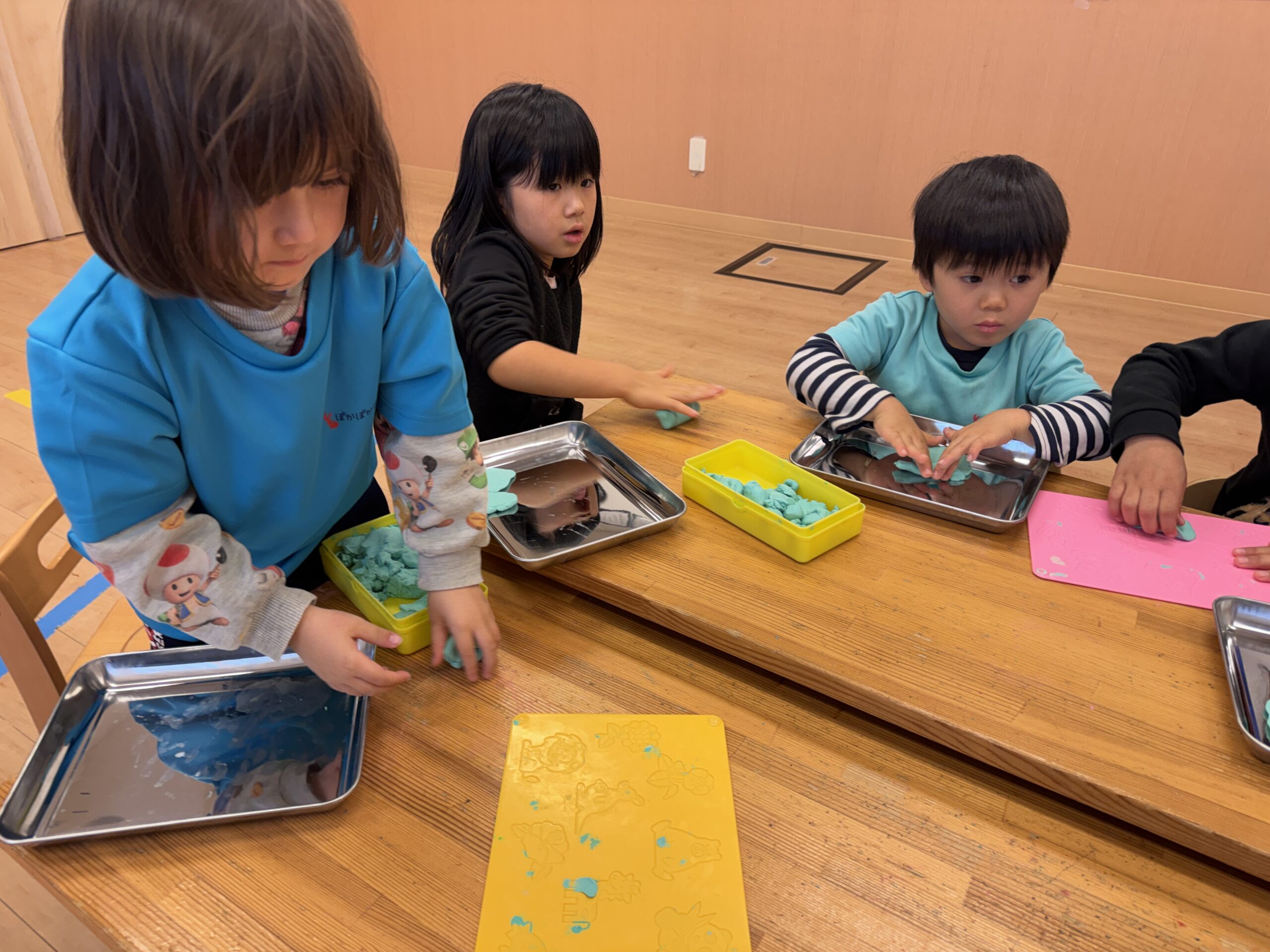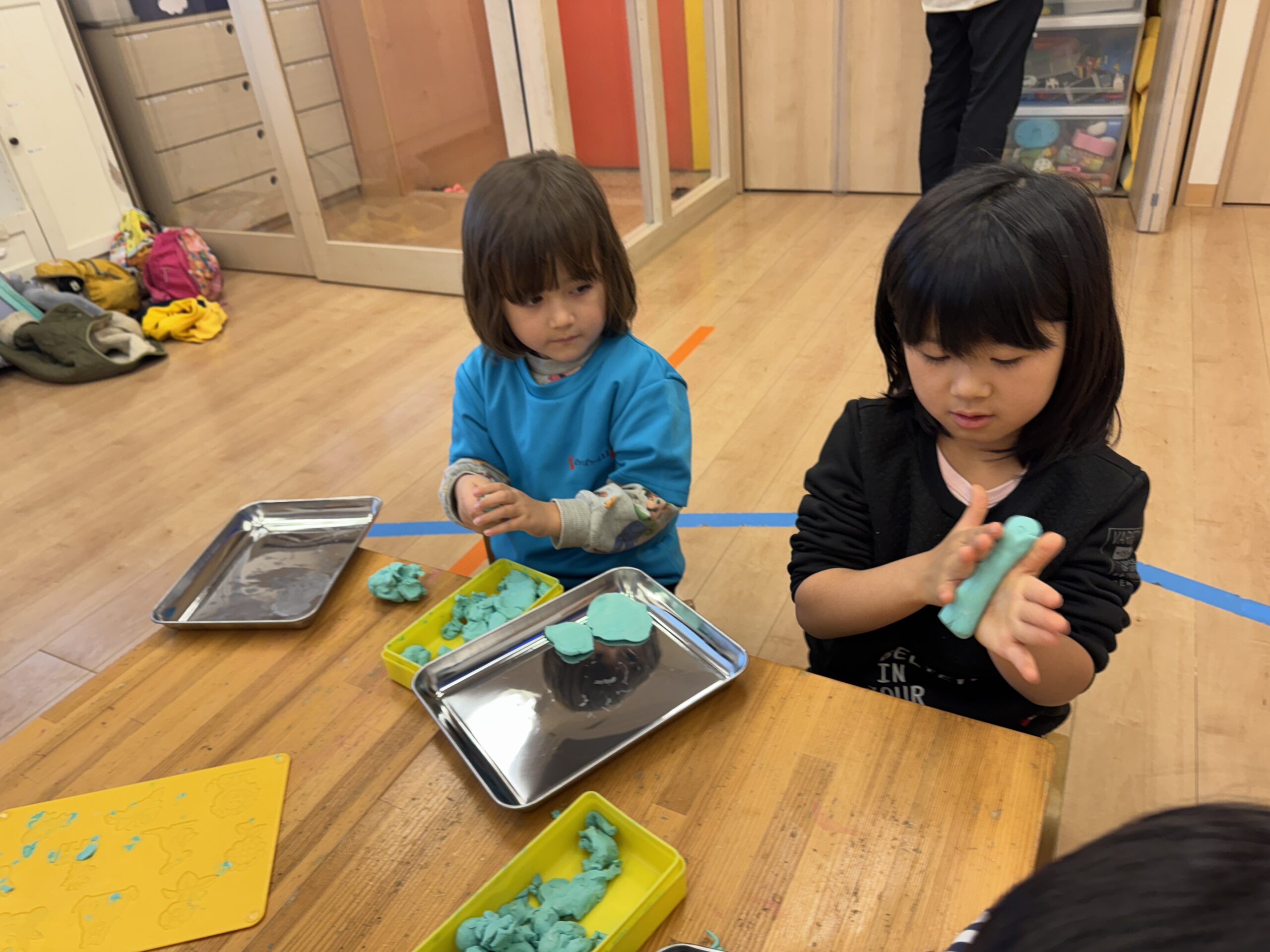 先に終わったお友だちは粘土遊びをしたよ。先生にお弁当を作ってあげたんだ!