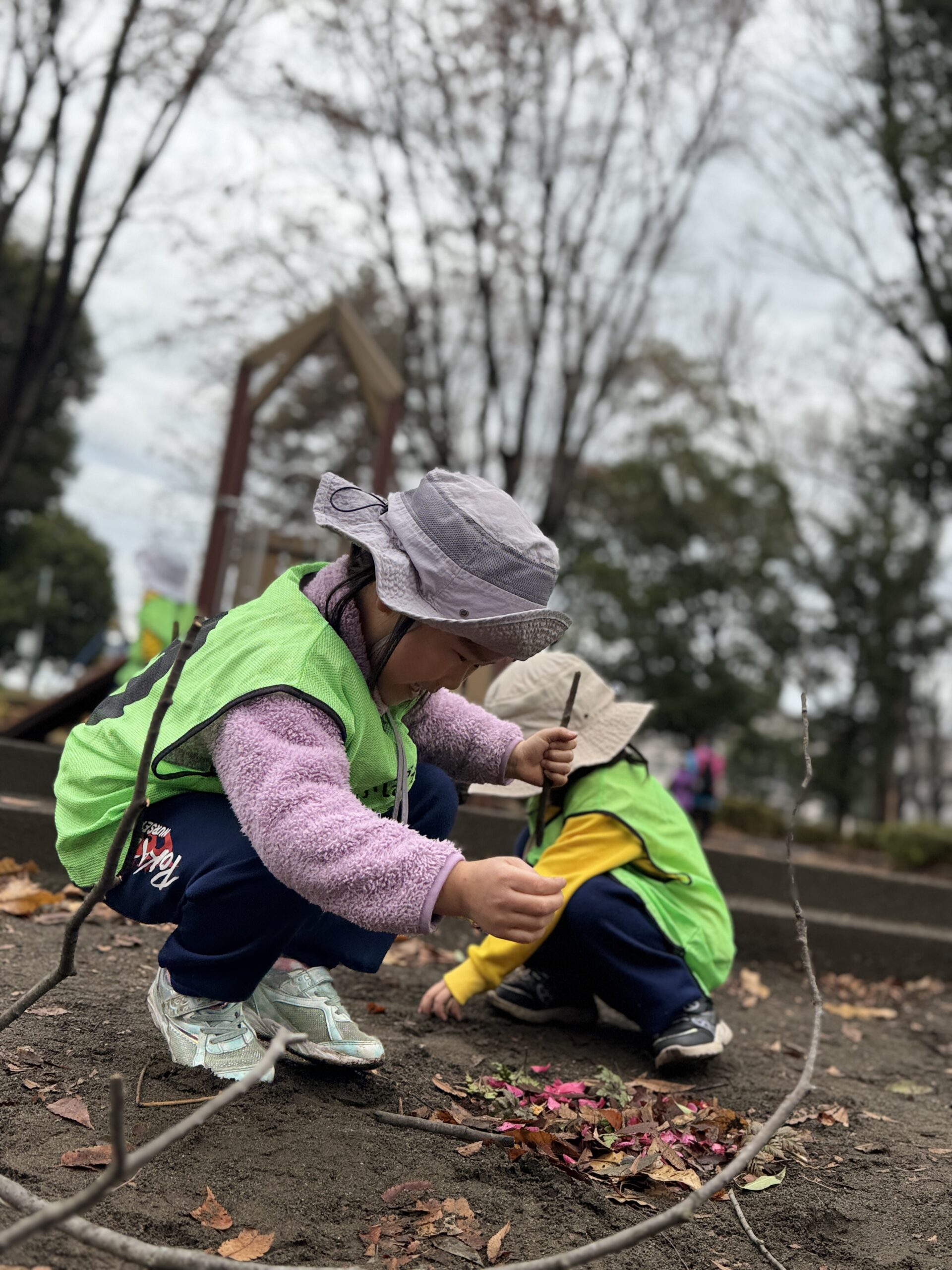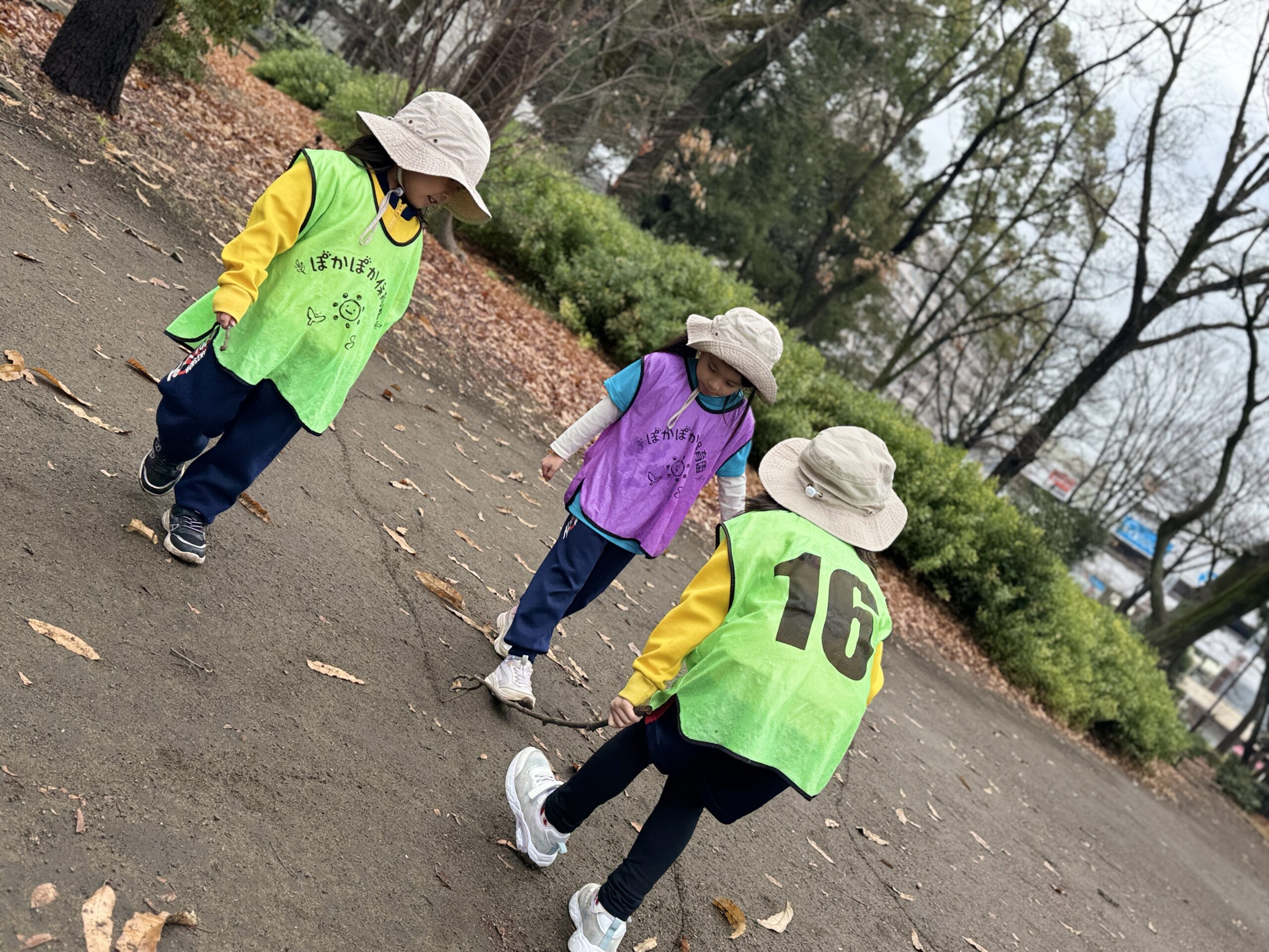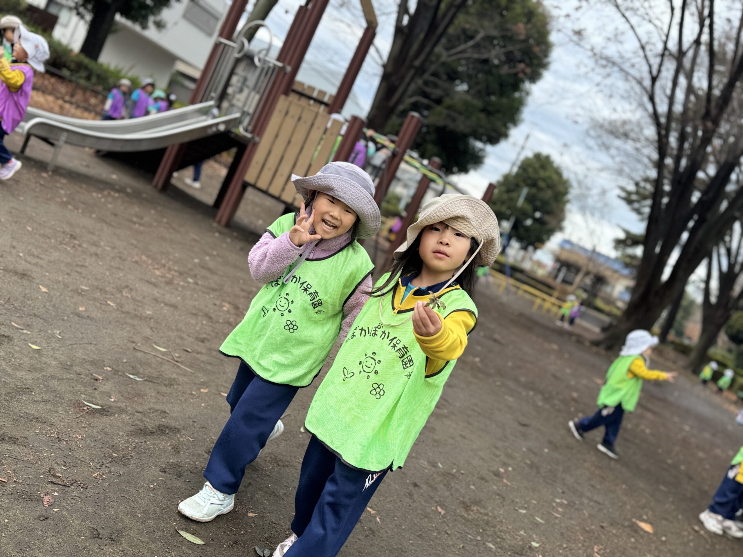 午前の活動は、子どもたちがいつも楽しみにしている「自然遊び」として、近くの公園に出かけました!園を出発すると、