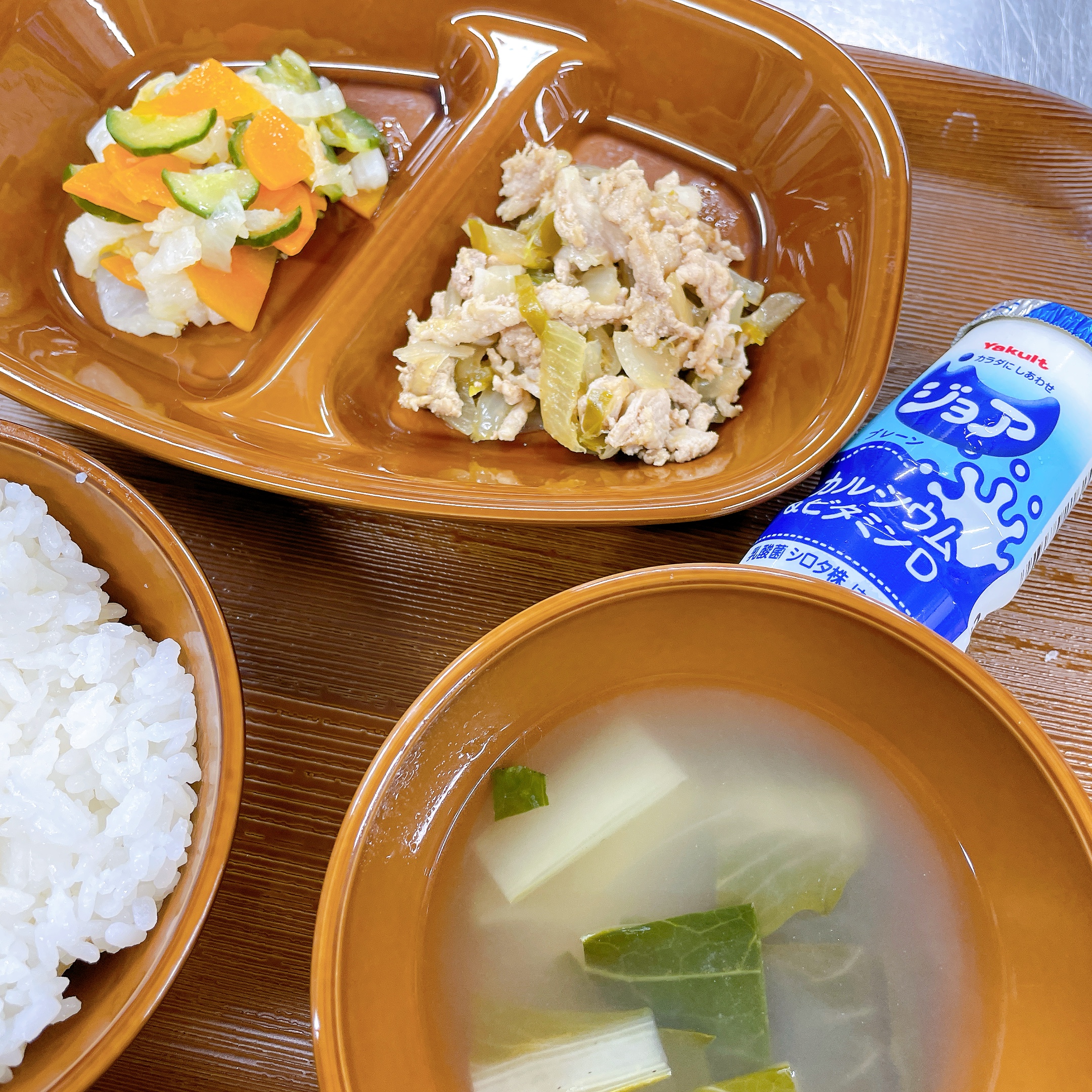 メニュー名:ご飯、マカロニスープ、豚肉のカレー風味炒め、白菜のマリネサラダ、ジョア