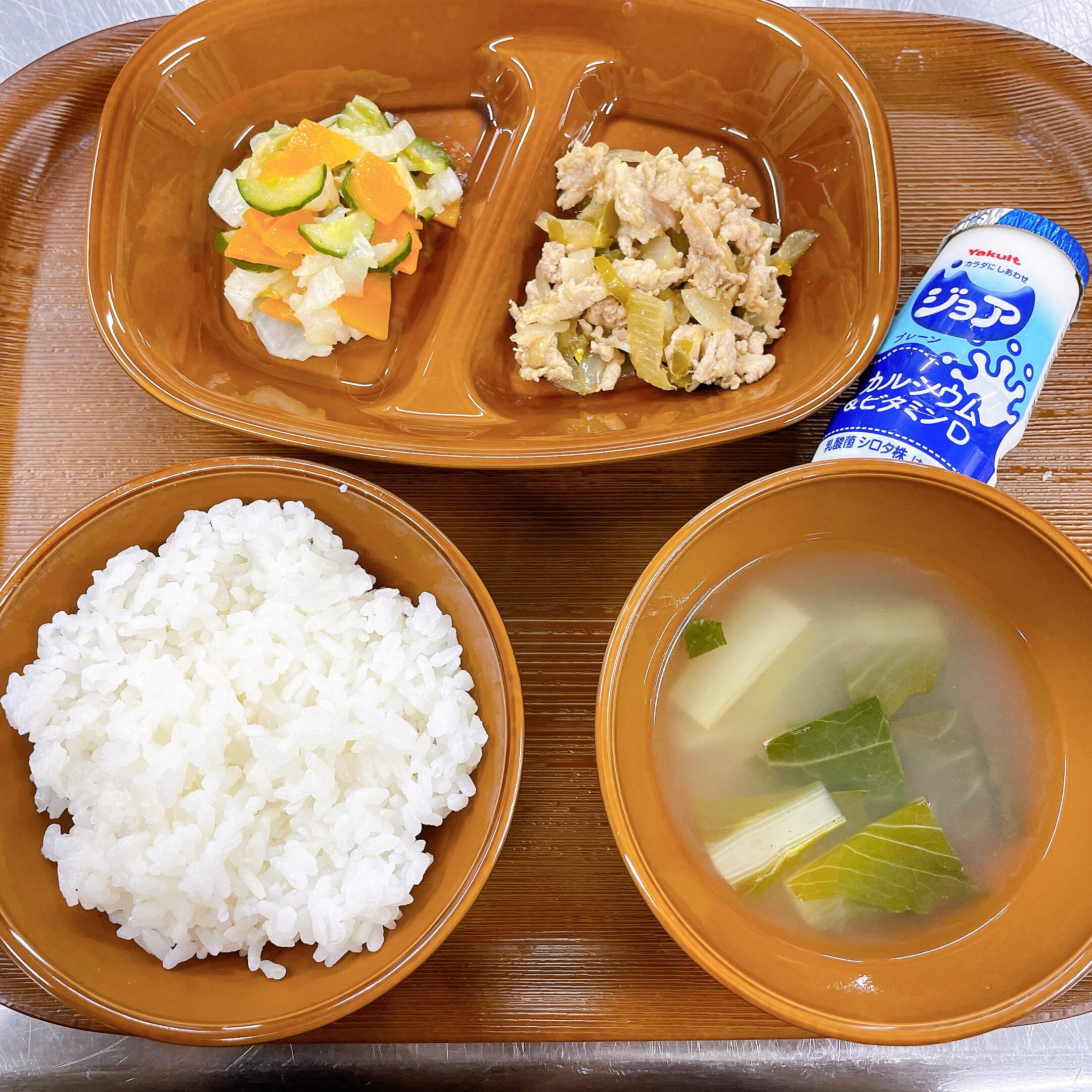メニュー名:ご飯、マカロニスープ、豚肉のカレー風味炒め、白菜のマリネサラダ、ジョア
