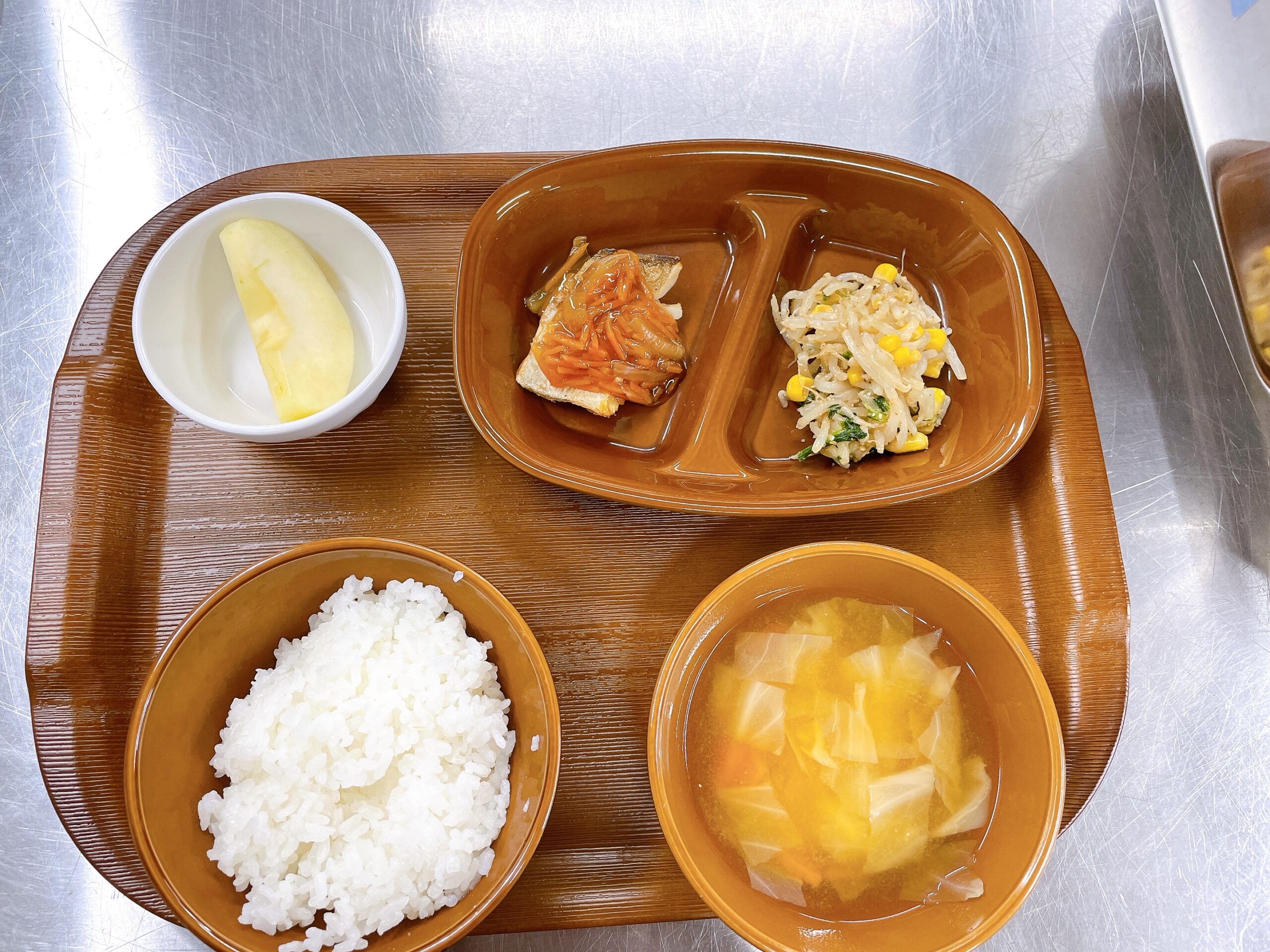 メニュー名:ご飯、みそ汁、たらの野菜あんかけ、もやしのごま和え、りんご