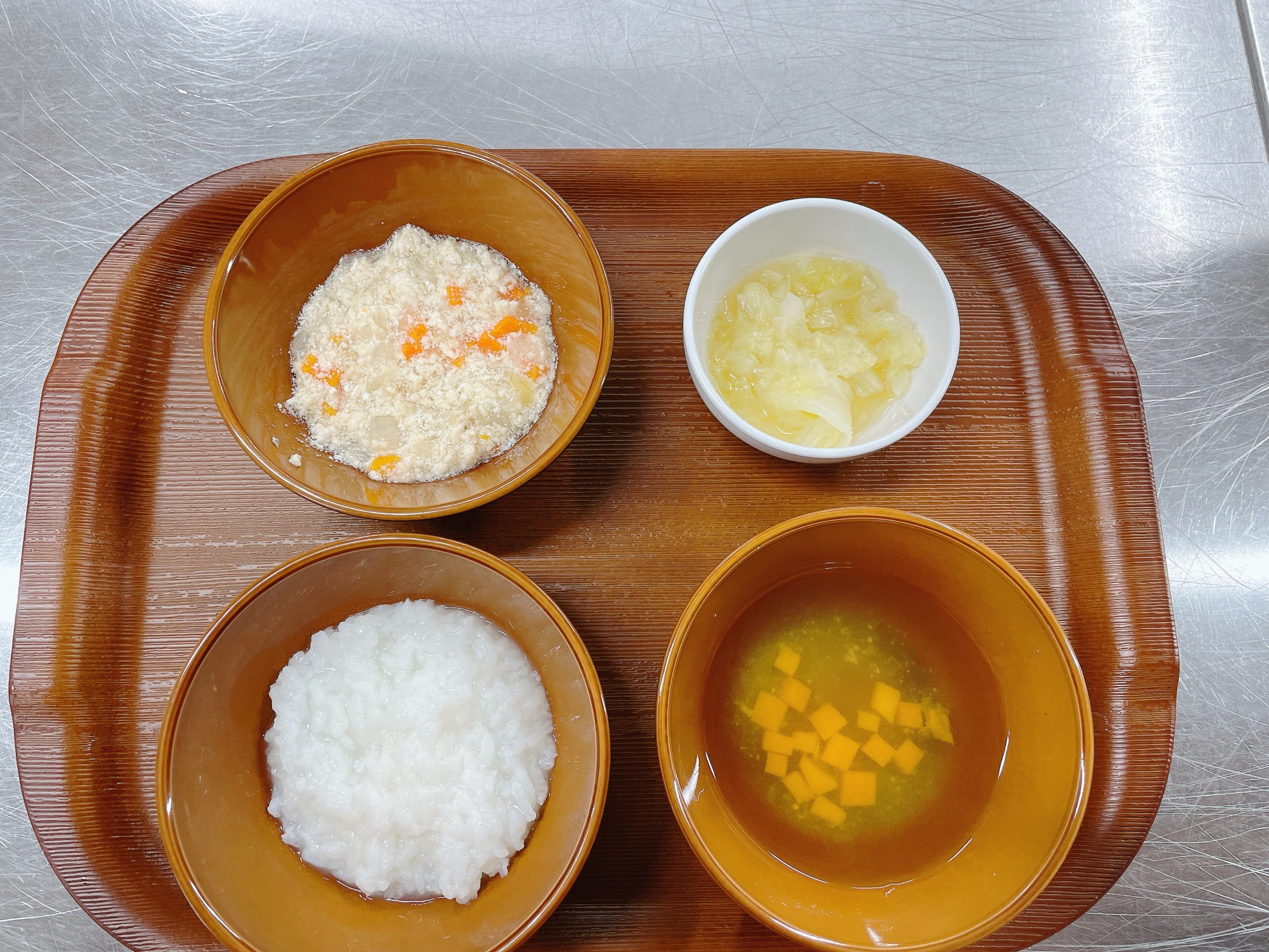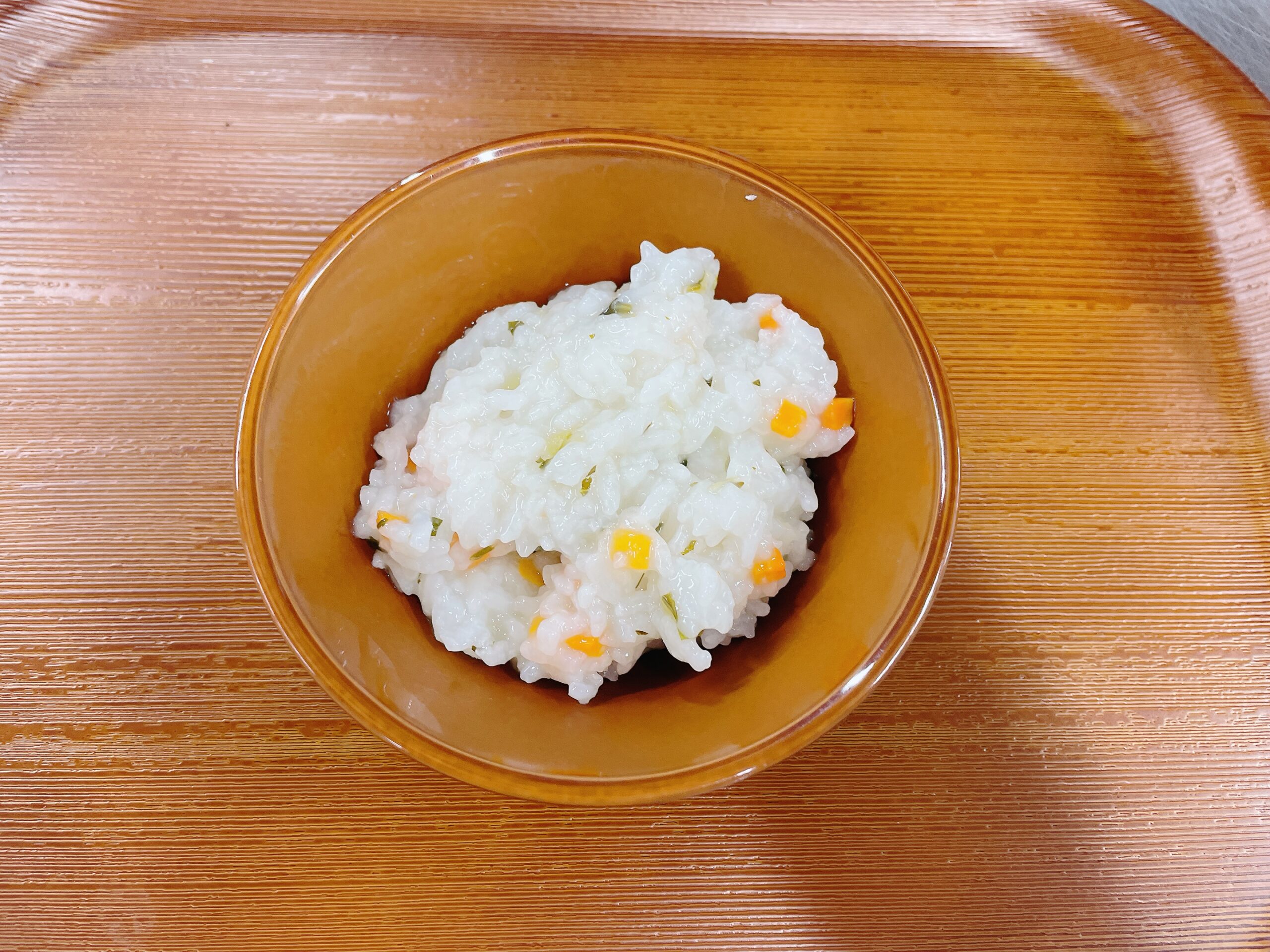 誤嚥防止のために、たっぷりのシロップで柔らかく煮たりんごを一口大にカット。程よい甘さととろける食感が、デザートとして大人気。「デザートたのしみ!」と目を輝かせ、笑顔で完食する姿が印象的でした。