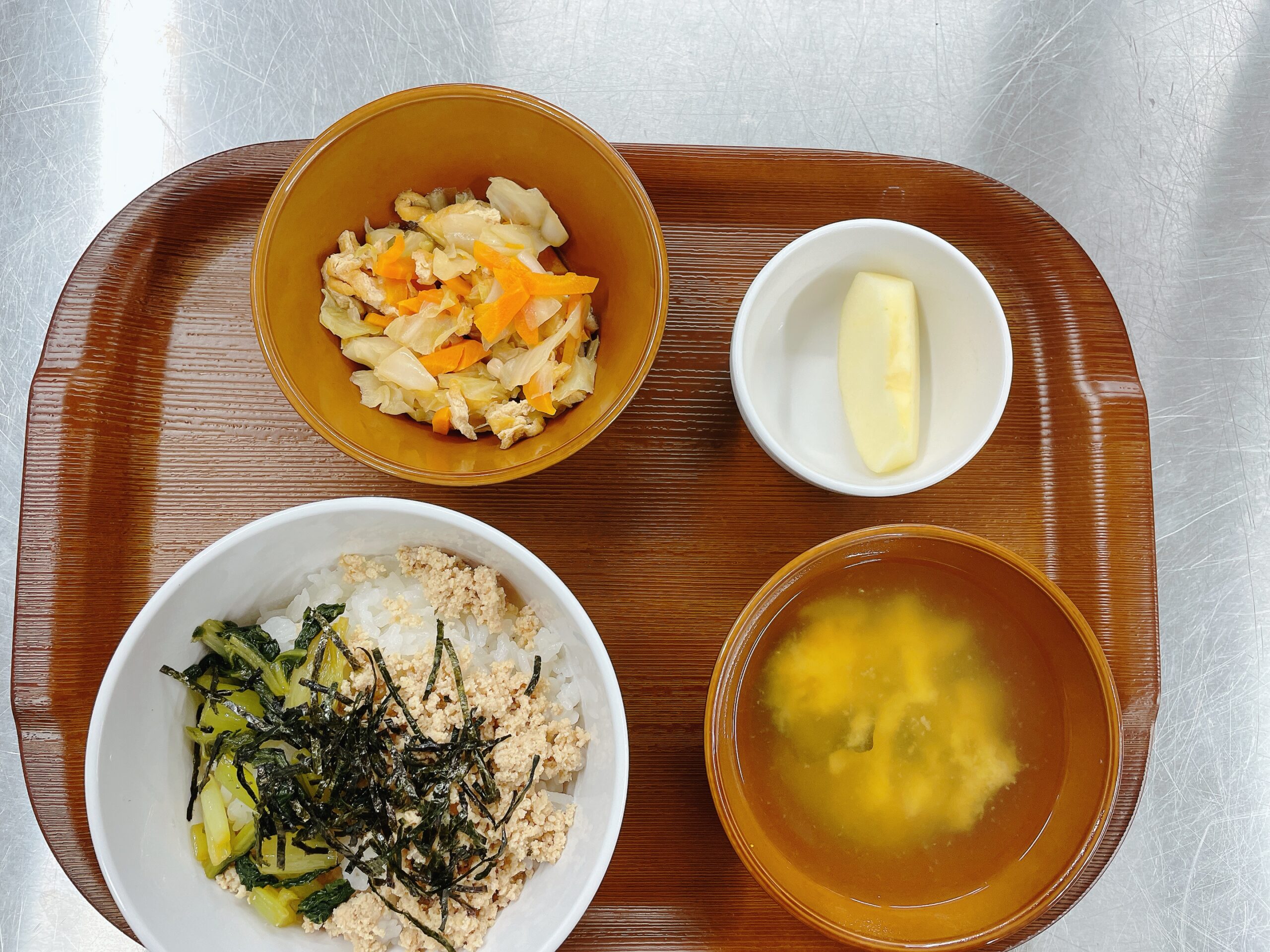 本日は鶏そぼろと小松菜の二色丼。小松菜は子どもでも食べやすいように小さくカットし、香りよく醤油で和えました。鶏そぼろは甘辛く仕上げ、二つの具材を並べるだけで彩り豊かな一皿に。子どもたちは「ご飯にそぼろと青菜を混ぜるとおいしい!」と夢中でほおばり、食育の観点からも自然に野菜を摂取できました。
