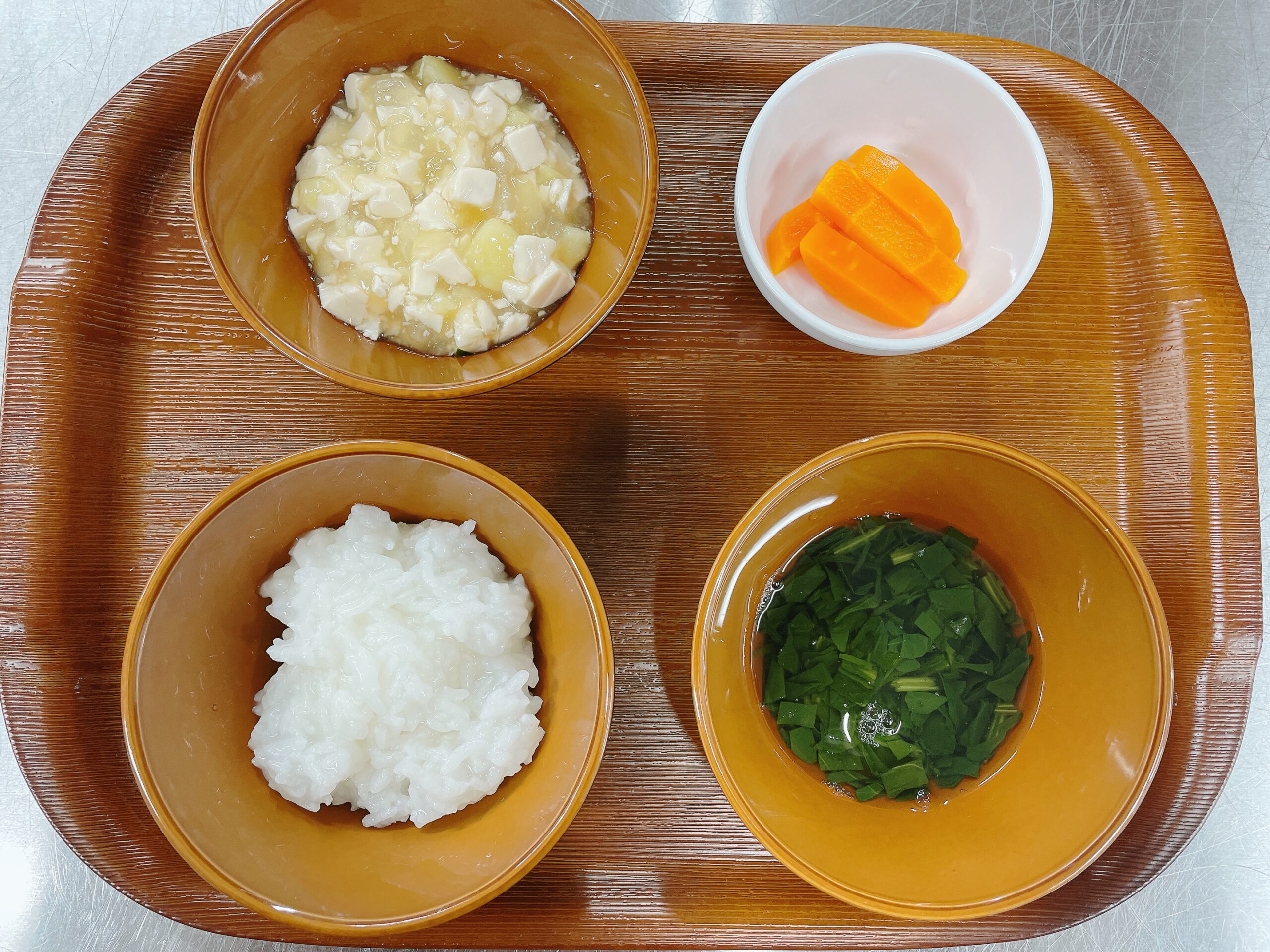 国産米をやさしく研いで炊き上げ、粒立ちを残しつつもふっくらとした食感に仕上げました。お茶碗を両手でしっかり持つ練習にもなり、「ご飯がおいしい!」と子どもたちから笑顔があふれています。