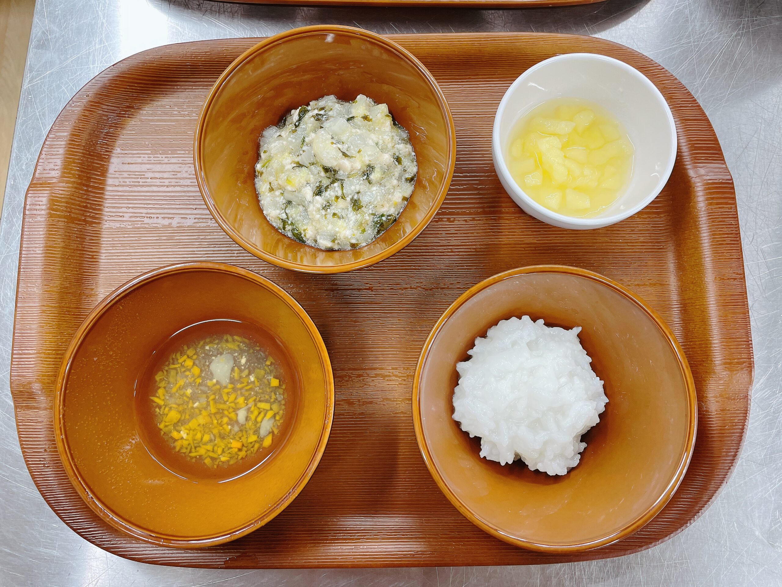 給食の最後はさっぱりとした青りんご味のゼリー。果汁をたっぷり使い、プルプルした食感が楽しいデザートです。自分でスプーンを使ってすくうことで、手先の巧緻性も自然に育まれます。