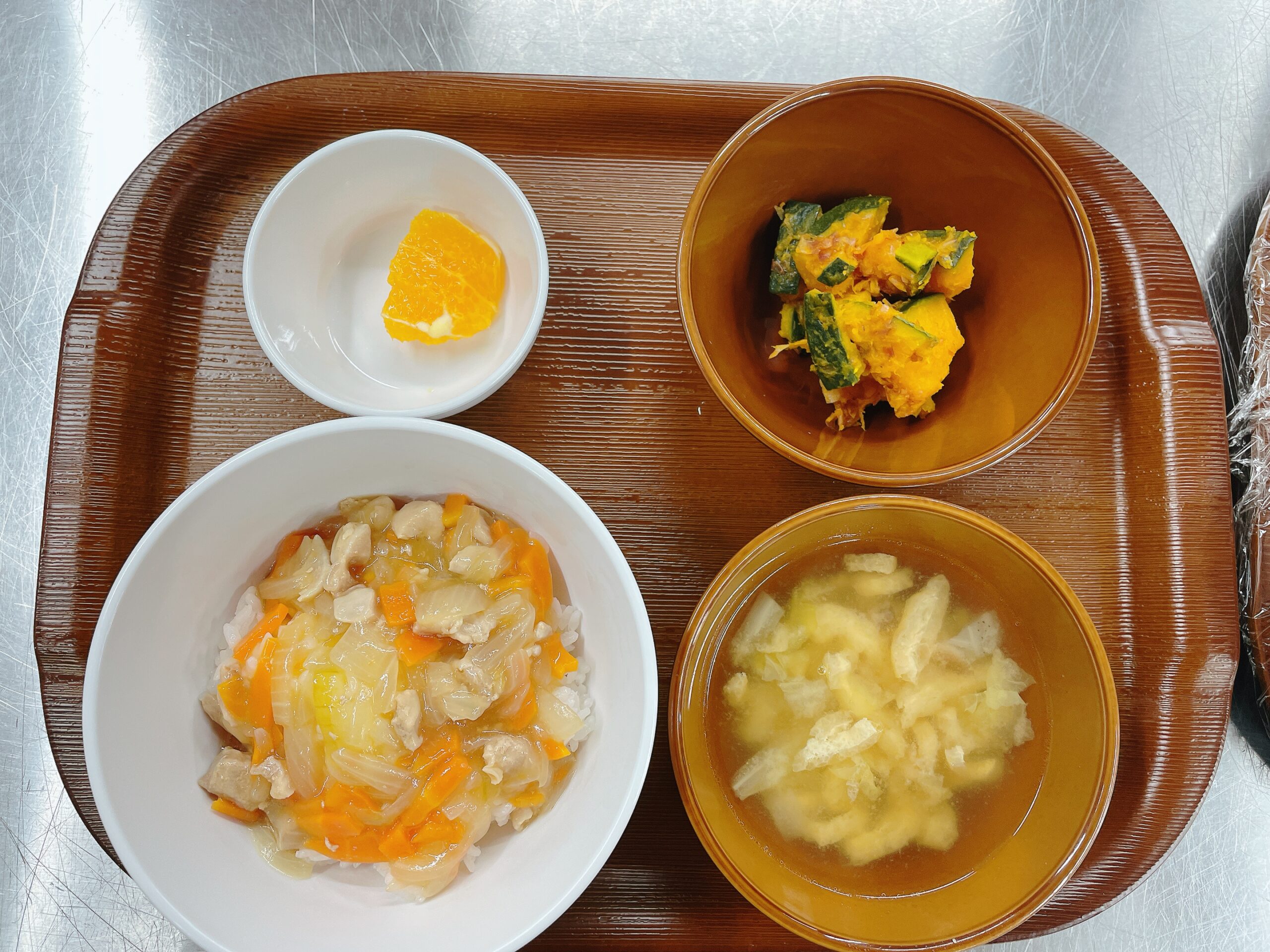 メニュー名:鶏肉と野菜の炒め煮丼、かぼちゃのおかか和え、オレンジ