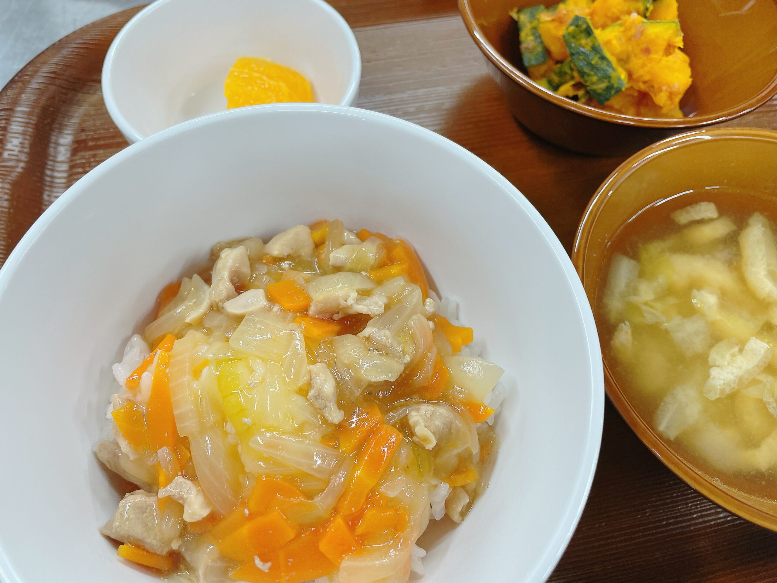鶏もも肉を弱火でじっくり炒め、玉ねぎと人参は電子レンジであらかじめ加熱して柔らかく下ごしらえ。だし醤油と調理酒でさっと煮絡めました。彩り豊かな丼はご飯が進みやすく、子どもたちは「おかわり!」と元気いっぱい。鶏肉の旨みと野菜の甘みが一体になった一杯です。