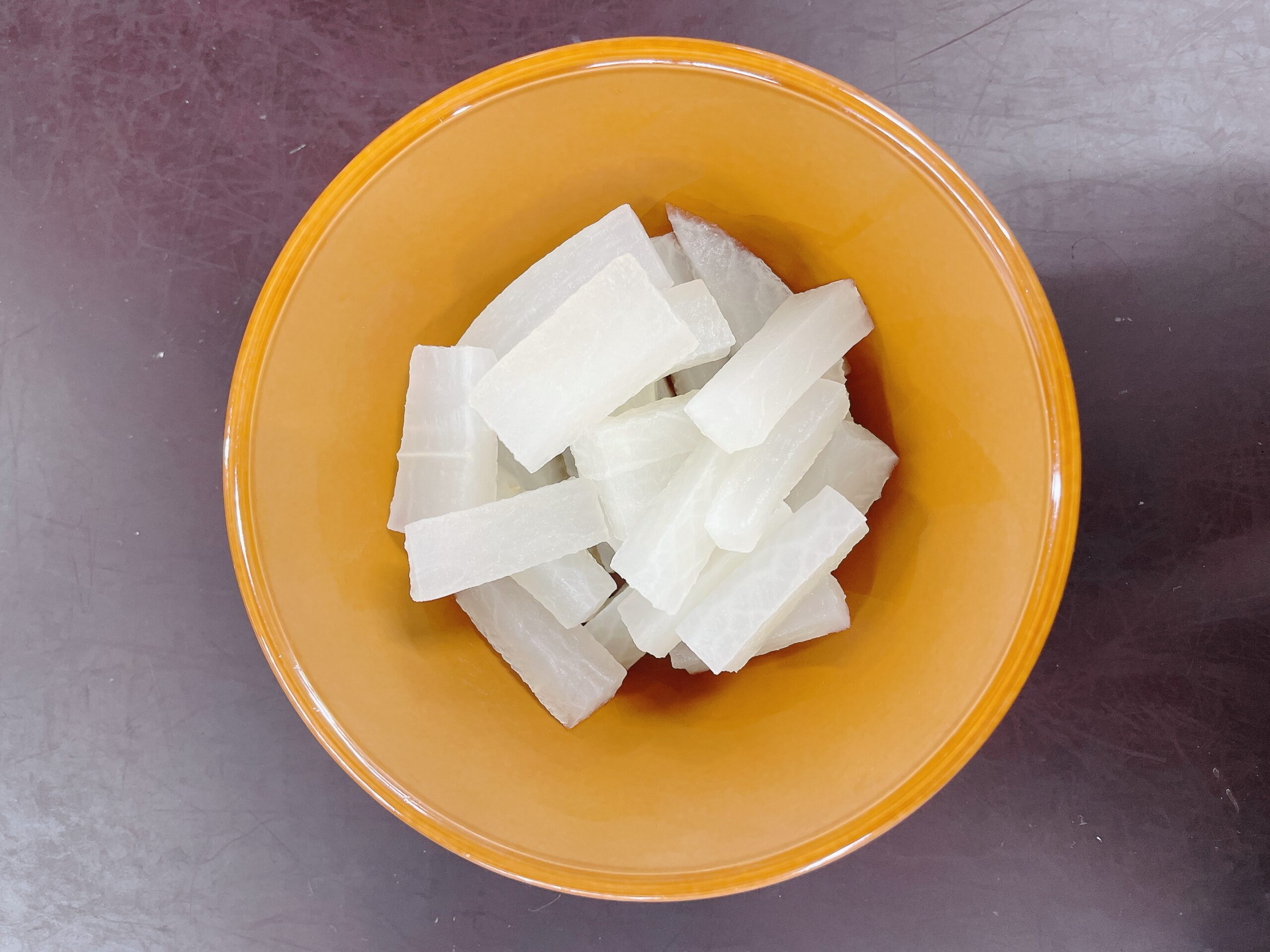 誤飲防止のために一口大の煮りんごに。冷めても硬くならないよう短時間でじっくり火を通しました。甘酸っぱく仕上がったりんごは、デザートにぴったり。