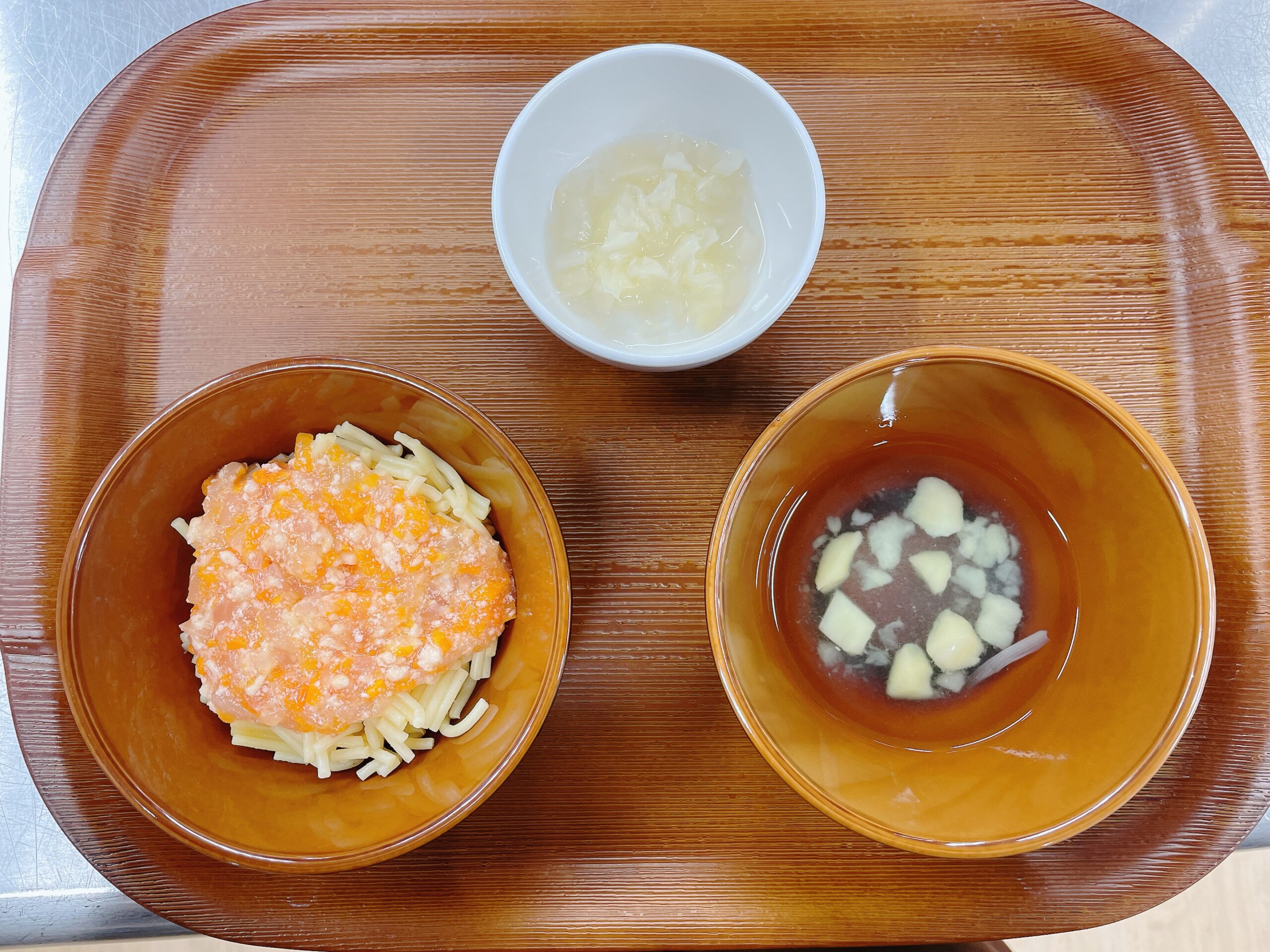 じゃが芋、コーンを加え塩分控えめに仕上げました。優しい甘みの温かいスープにほっとした表情で、「おかわり!」の声も。