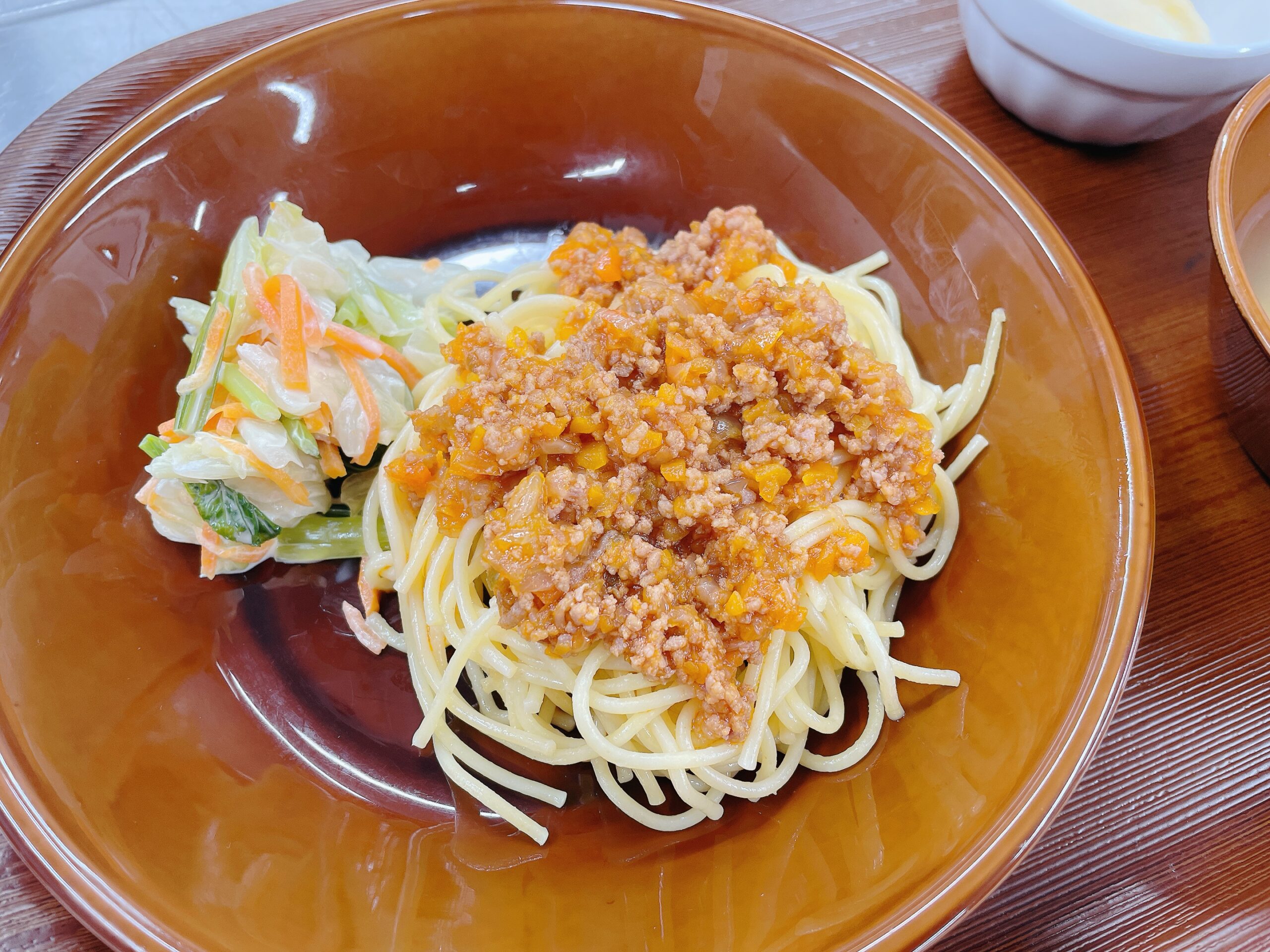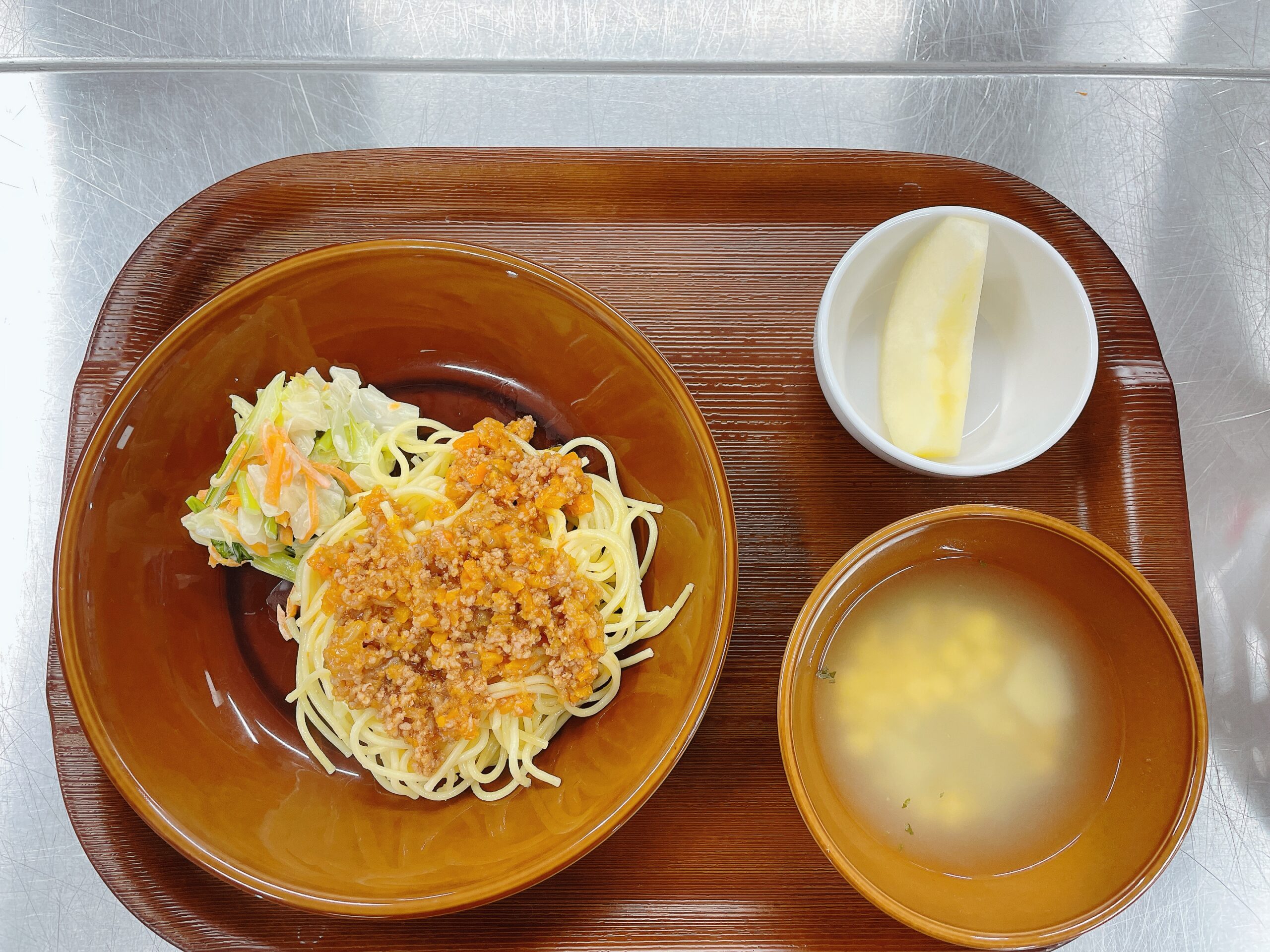 にんじん・たまねぎはみじん切りにしてしっかりと炒め、野菜の甘味をじっくり引き出した特製ソースです。トマトの酸味を穏やかにまとめ、豚ひき肉と合わせてじっくり煮込みました。子どもたちはフォークを上手に使い、くるくるとスパゲティを巻き取りながら「モグモグおいしい!」と笑顔いっぱいでした。