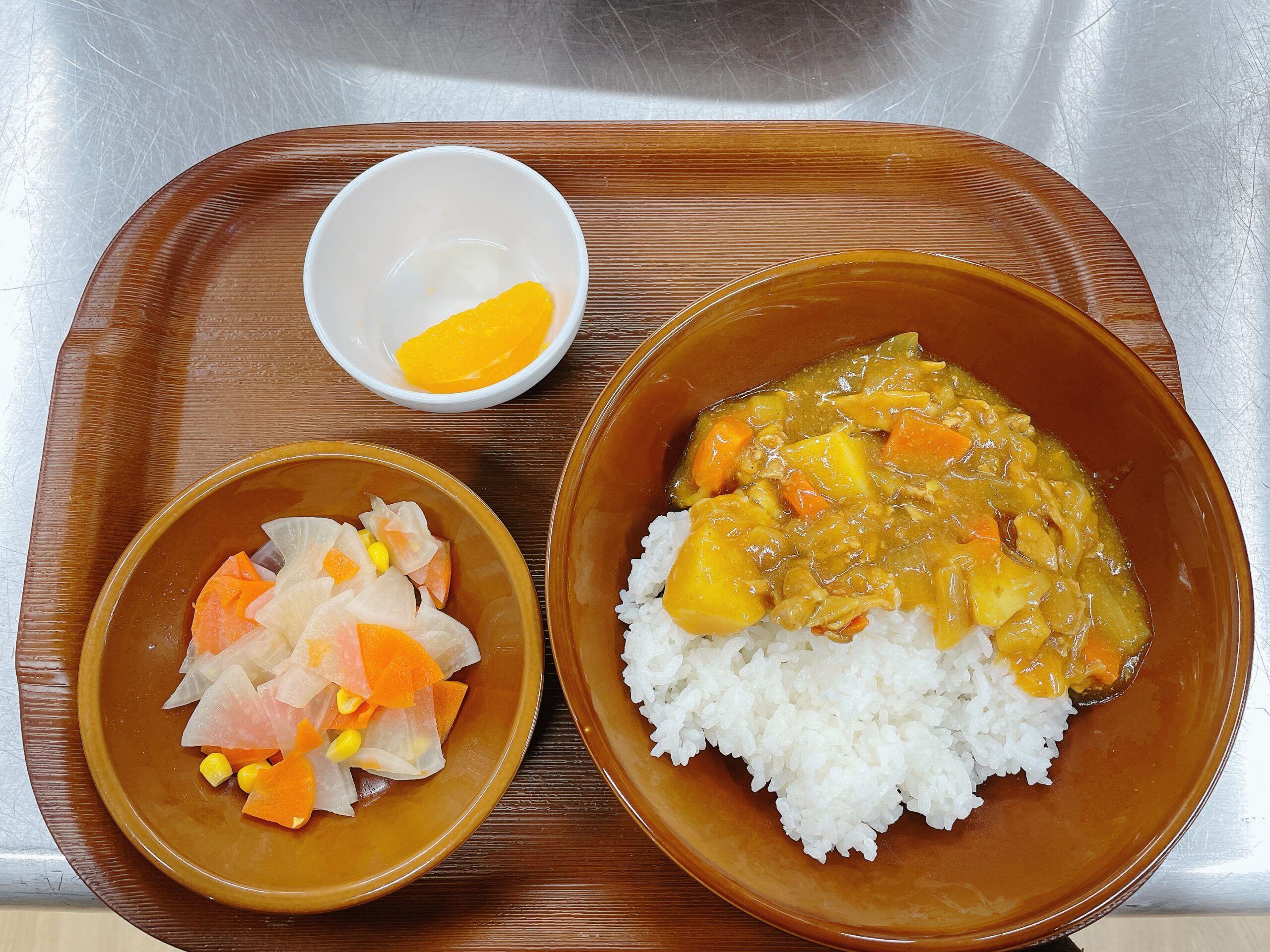 メニュー名:ポークカレー、大根サラダ、オレンジ