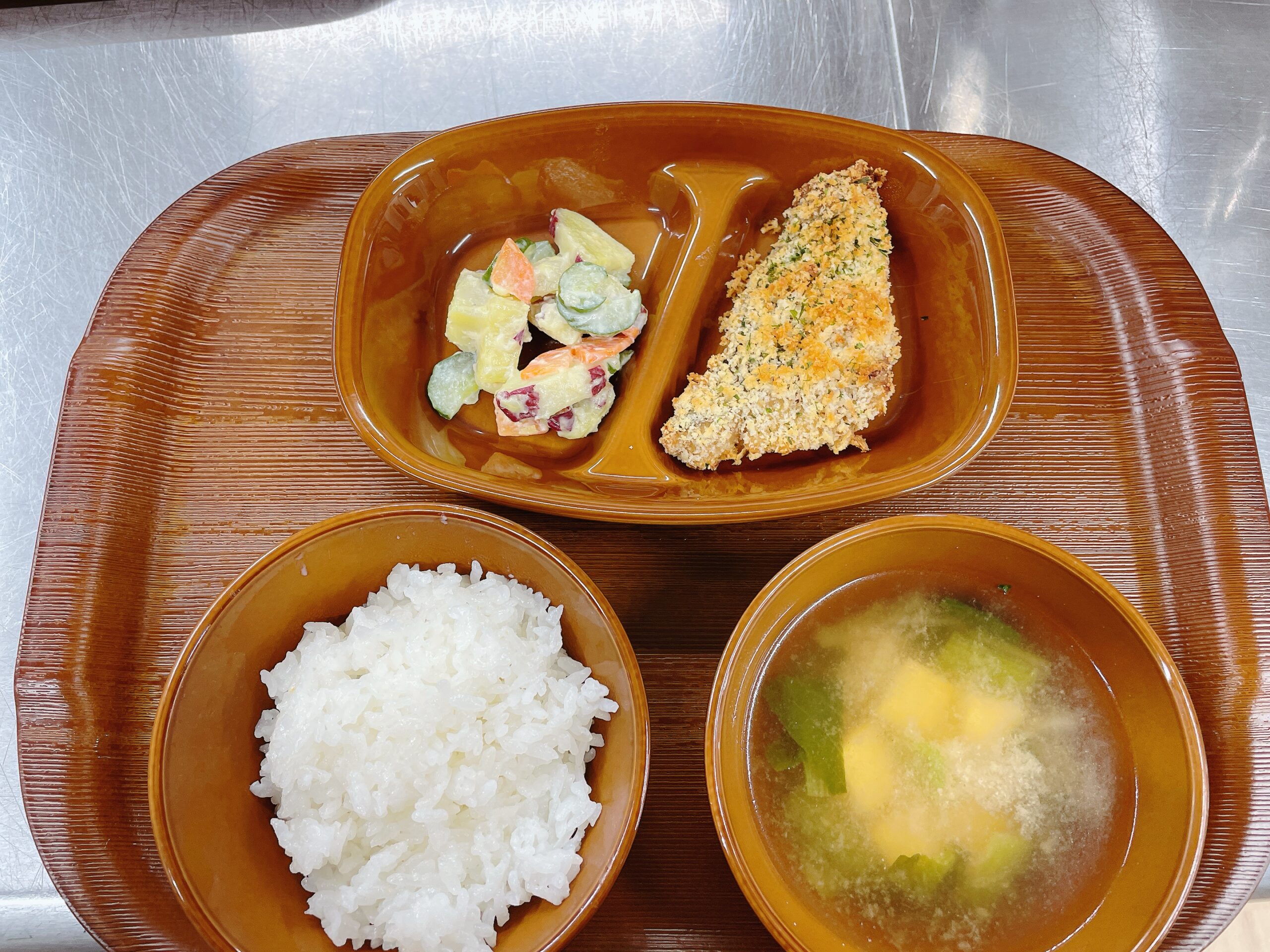 メニュー名:ご飯、味噌汁、たらの和風パン粉焼き、さつま芋サラダ、ジョア