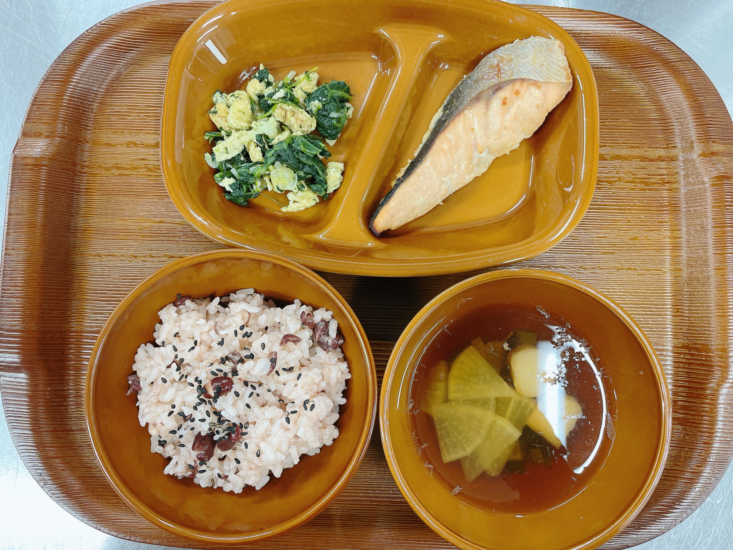 今日は七五三のお祝メニューとして赤飯をご用意。小豆をじっくり煮て色を引き出し、もち米と合わせて炊き上げました。ふっくらとしたもち米に赤豆のほっくり感がアクセントに。普段あまり見かけないお赤飯に、子どもたちは「お豆がいっぱい!」「なんで赤いの?」と興味津々。ひと粒ずつ丁寧にほおばり、新しい味わいを楽しんでくれました。