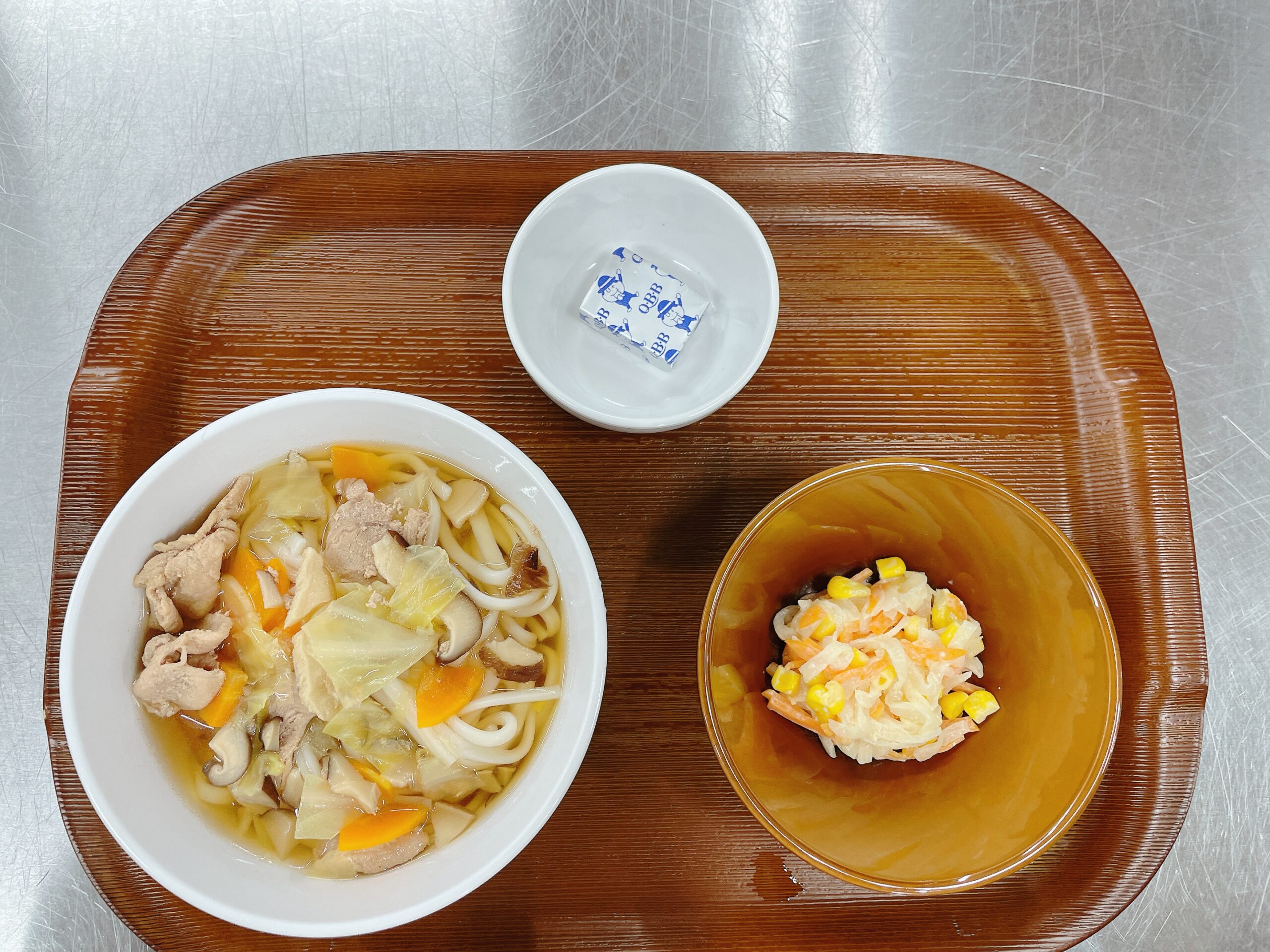 「うどん、おいしい!」とお椀をかかえ大喜びの子どもたち。やわらかく煮込んだ野菜がとろりと優しい味わいで、麺をすすりながら笑顔があふれました。大根の味噌マヨ和えは「味噌マヨっておいしいね」と言いながら完食する姿が多く、「おかわりある?」とお代わりの列ができるほど。