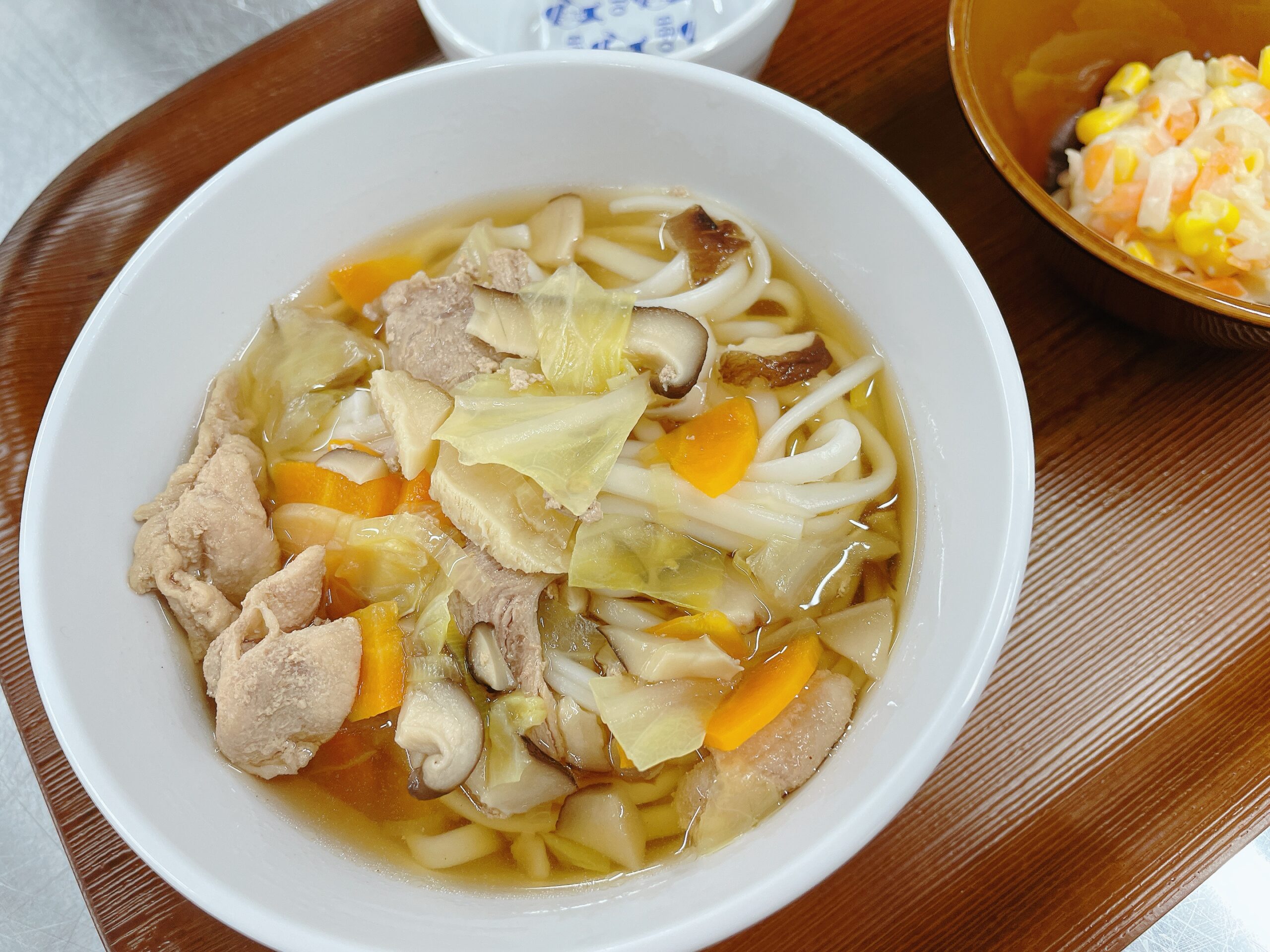 肉野菜うどんに使う野菜は、人参・キャベツ・ねぎをくたくたになるまでじっくり煮込みました。冷めてもやわらかく、とろみのあるお出汁が麺によく絡んで、子どもでも食べやすい仕上がりに。うどんは安心安全を第一に調理しています。