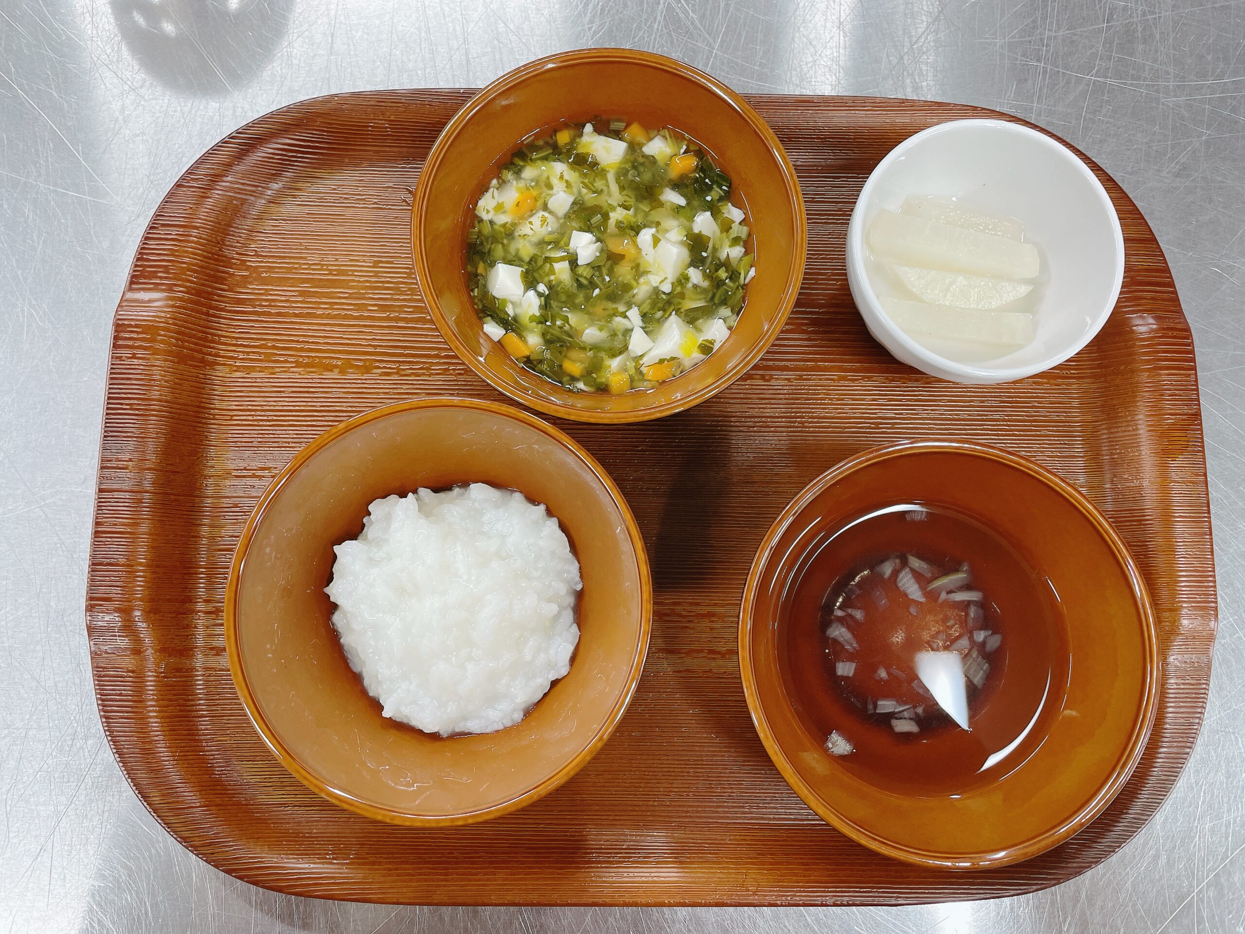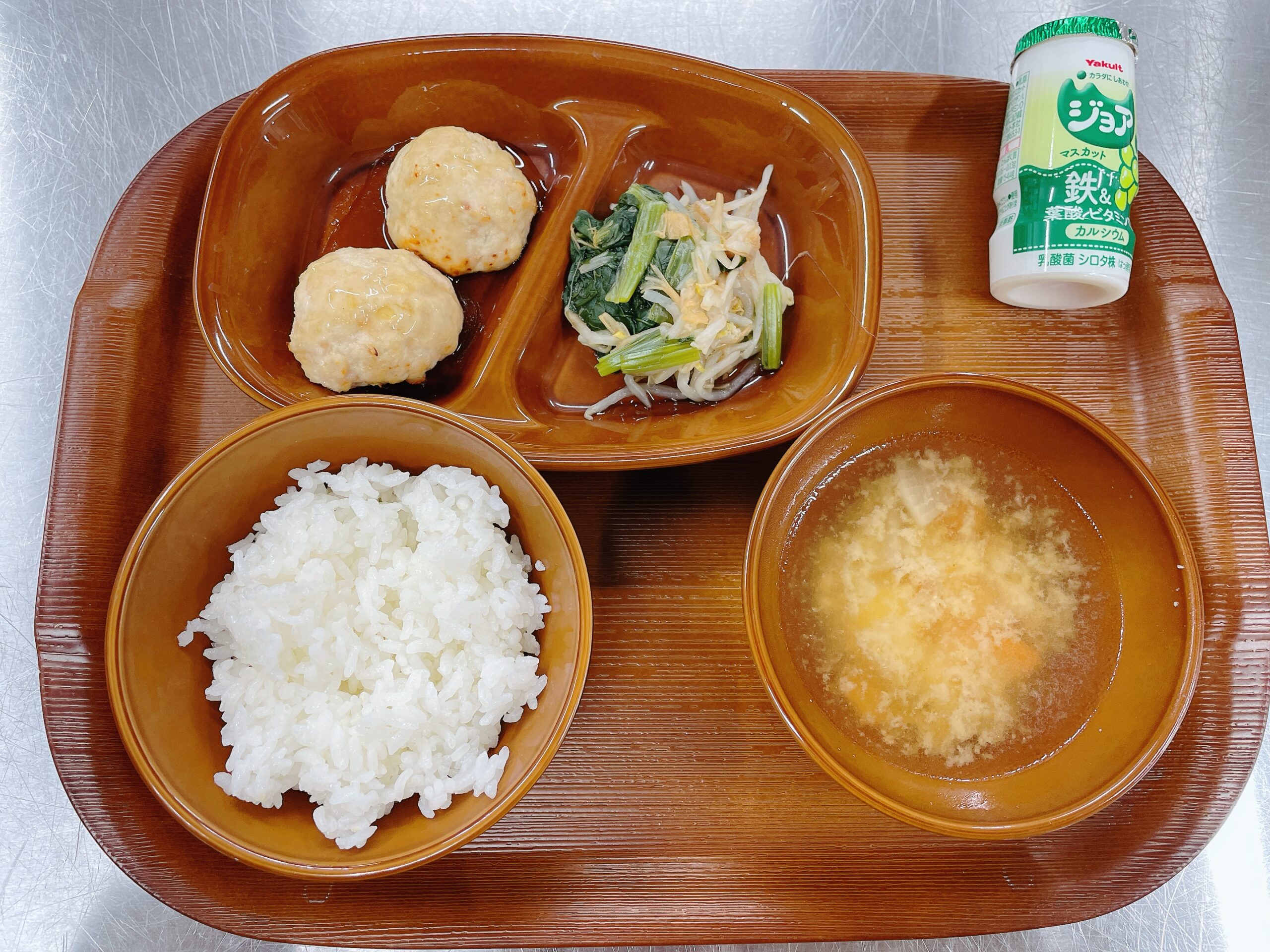 メニュー名:ご飯、根菜の味噌汁、鶏肉団子、なめたけ和え、ジョア