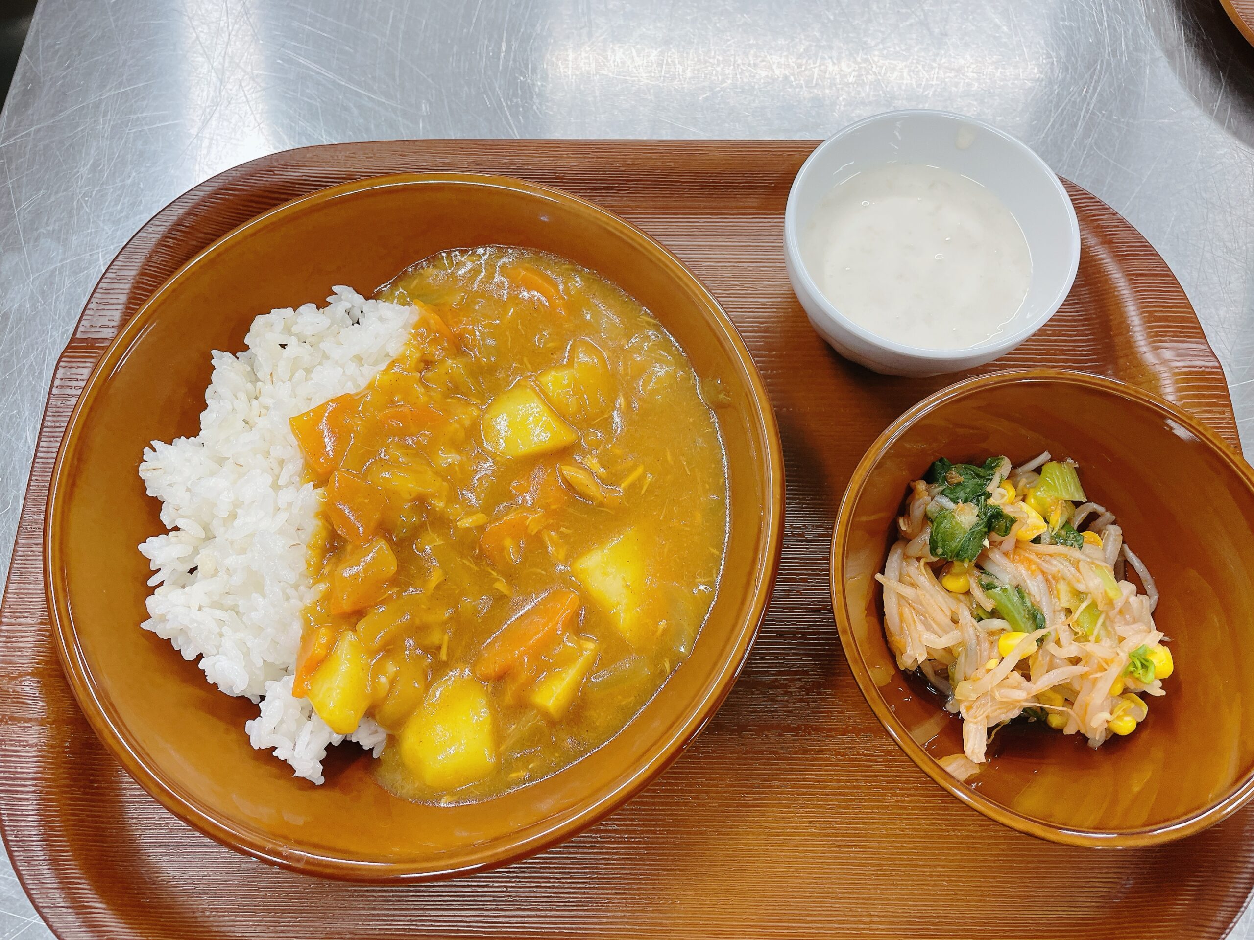 「カレーは大人気!」と先生からの報告があった通り、子どもたちは麦ごはんにたっぷりかけておかわり続出。野菜の甘みが感じられるマイルドな味に、「もっと食べたい!」と元気いっぱい。トマトドレッシングサラダにも挑戦し、「お野菜も頑張って一口食べた」とニコニコで完食する姿が多く見られました。最後のジャムヨーグルトはデザート感覚で、「甘くておいしい!」とあっという間に食べきり、大満足のランチとなりました。