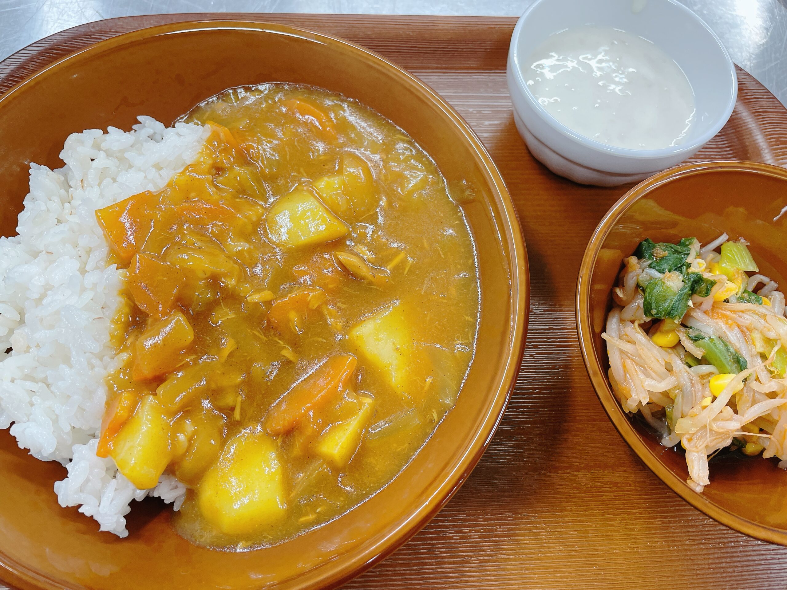 「カレーは大人気!」と先生からの報告があった通り、子どもたちは麦ごはんにたっぷりかけておかわり続出。野菜の甘みが感じられるマイルドな味に、「もっと食べたい!」と元気いっぱい。トマトドレッシングサラダにも挑戦し、「お野菜も頑張って一口食べた」とニコニコで完食する姿が多く見られました。最後のジャムヨーグルトはデザート感覚で、「甘くておいしい!」とあっという間に食べきり、大満足のランチとなりました。